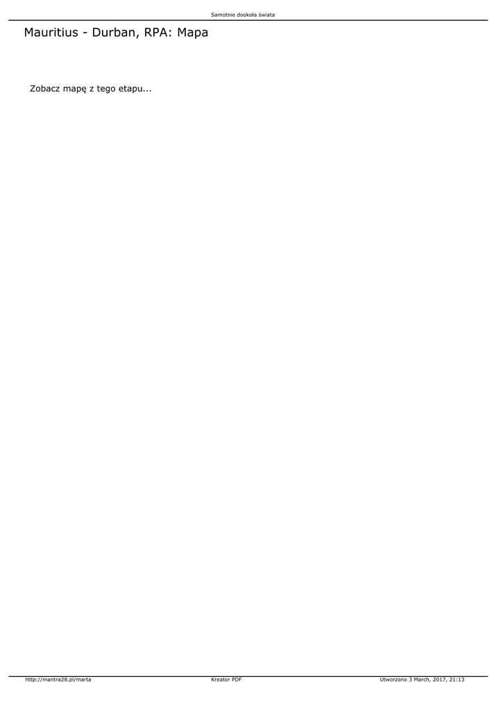 Samotnie dookoła świata Mauritius - Durban, RPA: Mapa Zobacz mapę z tego etapu... http://mantra28.pl/marta Kreator PDF Utworzono 3 March, 2017, 21:13