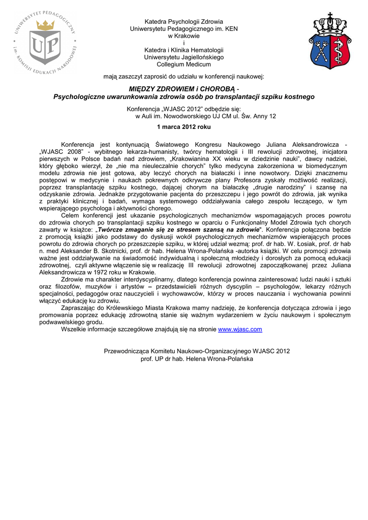 Katedra Psychologii Zdrowia Uniwersytetu Pedagogicznego im. KEN w Krakowie i Katedra i Klinika Hematologii Uniwersytetu Jagiellońskiego Collegium Medicum mają zaszczyt zaprosić do udziału w konferencji naukowej: MIĘDZY ZDROWIEM i CHOROBĄ Psychologiczne uwarunkowania zdrowia osób po transplantacji szpiku kostnego Konferencja „WJASC 2012” odbędzie się: w Auli im. Nowodworskiego UJ CM ul. Św. Anny 12 1 marca 2012 roku Konferencja jest kontynuacją Światowego Kongresu Naukowego Juliana Aleksandrowicza „WJASC 2008” - wybitnego lekarza-humanisty, twórcy hematologii i III rewolucji zdrowotnej, inicjatora pierwszych w Polsce badań nad zdrowiem, „Krakowianina XX wieku w dziedzinie nauki”, dawcy nadziei, który głęboko wierzył, Ŝe „nie ma nieuleczalnie chorych” tylko medycyna zakorzeniona w biomedycznym modelu zdrowia nie jest gotowa, aby leczyć chorych na białaczki i inne nowotwory. Dzięki znacznemu postępowi w medycynie i naukach pokrewnych odkrywcze plany Profesora zyskały moŜliwość realizacji, poprzez transplantację szpiku kostnego, dającej chorym na białaczkę „drugie narodziny” i szansę na odzyskanie zdrowia. JednakŜe przygotowanie pacjenta do przeszczepu i jego powrót do zdrowia, jak wynika z praktyki klinicznej i badań, wymaga systemowego oddziaływania całego zespołu leczącego, w tym wspierającego psychologa i aktywności chorego. Celem konferencji jest ukazanie psychologicznych mechanizmów wspomagających proces powrotu do zdrowia chorych po transplantacji szpiku kostnego w oparciu o Funkcjonalny Model Zdrowia tych chorych zawarty w ksiąŜce: „Twórcze zmaganie się ze stresem szansą na zdrowie". Konferencja połączona będzie z promocją ksiąŜki jako podstawy do dyskusji wokół psychologicznych mechanizmów wspierających proces powrotu do zdrowia chorych po przeszczepie szpiku, w której udział wezmą: prof. dr hab. W. Łosiak, prof. dr hab n. med Aleksander B. Skotnicki, prof. dr hab. Helena Wrona-Polańska -autorka ksiąŜki. W celu promocji zdrowia waŜne jest oddziaływanie na świadomość indywidualną i społeczną młodzieŜy i dorosłych za pomocą edukacji zdrowotnej, czyli aktywne włączenie się w realizację III rewolucji zdrowotnej zapoczątkowanej przez Juliana Aleksandrowicza w 1972 roku w Krakowie. Zdrowie ma charakter interdyscyplinarny, dlatego konferencja powinna zainteresować ludzi nauki i sztuki oraz filozofów, muzyków i artystów – przedstawicieli róŜnych dyscyplin – psychologów, lekarzy róŜnych specjalności, pedagogów oraz nauczycieli i wychowawców, którzy w proces nauczania i wychowania powinni włączyć edukację ku zdrowiu. Zapraszając do Królewskiego Miasta Krakowa mamy nadzieję, Ŝe konferencja dotycząca zdrowia i jego promowania poprzez edukację zdrowotną stanie się waŜnym wydarzeniem w Ŝyciu naukowym i społecznym podwawelskiego grodu. Wszelkie informacje szczegółowe znajdują się na stronie www.wjasc.com Przewodnicząca Komitetu Naukowo-Organizacyjnego WJASC 2012 prof. UP dr hab. Helena Wrona-Polańska