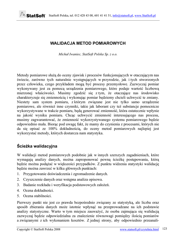 StatSoft Polska, tel. 012 428 43 00, 601 41 41 51, [email protected], www.StatSoft.pl WALIDACJA METOD POMIAROWYCH Michał Iwaniec, StatSoft Polska Sp. z o.o. Metody pomiarowe służą do oceny zjawisk i procesów funkcjonujących w otaczającym nas świecie, zarówno tych naturalnie występujących w przyrodzie, jak i tych stworzonych przez człowieka, czego przykładem mogą być procesy przemysłowe. Zazwyczaj pomiar wykonywany jest za pomocą urządzenia pomiarowego, które podaje wartość liczbową mierzonej właściwości. Musimy zgodzić się z tym, że otaczające nas środowisko charakteryzuje się zmiennością i wykonując pomiar będziemy chcieli uchwycić te zmiany. Niestety sam system pomiaru, z którym związane jest nie tylko samo urządzenie pomiarowe, ale również inne czynniki, takie jak laborant czy też substancje pomocnicze wykorzystywane w trakcie pomiaru, będą generować zmienność, która ostatecznie wpłynie na jakość wyniku pomiaru. Chcąc uchwycić zmienność interesującego nas procesu, musimy zagwarantować, że zmienność wykorzystywanego systemu pomiarowego będzie odpowiednio mała. Biorąc pod uwagę fakt, że mamy do czynienia z procesami, których nie da się opisać ze 100% dokładnością, do oceny metod pomiarowych najlepiej jest wykorzystać metody, których dostarcza nam statystyka. Ścieżka walidacyjna W walidacji metod pomiarowych podobnie jak w innych szerszych zagadnieniach, które wymagają analizy danych, można zaproponować pewną ścieżkę postępowania, którą będzie można podążać w większości przypadków. Z punktu widzenia statystyki walidację będzie można zawrzeć w kilku głównych punktach: 1. Przygotowanie doświadczenia i zgromadzenie danych. 2. Czyszczenie danych oraz wstępna analiza opisowa. 3. Badanie rozkładu i weryfikacja podstawowych założeń. 4. Ocena dokładności. 5. Ocena stabilności. Pierwszy punkt nie jest co prawda bezpośrednio związany ze statystyką, ale liczba oraz sposób zbierania danych może istotnie wpłynąć na przeprowadzane na ich podstawie analizy statystyczne. Warto w tym miejscu zauważyć, że osoba zajmująca się walidacją zazwyczaj będzie odpowiedzialna za znalezienie równowagi pomiędzy ilością pomiarów a związanymi z ich wykonaniem kosztów. Z jednej strony, aby odpowiednio przeanaliCopyright © StatSoft Polska 2008 www.statsoft.pl/czytelnia.html 123 StatSoft Polska, tel. 012 428 43 00, 601 41 41 51, [email protected], www.StatSoft.pl zować system pomiarowy, należy zebrać odpowiednio dużą liczbę pomiarów. Z drugiej strony pomiary mogą być bardzo kosztowne i z ekonomicznego punktu widzenia, im mniej ich wykonamy, tym lepiej. Czyszczenie danych i analiza opisowa Pierwszym krokiem po zebraniu danych powinna być wstępna analiza polegająca na oczyszczeniu zbioru danych z wartości odstających, spowodowanych np. błędami grubymi. Jeżeli przygotowany zbiór danych będzie zawierał wartości odstające, wtedy analizy, które będą wykonywane w następnej kolejności mogą dać błędne wyniki. Co więcej, jeżeli zbiór danych nie będzie spójny, wtedy prawdopodobnie nie będziemy w stanie na jego podstawie potwierdzić, że system pomiarowy jest odpowiedni dla danego zastosowania. Do wykrywania wartości odstających zostało zaproponowanych wiele metod i użycie jednej z nich zależy od badacza lub od wytycznych dla walidacji konkretnej metody. Często stosowanymi metodami są: ♦ test Grubbsa, ♦ test trzech sigma (normalny), ♦ Tukeya. Niestety wykrywanie wartości odstających jest związane z iteracyjnym przeglądaniem zbioru danych, co powoduje, że cała procedura wymaga wykonania wielu obliczeń. Zauważmy, że po wykryciu wartości odstającej, np. przy użyciu testu Grubbsa, aby sprawdzić, czy kolejna wartość nie jest odstająca, powinniśmy odrzucić wykrytą wartość i przeprowadzić całą procedurę jeszcze raz na pomniejszonym o jedną wartość zbiorze danych. Podczas wstępnej analizy danych pomocne mogą być również proste statystyki opisujące zbiór danych oraz wykresy, takie jak histogram. Przykładowo na histogramie można już wstępnie ocenić rozkład zebranych danych i wykryć wartości „mocno” odstające. Rozważmy przykładowy zbiór danych: Po przeanalizowaniu zbioru danych za pomocą testu Grubbsa okazało się, że ostatnia wartość została uznana za odstającą. Jeżeli przyjrzymy się histogramowi utworzonemu dla tych danych, pojedyncza odstająca wartość jest również wyraźnie widoczna: 124 www.statsoft.pl/czytelnia.html Copyright © StatSoft Polska 2008 StatSoft Polska, tel. 012 428 43 00, 601 41 41 51, [email protected], www.StatSoft.pl Histogram Pomiar 7 6 Liczba obs. 5 4 3 2 1 0 21,5 22,0 22,5 23,0 23,5 24,0 24,5 25,0 25,5 Pomiar Po wykryciu wartości odstających należy zbadać, dlaczego takie wartości się pojawiły. Ich przyczyną mogą być błędy w funkcjonowaniu systemu pomiarowego albo w procedurach (np. błędy podczas przepisywania danych). Testy statystyczne w poprawności, precyzji i badaniu założeń W walidacji wnioskowanie, o ile jest to tylko możliwe, powinno być poparte odpowiednim testem statystycznym. Np. można próbować oceniać wstępnie rozkład zebranych danych w oparciu o histogram, ale zwłaszcza przy małej ilości danych, z czym często będziemy borykać się w badaniach laboratoryjnych, niezbędny jest odpowiedni test normalności, np. test Shapiro-Wilka. W analizie danych przechodzimy teraz od statystyk opisowych, które tylko podsumowują dane zebrane w tabeli, do wnioskowania statystycznego. Do tej pory podawaliśmy, że średnia z pomiarów wynosi 22,03, ale nie wyciągaliśmy na tej podstawie żadnych wniosków. Z punktu widzenia walidacji ważne będzie, aby zweryfikować, czy wartość ta w sposób istotny będzie różnić się od wartości wzorca, który został użyty w doświadczeniu (przyjmijmy, że wartość wzorca wynosi 22). Wynika z tego, że r