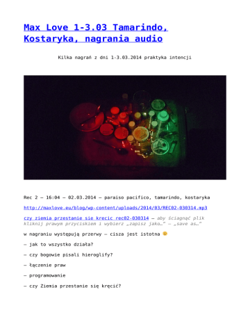 Max Love 1-3.03 Tamarindo, Kostaryka, nagrania audio Kilka nagrań z dni 1-3.03.2014 praktyka intencji Rec 2 – 16:04 – 02.03.2014 – paraiso pacifico, tamarindo, kostaryka http://maxlove.eu/blog/wp-content/uploads/2014/03/REC02-030314.mp3 czy ziemia przestanie sie krecic rec02-030314 – aby ściagnąć plik kliknij prawym przyciskiem i wybierz „zapisz jako…” – „save as…” w nagraniu występują przerwy – cisza jest istotna – jak to wszystko działa? – czy bogowie pisali hieroglify? – łączenie praw – programowanie – czy Ziemia przestanie się kręcić? rec 5 – 15:49 – 2-3.03.2014 tamarindo, kostaryka http://maxlove.eu/blog/wp-content/uploads/2014/03/REC05-030314.mp3 zapalić zioło REC05 030314 – aby ściagnąć plik kliknij prawym przyciskiem i wybierz „zapisz jako…” – „save as…” – wystarczy zapalić sobie zioło – palenie kadzidełka przerwa i ok 10 minuty dalej – jakie klucze ma w sobie ciało rec 7 – 24:53 – 3.03.2014 tamarindo, kostaryka (są przerwy w nagraniu) http://maxlove.eu/blog/wp-content/uploads/2014/03/REC07-030314.mp3 joga na łózku REC07 030314 – aby ściagnąć plik kliknij prawym przyciskiem i wybierz „zapisz jako…” – „save as…” – jakie rzeczy chcą ludzie – w jakie rzeczy ludzie chcą włożyć swoją energię – zmiana w rozluźnieniu – co ludzie mówią a co robią – reality show w vilcabambie – co kupię w Panamie – praktyka z oczami – czy komputer jest inteligentny? – jaki człowiek jest automatem? – oświecenie to banał – jak jest po oświeceniu – maxlove.tv – o parze z dzieckiem, którzy mieszkają za ścianą – pomysł na loterię – o filtrach zmysłów – oczy – joga na łóżku rec 8 – 47:01 – 3.03.2014 tamarindo, kostaryka (są przerwy w nagraniu) http://maxlove.eu/blog/wp-content/uploads/2014/03/REC08-030314.mp3 czy w zwierzętach jest duszaREC08 030314 – aby ściagnąć plik kliknij prawym przyciskiem i wybierz „zapisz jako…” – „save as…” – radio jezus – stworzyłem kolejny wszechświat – zasadowość i kwasowość jako potencjał – o vilcabambie i ekwadorze – o filtrach zmysłów – okualry 3d – dźwięki binuralne – synchronizacja – o filtrach zmysłów – uszy – latam po tematach od reality show do temazcal w vilcabambie – Światło na zewnątrz i Światło wewnątrz – czy w zwierzętach jest Dusza? – kto tworzy Słońce? – jaką moc mają ludzie gdy razem o czymś pomyślą? – konkretny odlot – kcal i lumeny i energia – przerwy we fraktalu mówienia – Światło samo w sobie jest lustrem – lustro czarna dziura? – w snach nie ma joysticka, są dwie myszki – pierwotny lęk samotności rec 10 – 26:21 – 3.03.2014 tamarindo, kostaryka (są przerwy w nagraniu) http://maxlove.eu/blog/wp-content/uploads/2014/03/REC10-030314.mp3 wyrażanie intencji REC10 030314 – aby ściagnąć plik kliknij prawym przyciskiem i wybierz „zapisz jako…” – „save as…” – mistrz substytutow – przejmujemy wszystko – opis zmiany systemu – gdybyś miał żyć wiecznie to czym byś się zajmował? – o Świetle z grzybami tajskimi (w poprzednich nagraniach za 3 razy zaczynałem tę opowieść :)) – cud wyrażania intencji – automasaż z intencją – jak przewartościować np. papierosy – o intencji i kreowaniu – o jedwabiu i skórze rec 11 – 9:41 – 3.03.2014 tamarindo, kostaryka (są przerwy w nagraniu) http://maxlove.eu/blog/wp-content/uploads/2014/03/REC11-030314.mp3 przekształcanie energii REC11 030314 – aby ściagnąć plik kliknij prawym przyciskiem i wybierz „zapisz jako…” – „save as…” – katar ponownie haha – plan na wyspę Niue – przekształcanie energii – podnoszenie wibracji (mauritius) – przerwa tworzy fraktal – czucie odczucia np. smaku rec 13 – – 3.03.2014 tamarindo, kostaryka (są przerwy w nagraniu) – aby ściagnąć plik kliknij prawym przyciskiem i wybierz „zapisz jako…” – „save as…” rec 89 – 1:21 marzec 2014 tamarindo, kostaryka http://maxlove.eu/blog/wp-content/uploads/2014/03/REC89-030314.mp3 jak zaczac zycie od nowa REC89 030314 – aby ściagnąć plik kliknij prawym przyciskiem i wybierz „zapisz jako…” – „save as…” – zacznij swoje życie od nowa rec 91 – 5:09 – 1 marzec 2014 tamarindo, kostaryka http://maxlove.eu/blog/wp-content/uploads/2014/03/REC91-030314.mp3 wspaniała zwykłość REC91 030314 – aby ściagnąć plik kliknij prawym przyciskiem i wybierz „zapisz jako…” – „save as…” – jak mi tu jest w tamarindo – poranne nagranie – wspaniała zwykłość rec 92 – 38:50 – 1 marzec 2014 tamarindo, kostaryka http://maxlove.eu/blog/wp-content/uploads/2014/03/REC92-030314.mp3 bogactwo jedności REC92 030314 – aby ściagnąć plik kliknij prawym przyciskiem i wybierz „zapisz jako…” – „save as…” – kulka haszyszu od sąsiada – moja zasada z paleniem – światło w kryształowej kuli – wierzysz w coś na podstawie czegoś – filtry i obserwacja zmian jakie zachodza z filtrem – przestrzeń jako filtr – wartości postrzegającego oka/oczu – praktyka – oczy —-> dłonie —–> tło – widzenie matrixa – teraz można wszystko zmienić – bogactwo w jedności – jedność, zdrowie – sąsiad przyszedł – fragment po hiszpańsku rec 93 – 25:34 – 1 marzec 2014 tamarindo, kostaryka http://maxlove.eu/blog/wp-content/uploads/2014/03/REC93-030314.mp3 paraliż w oobe REC93 030314 – aby ściagnąć plik kliknij prawym przyciskiem i wybierz „zapisz jako…” – „save as…” – leżę na plecach – krok po kroku rzeczywistość można zmienić – paraliż ciała – zmysł istnienia – funkcja powieki – mikroskop w oku – rozpad połowiczny atomów radioaktywnych – fraktalność – iluzja zmiany wymiaru atomu po przesunięciu go w głąb – trójwymiarowy ekran fraktalny rec 94 – 12:10 – 1 marzec 2014 tamarindo, ko