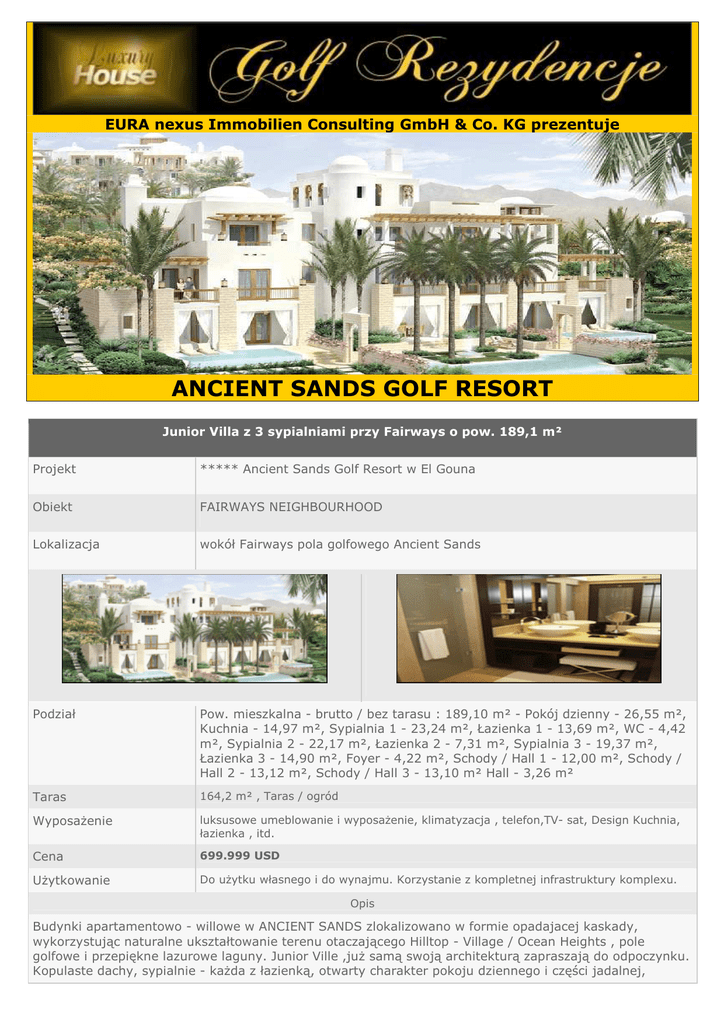 EURA nexus Immobilien Consulting GmbH & Co. KG prezentuje ANCIENT SANDS GOLF RESORT Junior Villa z 3 sypialniami przy Fairways o pow. 189,1 m² Projekt ***** Ancient Sands Golf Resort w El Gouna Obiekt FAIRWAYS NEIGHBOURHOOD Lokalizacja wokół Fairways pola golfowego Ancient Sands Podział Pow. mieszkalna - brutto / bez tarasu : 189,10 m² - Pokój dzienny - 26,55 m², Kuchnia - 14,97 m², Sypialnia 1 - 23,24 m², Łazienka 1 - 13,69 m², WC - 4,42 m², Sypialnia 2 - 22,17 m², Łazienka 2 - 7,31 m², Sypialnia 3 - 19,37 m², Łazienka 3 - 14,90 m², Foyer - 4,22 m², Schody / Hall 1 - 12,00 m², Schody / Hall 2 - 13,12 m², Schody / Hall 3 - 13,10 m² Hall - 3,26 m² Taras 164,2 m² , Taras / ogród WyposaŜenie luksusowe umeblowanie i wyposaŜenie, klimatyzacja , telefon,TV- sat, Design Kuchnia, łazienka , itd. Cena 699.999 USD UŜytkowanie Do uŜytku własnego i do wynajmu. Korzystanie z kompletnej infrastruktury komplexu. Opis Budynki apartamentowo - willowe w ANCIENT SANDS zlokalizowano w formie opadajacej kaskady, wykorzystując naturalne ukształtowanie terenu otaczającego Hilltop - Village / Ocean Heights , pole golfowe i przepiękne lazurowe laguny. Junior Ville ,juŜ samą swoją architekturą zapraszają do odpoczynku. Kopulaste dachy, sypialnie - kaŜda z łazienką, otwarty charakter pokoju dziennego i części jadalnej, Junior Villa z 3 sypialniami przy Fairways o pow. 189,1 m² prysznic w ogrodzie i przestrzenne tarasy - czy trzeba coś więcej ? Budynki te otoczone są bogatą w róŜnorodność zielenią, ścieŜkami spacerowymi i otwartymi placami zachęcającymi do odpoczynku. Architektoniczne rozwiązanie powierzchni mieszkalnych ,posiada w stronę tarasu charakter otwarty, gwarantujący przyjemne ochłodzenie przez wiatry z nad morza. Do relaksu , wypoczynku i ochłody zachęcają równieŜ przepięknie zaaranŜowane baseny i otaczające je palmy. Przestronne Junior Ville z 3 sypialnami z głównym wejściem na I piętrze zaprojektowane zostały pod kątem maksymaliacji przestrzeni a ich duŜe tarasy i ogród z basenem dają prawdziwe poczucie swobody i wolności . Idealne rozwiązanie dla rodziny i osób lubiących przestrzeń. Centrum apartamentu / Villi stanowi salon z otwartą kuchnią i jadalnią posiadajacy duŜy taras połączony pergolą z zadaszoną częścią jadalno – wypoczynkową - wspaniałe miejsce do odpoczynku, gdzie duŜe szklane drzwi tarasowe zapewniają doskonały napływ światła dziennego. Taras na dachu zapewnia wspaniałe widoki na laguny i pole golfowe. Do kaŜdej nieruchomości mogą Państwo opcjonalnie skorzystać z servisu / programu wynajmu i zarządzania.Elegancja, luksus oraz wysoka jakość są podstawą konceptu wyposaŜenia objektów w ANCIENT SANDS, co daje gwarancję spełnienia w programie wynajmu ,warunków i wymogów kategorii 5*****. Dla Kupujących , chcących wziąść udział w tym programie , ALCHEMY Team przygotował trzy warianty wyposaŜenia: Cool White , Modern Classic i Yacht (w tej opcji pobierana jest dopłata). Koszty wypasaŜenia , do którego naleŜą m.i.n. : klimatyzacja, wykończenie podług i ścian, Design kuchnia , łazienka są juŜ ujęte w cenie nieruchomości. Dla Kupujących, którzy nie chcą brać udziału w programie wynajmu, przygotowana została mniej luksusowa opcja wyposaŜenia " Gouna Gala " , która nie zawiera klimatyzacji i wyposaŜenia kuchni, moŜna je jednak dodatkowo nabyć. Uwagi ! Powierzchnie tarasów są zróŜnicowane , a ich wielkość uzaleŜniona jest od lokalizacji apartamentu w budynku Plan Apartamentu Lokalizacja Developer Agent Generalny na Polskę Kontakt: Tel. +49 (0) 39924 7993 -0 Fax. +49 (0) 39924 7993 – 15 [email protected] j.polski: Tel. +49 (0) 9252 350 900 Fax. +49 (0) 9252 6953 [email protected]