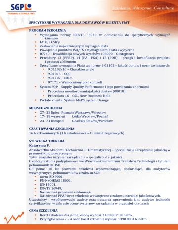 SPECYFICZNE WYMAGANIA DLA DOSTAWCÓW KLIENTA FIAT PROGRAM SZKOLENIA Wymagania normy ISO/TS 16949 w odniesieniu do specyficznych wymagań klientów IATF, a CSR’y Zestawienie najważniejszych wymagań Fiata Powiązania punktów ISO/TS z wymaganiami Fiata i wytyczne 07740 – Kwalifikacja nowych wyrobów i 08090 – Odstępstwo Procedury 13 (PPRP), 14 (PA i PSA) i 15 (PDR) – przegląd kwalifikacja projektu i procesu z klientem Specyficzne wymagania Fiata wg normy 9.01102 – Jakość dostaw i norm związanych: 9.01102/10 – Charakterystyki 9.01013 – CQC 9.01107 – IMDS 07171 – Wzmocniony plan kontroli System SQP – Supply Quality Performance i jego powiązania z normami Procedura monitorowania jakości dostaw (08018) Procedura 16 – CSL, New Bussiness Hold Portale klienta: System MaPS, system Orange MIEJSCE SZKOLENIA 27 - 28 lipiec Poznań/Warszawa/Wrocław 17 - 18 wrzesień Łódź/Wrocław/Poznań 23 - 24 listopad Gdańsk/Kraków/Wrocław CZAS TRWANIA SZKOLENIA 16 h szkoleniowych (1 h szkoleniowa = 45 minut zegarowych) SYLWETKA TRENERA Katarzyna P. Absolwentka Akademii Techniczno – Humanistycznej – Specjalizacja Zarządzanie jakością w przemyśle motoryzacyjnym. Tytuł: magister inżynier zarządzania – specjalista d.s. jakości. Ukończyła studia podyplomowe we Wrocławskim Centrum Transferu Technologii z tytułem pełnomocnik ds. ISO. Od ponad 10 lat prowadzi szkolenia wprowadzające, doskonalące, dla audytorów wewnętrznych, pełnomocników z zakresu SZJ: norm ISO 9001, PN-N/OHSAS 18001, ISO 14001, ISO/TS 16949, Nadzór nad procesem reklamacji, Nadzór nad PPAP oraz szkolenia wewnętrzne z zakresu narzędzi jakościowych. Uczestniczy i współprowadzi audyty oraz poszarza uprawnienia jako audytor jednostki certyfikacyjnej w zakresie oceny systemów zarządzania w przedsiębiorstwach CENA SZKOLENIA Koszt szkolenia dla jednej osoby wynosi: 1490.00 PLN netto. Przy zgłoszeniu 2 – 4 osób koszt szkolenia wynosi: 1390.00 PLN netto.