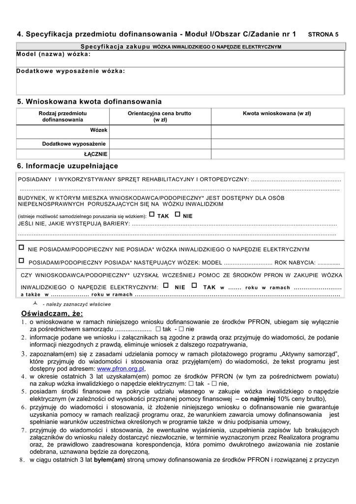 4. Specyfikacja przedmiotu dofinansowania - Moduł I/Obszar C/Zadanie nr 1 S pe c yfi k a c ja za k upu Mode l (na z w a ) w ózk a : STRONA 5 WÓZKA INWALIDZKIEGO O NAPĘDZIE ELEKTRYCZNYM Doda tk ow e w ypos a że ni e w ózk a : 5. Wnioskowana kwota dofinansowania Rodzaj przedmiotu dofinansowania Orientacyjna cena brutto (w zł) Kwota wnioskowana (w zł) Wózek Dodatkowe wyposażenie ŁĄCZNIE 6. Informacje uzupełniające POSIADANY I WYKORZYSTYWANY SPRZĘT REHABILITACYJNY I ORTOPEDYCZNY: .................................................... ........................................................................................................................................................................................ BUDYNEK, W KTÓRYM MIESZKA WNIOSKODAWCA/PODOPIECZNY* JEST DOSTĘPNY DLA OSÓB NIEPEŁNOSPRAWNYCH PORUSZAJĄCYCH SIĘ NA WÓZKU INWALIDZKIM □ □ TAK NIE JEŚLI NIE, JAKIE WYSTĘPUJĄ BARIERY: ...................................................................................................................... (istnieje możliwość samodzielnego poruszania się wózkiem): ....................................................................................................................................................................................... □ □ NIE POSIADAM/PODOPIECZNY NIE POSIADA* WÓZKA INWALIDZKIEGO O NAPĘDZIE ELEKTRYCZNYM POSIADAM/PODOPIECZNY POSIADA* NASTĘPUJĄCY WÓZEK: MODEL ............................ ROK NABYCIA: ............... CZY WNIOSKODAWCA/PODOPIECZNY* UZYSKAŁ WCZEŚNIEJ POMOC ZE ŚRODKÓW PFRON W ZAKUPIE WÓZKA INWALIDZKIEGO O NAPĘDZIE ELEKTRYCZNYM: □ □ NIE TAK w . . . . . . . r o k u w r a m a c h . . . . . . . . . . . . . . . . . . . . . . . . . a także w .................... roku w ramach ........................................................................................................... - należy zaznaczyć właściwe Oświadczam, że: 1. o wnioskowane w ramach niniejszego wniosku dofinansowanie ze środków PFRON, ubiegam się wyłącznie za pośrednictwem samorządu ..................... tak - nie 2. informacje podane we wniosku i załącznikach są zgodne z prawdą oraz przyjmuję do wiadomości, że podanie informacji niezgodnych z prawdą, eliminuje wniosek z dalszego rozpatrywania, 3. zapoznałam(em) się z zasadami udzielania pomocy w ramach pilotażowego programu „Aktywny samorząd”, które przyjmuję do wiadomości i stosowania oraz przyjęłam(em) do wiadomości, że tekst programu jest dostępny pod adresem: www.pfron.org.pl, 4. w okresie ostatnich 3 lat uzyskałam(em) pomoc ze środków PFRON (w tym za pośrednictwem powiatu) na zakup wózka inwalidzkiego o napędzie elektrycznym: tak - nie, 5. posiadam środki finansowe na pokrycie udziału własnego w zakupie wózka inwalidzkiego o napędzie elektrycznym (w zależności od wysokości przyznanej pomocy finansowej – co najmniej 10% ceny brutto), 6. przyjmuję do wiadomości i stosowania, iż złożenie niniejszego wniosku o dofinansowanie nie gwarantuje uzyskania pomocy w ramach realizacji programu oraz, że warunkiem zawarcia umowy dofinansowania jest spełnianie warunków uczestnictwa określonych w programie także w dniu podpisania umowy, 7. przyjmuję do wiadomości i stosowania, że ewentualne wyjaśnienia, uzupełnienia zapisów lub brakujących załączników do wniosku należy dostarczyć niezwłocznie, w terminie wyznaczonym przez Realizatora programu oraz, że prawidłowo zaadresowana korespondencja, która pomimo dwukrotnego awizowania nie zostanie odebrana, uznawana będzie za doręczoną, 8. w ciągu ostatnich 3 lat byłem(am) stroną umowy dofinansowania ze środków PFRON i rozwiązanej z przyczyn leżących po mojej stronie: tak - nie, STRONA 6 9. przyjmuję do wiadomości i stosowania, iż w przypadku przyznanego dofinansowania, przelanie środków finansowych następuje na konto dostawcy przedmiotu zakupu, na podstawie przedstawionej i podpisanej przez Wnioskodawcę faktury VAT. W związku z art. 24 ust. 1 ustawy z dnia 29 sierpnia 1997 roku o ochronie danych osobowych, Powiatowe Centrum Pomocy Rodzinie w Myszkowie, ul. Partyzantów 21 jako administrator danych osobowych informuje, że pozyskuje dane osobowe w trakcie prowadzonych postępowań administracyjnych. Dane osobowe są zbierane i wykorzystywane przez PCPR w Myszkowie dla prowadzonych postępowań administracyjnych, w celu przyznania bądź odmowy dofinansowania w związku ze złożeniem w/w wniosku. Pozyskane dane osobowe nie są udostępnianie podmiotom trzecim, z zastrzeżeniem obowiązku wynikającego z odrębnych przepisów. Osoby, których dane osobowe zostały pozyskane przez PCPR w Myszkowie dla w/w celów mają prawo dostępu do ich treści, a także prawo ich poprawiania. Obowiązek podania danych osobowych wynika z Ustawy z dnia 27 sierpnia 1997 r. o rehabilitacji zawodowej i społecznej oraz zatrudnianiu osób niepełnosprawnych. Wnioskodawca nie mogący pisać, lecz mogący czytać, zamiast podpisu może uczynić na dokumencie tuszowy odcisk palca, a obok tego odcisku inna osoba wypisze jej imię i nazwisko umieszczając swój podpis; zamiast Wnioskodawcy może także podpisać się inna osoba, z tym że jej podpis musi być poświadczony przez notariusza lub wójta (burmistrza, prezydenta miasta), starostę lub marszałka województwa z zaznaczeniem, że podpis został złożony na życzenie nie mogącego pisać, lecz mogącego czytać. ...................................... dnia ..... /....... /20....... r. ................................ podpis Wnioskodawcy 7. Załączniki: wymagane do wniosku WYPEŁNIA WYŁĄCZNIE REALIZATOR PROGRAMU (należy zaznaczyć właściwe) Nazwa załącznika Dołączono do wniosku Uzupełniono 1. Kserokopia aktualnego orzeczenia o znacznym stopniu niepełnosprawności lub orzeczenia równoważnego albo orzeczenia o niepełnosprawności podopiecznego (osoby do 16 roku życia) □ □ 2. Oświadczenie o wysokości średnich mie