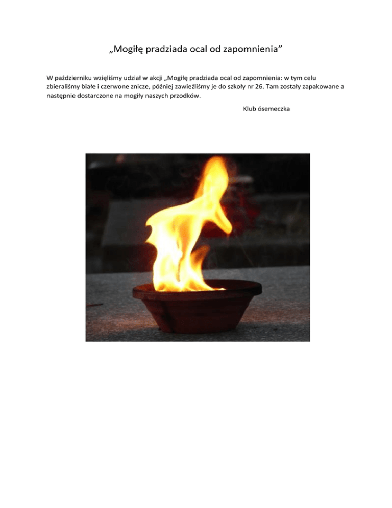 „Mogiłę pradziada ocal od zapomnienia” W październiku wzięliśmy udział w akcji „Mogiłę pradziada ocal od zapomnienia: w tym celu zbieraliśmy białe i czerwone znicze, później zawieźliśmy je do szkoły nr 26. Tam zostały zapakowane a następnie dostarczone na mogiły naszych przodków. Klub ósemeczka