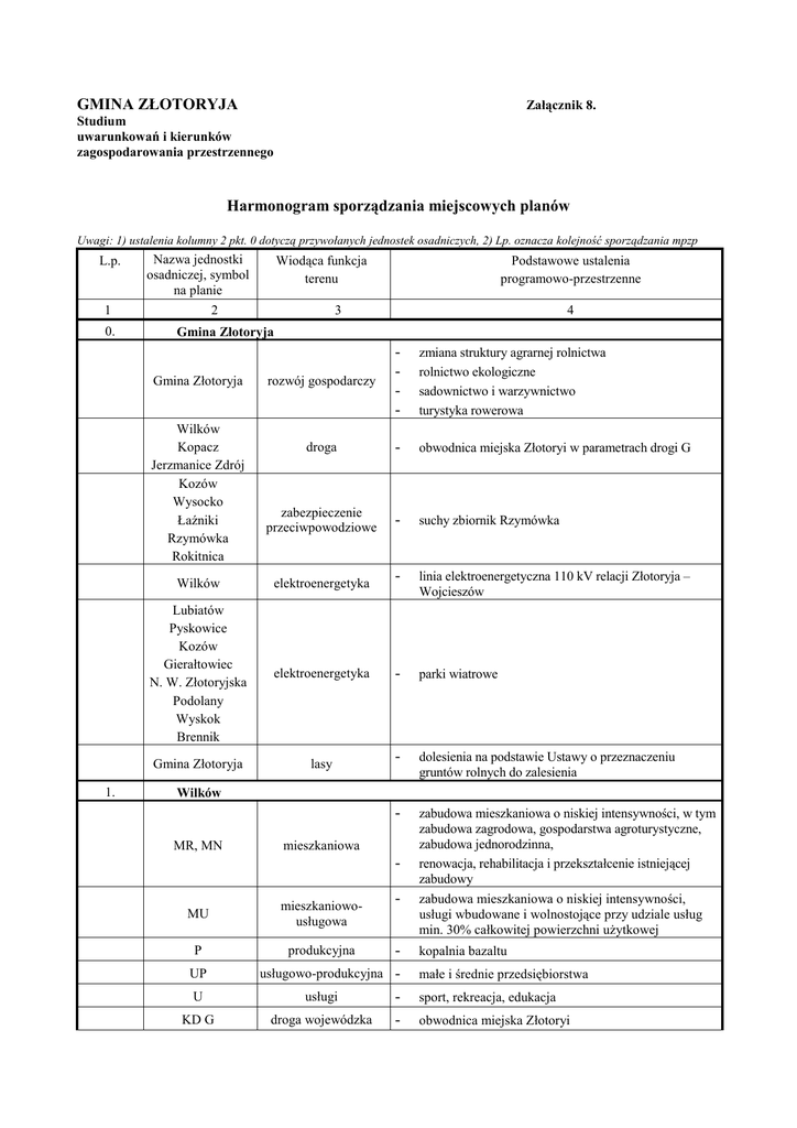 GMINA ZŁOTORYJA Załącznik 8. Studium uwarunkowań i kierunków zagospodarowania przestrzennego Harmonogram sporządzania miejscowych planów Uwagi: 1) ustalenia kolumny 2 pkt. 0 dotyczą przywołanych jednostek osadniczych, 2) Lp. oznacza kolejność sporządzania mpzp L.p. 1 0. Nazwa jednostki osadniczej, symbol na planie 2 Podstawowe ustalenia programowo-przestrzenne 3 4 Gmina Złotoryja rozwój gospodarczy - zmiana struktury agrarnej rolnictwa rolnictwo ekologiczne sadownictwo i warzywnictwo turystyka rowerowa droga - obwodnica miejska Złotoryi w parametrach drogi G zabezpieczenie przeciwpowodziowe - suchy zbiornik Rzymówka Wilków elektroenergetyka - linia elektroenergetyczna 110 kV relacji Złotoryja – Wojcieszów Lubiatów Pyskowice Kozów Gierałtowiec N. W. Złotoryjska Podolany Wyskok Brennik elektroenergetyka - parki wiatrowe Gmina Złotoryja lasy - dolesienia na podstawie Ustawy o przeznaczeniu gruntów rolnych do zalesienia - zabudowa mieszkaniowa o niskiej intensywności, w tym zabudowa zagrodowa, gospodarstwa agroturystyczne, zabudowa jednorodzinna, renowacja, rehabilitacja i przekształcenie istniejącej zabudowy zabudowa mieszkaniowa o niskiej intensywności, usługi wbudowane i wolnostojące przy udziale usług min. 30% całkowitej powierzchni użytkowej Gmina Złotoryja Wilków Kopacz Jerzmanice Zdrój Kozów Wysocko Łaźniki Rzymówka Rokitnica 1. Wiodąca funkcja terenu Wilków MR, MN mieszkaniowa MU P UP U KD G mieszkaniowousługowa - usługowo-produkcyjna usługi droga wojewódzka produkcyjna kopalnia bazaltu małe i średnie przedsiębiorstwa sport, rekreacja, edukacja obwodnica miejska Złotoryi 2. 3. 4. - linia elektroenergetyczna 110 kV relacji Złotoryja – Wojcieszów - przebudowa infrastruktury drogowej - rozbudowa infrastruktury technicznej lasy - dolesienia MR, MN mieszkaniowa - zabudowa mieszkaniowa o niskiej intensywności, w tym gospodarstwa agroturystyczne UP usługowo-produkcyjna - małe i średnie przedsiębiorstwa - E elektroenergetyka KD L KD D W K G drogi lokalne drogi dojazdowe wodociąg kanalizacja gazociąg Ls Wilków-Osiedle Leszczyna MR, MN mieszkaniowa - zabudowa mieszkaniowa o niskiej intensywności, w tym zabudowa zagrodowa i gospodarstwa agroturystyczne renowacja i zagospodarowanie zabytków architektury ML mieszkanioworekreacyjna - zabudowa letniskowa (pobyt czasowy) U usługowa - sport i rekreacja KD L KD D W K G drogi lokalne drogi dojazdowe wodociąg kanalizacja gazociąg - przebudowa infrastruktury drogowej - rozbudowa infrastruktury technicznej Ls lasy - dolesienia - zabudowa mieszkaniowa o niskiej intensywności z dopuszczeniem realizacji usług wbudowanych lub wolnostojących, przy udziale usług min. 30% całkowitej powierzchni użytkowej w zabudowie renowacja i zagospodarowanie zabytków architektury Kopacz mieszkaniowa i mieszkaniowousługowa MN, MU 5. KD G droga wojewódzka KD L KD D W K G drogi lokalne drogi dojazdowe wodociąg kanalizacja gazociąg - obwodnica miejska Złotoryi - przebudowa infrastruktury drogowej - rozbudowa infrastruktury technicznej - zabudowa mieszkaniowa o niskiej intensywności, w tym zabudowa zagrodowa i gospodarstwa agroturystyczne renowacja i zagospodarowanie zabytków architektury oraz parków wiejskich rehabilitacja i przekształcenie istniejącej zabudowy zabudowa mieszkaniowa o niskiej intensywności z dopuszczeniem realizacji usług wbudowanych lub wolnostojących, przy udziale usług min. 30% całkowitej powierzchni użytkowej w zabudowie Jerzmanice-Zdrój MR, MN mieszkaniowa - MU mieszkaniowousługowa U usługowa KD G droga wojewódzka - sport i rekreacja obwodnica miejska Złotoryi - budowa elektrowni wodnej KD L KD D W K G infrastruktura techniczna drogi lokalne drogi dojazdowe wodociąg kanalizacja gazociąg - przebudowa infrastruktury drogowej rozbudowa infrastruktury technicznej Ls lasy - dolesienia - zabudowa mieszkaniowa o niskiej intensywności z dopuszczeniem realizacji usług wbudowanych lub wolnostojących, przy udziale usług min. 30% całkowitej powierzchni użytkowej w zabudowie renowacja i zagospodarowanie zabytków architektury i parków wiejskich EE 6. Lubiatów MR, MU małe i średnie przedsiębiorstwa - parki wiatrowe KD L KD D W K G infrastruktura techniczna drogi lokalne drogi dojazdowe wodociąg kanalizacja gazociąg - przebudowa infrastruktury drogowej rozbudowa infrastruktury technicznej Ls lasy - dolesienia - zabudowa mieszkaniowa o niskiej intensywności renowacja i zagospodarowanie zabytków architektury i parków wiejskich - małe i średnie przedsiębiorstwa - przebudowa infrastruktury drogowej rozbudowa infrastruktury technicznej - parki wiatrowe lasy - dolesienia mieszkaniowa i mieszkaniowousługowa - zabudowa mieszkaniowa o niskiej intensywności renowacja i zagospodarowanie zabytków architektury usługowo-produkcyjna U usługowa sport i rekreacja – boisko sportowe oraz edukacja Pyskowice MR, MU mieszkaniowa i mieszkaniowousługowa UP usługowo-produkcyjna KD L KD D W K G drogi lokalne drogi dojazdowe wodociąg kanalizacja gazociąg infrastruktura techniczna EE Ls 8. - UP EE 7. mieszkaniowa i mieszkaniowousługowa Kozów MR, MU Ws UP KD L KD D W usługowo-produkcyjna suchy zbiornik wodny drogi lokalne drogi dojazdowe wodociąg - Rzymówka małe i średnie przedsiębiorstwa przebudowa infrastruktury drogowej rozbudowa infrastruktury technicznej K G EE Ls 9. Ws U Ls EE UP U Ws lasy - dolesienia suchy zbiornik wodny usługowa lasy mieszkaniowa Elektroenergetyka, usługowo-produkcyjna zabudowa mieszkaniowa o niskiej intensywności renowacja i zagospodarowanie zabytków architektury Rzymówka sport i rekreacja dolesienia - budowa elektrowni fotowoltaicznej, - zabudowa mieszkaniowa o niskiej intensywności, w tym zabudowa zagrodowa i gospodarstwa agroturystyczne renowacja i zagospodarowanie zabytków architektury oraz parków wiejskich rehabilitacja i przekształcenie istniejącej zabudowy produkcja, przemysł, bazy , składy, usługi, mieszkaniowa - usłu
