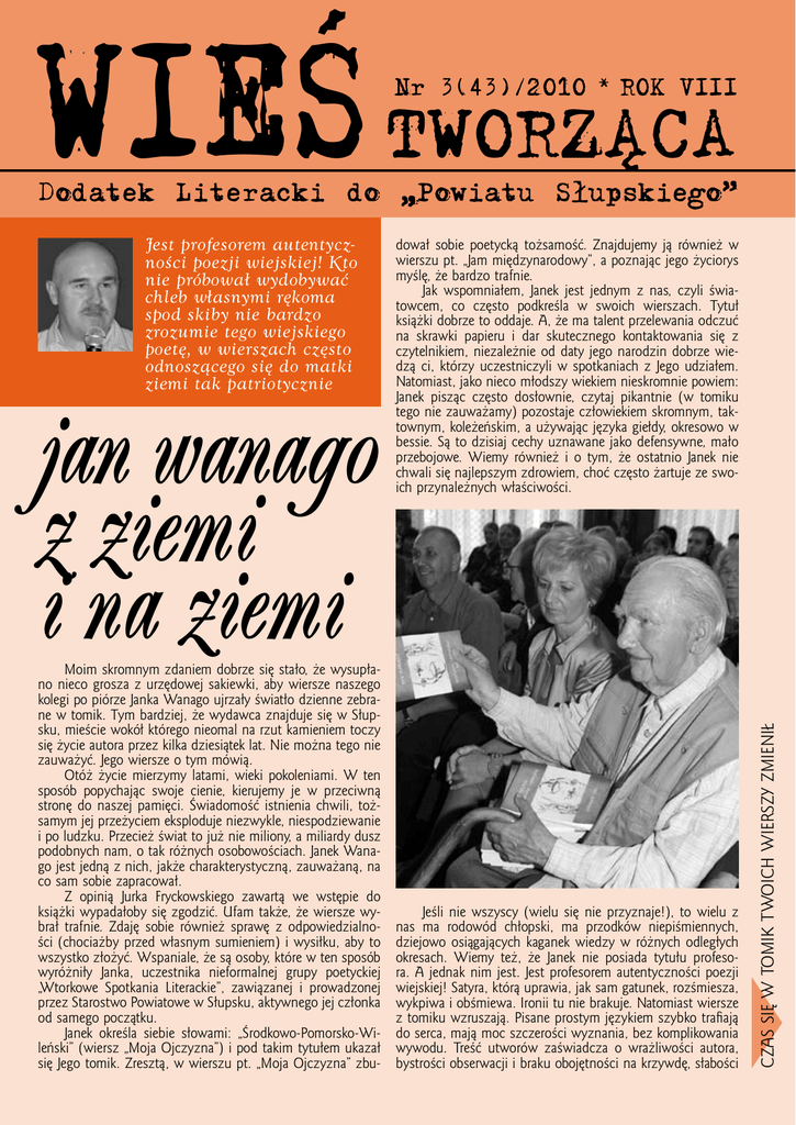 WIEŚ TWORZĄCA Nr 3(43)/2010 * ROK VIII Dodatek Literacki do „Powiatu Słupskiego” jan wanago z ziemi i na ziemi Moim skromnym zdaniem dobrze się stało, że wysupłano nieco grosza z urzędowej sakiewki, aby wiersze naszego kolegi po piórze Janka Wanago ujrzały światło dzienne zebrane w tomik. Tym bardziej, że wydawca znajduje się w Słupsku, mieście wokół którego nieomal na rzut kamieniem toczy się życie autora przez kilka dziesiątek lat. Nie można tego nie zauważyć. Jego wiersze o tym mówią. Otóż życie mierzymy latami, wieki pokoleniami. W ten sposób popychając swoje cienie, kierujemy je w przeciwną stronę do naszej pamięci. Świadomość istnienia chwili, tożsamym jej przeżyciem eksploduje niezwykle, niespodziewanie i po ludzku. Przecież świat to już nie miliony, a miliardy dusz podobnych nam, o tak różnych osobowościach. Janek Wanago jest jedną z nich, jakże charakterystyczną, zauważaną, na co sam sobie zapracował. Z opinią Jurka Fryckowskiego zawartą we wstępie do książki wypadałoby się zgodzić. Ufam także, że wiersze wybrał trafnie. Zdaję sobie również sprawę z odpowiedzialności (chociażby przed własnym sumieniem) i wysiłku, aby to wszystko złożyć. Wspaniale, że są osoby, które w ten sposób wyróżniły Janka, uczestnika nieformalnej grupy poetyckiej „Wtorkowe Spotkania Literackie”, zawiązanej i prowadzonej przez Starostwo Powiatowe w Słupsku, aktywnego jej członka od samego początku. Janek określa siebie słowami: „Środkowo-Pomorsko-Wileński” (wiersz „Moja Ojczyzna”) i pod takim tytułem ukazał się Jego tomik. Zresztą, w wierszu pt. „Moja Ojczyzna” zbu- dował sobie poetycką tożsamość. Znajdujemy ją również w wierszu pt. „Jam międzynarodowy”, a poznając jego życiorys myślę, że bardzo trafnie. Jak wspomniałem, Janek jest jednym z nas, czyli światowcem, co często podkreśla w swoich wierszach. Tytuł książki dobrze to oddaje. A, że ma talent przelewania odczuć na skrawki papieru i dar skutecznego kontaktowania się z czytelnikiem, niezależnie od daty jego narodzin dobrze wiedzą ci, którzy uczestniczyli w spotkaniach z Jego udziałem. Natomiast, jako nieco młodszy wiekiem nieskromnie powiem: Janek pisząc często dosłownie, czytaj pikantnie (w tomiku tego nie zauważamy) pozostaje człowiekiem skromnym, taktownym, koleżeńskim, a używając języka giełdy, okresowo w bessie. Są to dzisiaj cechy uznawane jako defensywne, mało przebojowe. Wiemy również i o tym, że ostatnio Janek nie chwali się najlepszym zdrowiem, choć często żartuje ze swoich przynależnych właściwości. Jeśli nie wszyscy (wielu się nie przyznaje!), to wielu z nas ma rodowód chłopski, ma przodków niepiśmiennych, dziejowo osiągających kaganek wiedzy w różnych odległych okresach. Wiemy też, że Janek nie posiada tytułu profesora. A jednak nim jest. Jest profesorem autentyczności poezji wiejskiej! Satyra, którą uprawia, jak sam gatunek, rozśmiesza, wykpiwa i obśmiewa. Ironii tu nie brakuje. Natomiast wiersze z tomiku wzruszają. Pisane prostym językiem szybko trafiają do serca, mają moc szczerości wyznania, bez komplikowania wywodu. Treść utworów zaświadcza o wrażliwości autora, bystrości obserwacji i braku obojętności na krzywdę, słabości Czas się w tomik Twoich wierszy zmienił Jest profesorem autentyczności poezji wiejskiej! Kto nie próbował wydobywać chleb własnymi rękoma spod skiby nie bardzo zrozumie tego wiejskiego poetę, w wierszach często odnoszącego się do matki ziemi tak patriotycznie Czas się w tomik Twoich wierszy zmienił i niesprawiedliwość doczesną z odniesieniami do wcześniejszych doświadczeń Janka Wanago oraz dalszego i bliższego okresu historii. Jerzy Fryckowki pisze: „poeta chwalił się komuś, że po jednym spacerze po cmentarzu napisał ponad czterysta epitafiów”. Janek nie tylko to potrafi, ale znajduje we mnie zrozumienie. Mój pierworodny syn puszczony od poręczy podtrzymującej go, kiedy zorientował się, że idzie samodzielnie, biegł przed siebie coraz szybciej, śmiejąc się głośno, tak długo aż upadł. Porównanie niezbyt trafne i może zbyt śmiałe, ale coś w tym jest. Czegoś usilnie pragniemy, a gdy czujemy, że jest to osiągalne, a nawet wspaniale nam idzie, bywa, że zachowujemy się wtedy euforycznie. Sprawa następna to datowanie wierszy. Moje w tomikach tak właśnie oznakowuję. W tomiku Janka nie wszystkie są opatrzone datą ich powstania. Rodzi to dla mnie pewną trudność w ocenie tzw. poziomu w czasie, tzn. czytając je, trudniej jest wyodrębnić słabsze i lepsze utwory w odniesieniu do okresów ich pisania. Całość zbioru, zresztą jak u wszystkich, zawiera utwory dobre, bardzo dobre i słabsze. Jako przyrodnik i piszący o przyrodzie cieplej zaznaczę, niż to zauważa Jurek, odniesienia treści wierszy do matki natury. Przecież żurawie (wiersz „Bracia żurawie”) to również nasze rodzime ptaki. Podmiot tutaj utożsamia ptaka - żurawia, porównanie - odniesienie wyjątkowo uprawnione przez Janka Wanago. Otóż ojciec mój, mieszkając jeszcze przed II wojną światową w okolicach Wilna, będąc tutaj mówił: „one (żurawie) przypominają mi okres tamtego przebywania; ten sam odgłos klangoru o poranku zasnutym jedwabną mgiełką”. Dodam, że nasza rzeka Słupia swoje początki bierze w rezerwacie Żurawie Chrusty! Podobnie wzruszył mnie wiersz pt. „Wiśnie na ustach”. Przywołał moją młodość z rodzinnego sadu, gdzie kwitnące wiśnie całymi kiściami opadały na ramiona. Janek przywołuje ten gatunek bardzo trafnie, wiśnie - kwiaty to niedojrzałość, niewinność, zapewne rozpuszczone włosy dziewczyny, wiśnie - owoce, dojrzałość, spełnienie, przecież była tam pszczółka. Jan Wanago z ziemi i na ziemi. Zawładać 30-hektarową połacią nie jest łatwo. Kto nie próbował wydobywać chleb własnymi rękoma spod skiby, nie bardzo