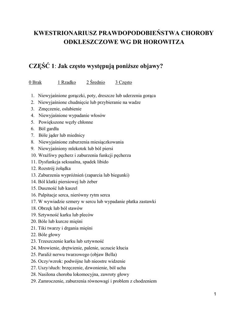 KWESTRIONARIUSZ PRAWDOPODOBIEŃSTWA CHOROBY ODKLESZCZOWE WG DR HOROWITZA CZĘŚĆ 1: Jak często występują poniższe objawy? 0 Brak 1 Rzadko 2 Średnio 3 Często 1. Niewyjaśnione gorączki, poty, dreszcze lub uderzenia gorąca 2. Niewyjaśnione chudnięcie lub przybieranie na wadze 3. Zmęczenie, osłabienie 4. Niewyjaśnione wypadanie włosów 5. Powiększone węzły chłonne 6. Ból gardła 7. Bóle jąder lub miednicy 8. Niewyjaśnione zaburzenia miesiączkowania 9. Niewyjaśniony mlekotok lub ból piersi 10. Wrażliwy pęcherz i zaburzenia funkcji pęcherza 11. Dysfunkcja seksualna, spadek libido 12. Rozstrój żołądka 13. Zaburzenia wypróżnień (zaparcia lub biegunki) 14. Ból klatki piersiowej lub żeber 15. Duszność lub kaszel 16. Palpitacje serca, nierówny rytm serca 17. W wywiadzie szmery w sercu lub wypadanie płatka zastawki 18. Obrzęk lub ból stawów 19. Sztywność karku lub pleców 20. Bóle lub kurcze mięśni 21. Tiki twarzy i drgania mięśni 22. Bóle głowy 23. Trzeszczenie karku lub sztywność 24. Mrowienie, drętwienie, palenie, uczucie kłucia 25. Paraliż nerwu twarzowego (objaw Bella) 26. Oczy/wzrok: podwójne lub nieostre widzenie 27. Uszy/słuch: brzęczenie, dzwonienie, ból ucha 28. Nasilona choroba lokomocyjna, zawroty głowy 29. Zamroczenie, zaburzenia równowagi i problem z chodzeniem 1 30. Drżenie 31. Zamieszanie, problem z myśleniem 32. Problem z koncentracją i czytaniem 33. Zapominanie, słaba pamięć krótka 34. Dezorientacja: gubienie się, chodzenie do niewłaściwych miejsc 35. Trudności z mową i pisaniem 36. Huśtawki nastroju, drażliwość, depresja 37. Zaburzenie snu: długi sen, problem z zasypianiem, wczesne budzenie się 38. Nasilone objawy zatrucia po alkoholu Dodaj punkty z czterech kolumn. To jest twój pierwszy wynik. Wynik 1: ________ CZĘŚĆ 2: Najczęstsze objawy boreliozy Jeśli przy poniższych objawach z Części 1 postawiłeś 3, dodaj dodatkowo po 5 punktów. • Zmęczenie • Zapominanie, słaba pamięć krótka • Ból lub obrzęk stawów • Mrowienie, drętwienie, palenie, uczucie kłucia • Zaburzenie snu: długi sen, problem z zasypianiem, wczesne budzenie się Wynik 2: ________ CZĘŚĆ 3: Czy to zdarzyło się tobie? Zakreśl punkty przy stwierdzeniu, które opisuje ciebie. 1. Miałeś ukąszenie kleszcza bez towarzyszącej wysypki oraz bez objawów grypopodobnych. 3 punkty 2. Miałeś ukąszenie kleszcza, rumień migrujący lub wysypkę a po nich objawy grypopodobne. 5 punktów 3. Mieszkasz w rejonie określanym jako endemiczny dla boreliozy*. 2 punkty 4. U członka twojej rodziny zdiagnozowano Boreliozę lub inna chorobę odkleszczową. 1 punkt 5. Doświadczasz wędrujących bóli mięśniowych. 4 punkty 6. Doświadczasz wędrujących bóli stawowych. 4 punkty 2 7. Doświadczasz mrowienia/palenia/drętwienia, które wędruje, znika i pojawia się. 4 punkty 8. Zdiagnozowano u ciebie wcześniej zespół przewlekłego zmęczenia lub fibromialgię. 3 punkty 9. Zdiagnozowano u ciebie wcześniej chorobę autoimmunologiczną (toczeń, stwardnienie rozsiane [SM], reumatoidalne zapalenie stawów [RZS]). 3 punkty 10. Badania w kierunku Boreliozy wyszły u ciebie dodatnio (IFA, ELISA, Western Blot, PCR lub inne). 5 punktów Wynik 3: ________ CZĘŚĆ 4: Wynik całościowej oceny zdrowia 1. Myśląc o swoim zdrowiu fizycznym, oceń przez ile dni z ostatnich 30 twój stan zdrowia był zły. ………………… dni Na podstawie powyższej liczby dni przyporządkuj sobie określoną ilość punktów. 0–5 dni = 1 punkt 6–12 dni = 2 punkty 13–20 dni = 3 punkty 21–30 dni = 4 punkty 2. Myśląc o swoim zdrowiu psychicznym, oceń przez ile dni z ostatnich 30 twój stan zdrowia był zły. ………………… dni Na podstawie powyższej liczby dni przyporządkuj sobie określoną ilość punktów. 0–5 dni = 1 punkt 6–12 dni = 2 punkty 13–20 dni = 3 punkty 21–30 dni = 4 punkty Wynik 4: _________ 3 PODSUMUJ WYNIKI Wpisz poniżej punkty z każdej części. Dodaj i zapisz wynik końcowy. Część 1: ________ Część 2: ________ Część 3: ________ Część 4: ________ Wynik końcowy: ________ Jeśli twój wynik wynosi 46 lub więcej, masz wysokie prawdopodobieństwo choroby odkleszczowej. Powinieneś zgłosić się do lekarza w celu dalszej oceny. Jeśli twój wynik wynosi pomiedzy 21 a 46 być może masz chorobę odkleszczową. Powinieneś zgłosić się do lekarza w celu dalszej oceny. Jeśli twój wynik wynosi poniżej 21, nie wydaje się, abyś miał chorobę odkleszczową. *Obszary endemiczne w Polsce: Białowieża i województwo podlaskie, zachodniopomorskie, a także Mazury i Suwalszczyzna, Jasło, Opolszczezna. Od niedawana cały obszar Polski uważa się za endemiczny. 4