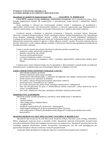 WYDZIAŁ TURYSTYKI I REKREACJI KATEDRA REKREACJI I ODNOWY BIOLOGICZNEJ Specjalność na studiach II stopnia kierunek TiR: COACHING W REKREACJI COACHING oznacza rozwój, stabilizację i wzmocnienie wewnętrzne. Jest to interaktywny proces, który pomaga pojedynczym osobom lub organizacjom w przyspieszeniu tempa rozwoju i polepszeniu efektów działania. Istotą coachingu w rekreacji jest wykorzystanie zasobów wiedzy i umiejętności już posiadanych i odpowiednie zmotywowanie oraz towarzyszenie klientowi w celowym usprawnianiu jego funkcjonowania w zakresie wykorzystania czasu wolnego i twórczego realizowania się w aspekcie aktywności ruchowej. Coachowie pracują z klientami w zakresach związanych z biznesem, rozwojem kariery, finansami, zdrowiem i relacjami interpersonalnymi. Dzięki coachingowi klienci ustalają konkretniejsze cele, optymalizują swoje działania, podejmują trafniejsze decyzje i pełniej korzystają ze swoich naturalnych umiejętności. Coaching jest procesem, którego głównym celem jest wzmocnienie klienta oraz wspieranie go w samodzielnym dokonywaniu zamierzonej zmiany (w oparciu o własne odkrycia, wnioski i zasoby). Powyższe elementy dotyczą również zachowań w czasie wolnym, dlatego coaching w rekreacji jest innowacyjną specjalnością kształcenia na kierunku turystyka i rekreacja. Couch to zawód o bardzo precyzyjnie określonych zadaniach, przede wszystkim ma: • przekazać wiedzę, teoretyczną i praktyczną • udzielać wskazówek, rad, szkolić • kierować zachowaniem klienta • wyznaczać konkretne zadania i ćwiczenia • być odpowiedzialnym za osiągnięcie celów i uzyskanie odpowiednich, zamierzonych efektów przez klienta Couchem może zostać właściwie każdy, kto jest specjalistą w danej dziedzinie i potrafi dzielić się zdobytym doświadczeniem i wiadomościami oraz chce pomagać ludziom w osiągnięciu ich celu. JAKIE UMIEJĘTNOŚCI POWINIEN POSIADAĆ COUCH ? • indywidualne podejście do klienta • dobranie najbardziej adekwatnego treningu • potrafi ułożyć indywidualną dietę, w zależności od organizmu oraz rodzaju i intensywności treningów, • potrafi zmotywować i pobudzić do działania • ma wiedzę z zakresu biologicznych podstaw aktywności ruchowej • potrafi pracować i komunikować się z ludźmi • jest osobą entuzjastyczną, pełną energii, potrafiącą zainteresować i zaangażować • musi być przygotowany do pracy w nieokreślonych ramach czasowych i umieć dostosować się do rytmu i wymagań klienta • inne cechy: cierpliwość, charyzma, umiejętność słuchania i przekazywania wiedzy PERSPEKTYWY ZAWODOWE Absolwent zyskuje szerokie perspektywy zawodowe, może podjąć pracę w charakterze: • doradcy • opiekuna klienta • może podjąć pracę w klubach fitness • ośrodkach SPA • ośrodkach wypoczynkowych, sportowych i rekreacyjnych • organizacjach zajmujących się upowszechnianiem kultury fizycznej • może podjąć pracę w firmach, przedsiębiorstwach dbających o kondycję psychofizyczną swoich pracowników DO KOGO KIEROWANA JEST SPECJALNOŚĆ COACHING W REKREACJI ? Specjalność adresowana jest do osób aktywnych, kreatorów kultury fizycznej i czasu wolnego, miłośników fitness, pragnących rozpocząć pracę w zawodzie coucha. Specjalność zapewnia profesjonalne przygotowanie przyszłych opiekunów klienta pod względem teoretycznym oraz praktycznym. Specjalność przeznaczona jest dla szerokiego spektrum absolwentów studiów licencjackich (zawodowych) oraz dla osób posiadających już uprawnienia instruktora rekreacji ruchowej o różnych specjalnościach. Atrakcyjny dobór przedmiotów kształcenia zapewnia wszechstronne przygotowanie zawodowe. 1 Plan 2-letnich studiów stacjonarnych II stopnia Zatwierdzony Uchwałą Rady Wydziału TiR z dnia 13-06-2013 r. dla studiów rozpoczynających się w roku akademickim 2013/14 Liczba godzin NAZWA PRZEDMIOTU 1 2 3 4 5 6 7 8 9 10 11 12 Socjologia czasu wolnego Prawo gospodarcze Regiony turystyczne Informatyka w turystyce i rekreacji(L) Antropomotoryka Zarządzanie przeds. turystycznym Historia kultury Planowanie przestrzenne w turystyce i rekreacji Statystyka w turystyce i rekreacji Polityka turystyczna i rekreacyjna Metodologia pracy naukowej Seminarium magisterskie 13 Egzamin magisterski 14 Wychowanie fizyczne (L) 15 Język obcy (L) I ROK Sem 1 Sem 2 15 tyg 15 tyg W C P W C P 2 2 6 2 2 6 2 2 6 1 2 4 1 2 6 2 2 6 2 1 6 2 2 6 1 1 3 O 60 60 60 45 45 60 45 60 30 60 15 75 W 30 30 30 15 15 30 30 30 15 30 15 0 C 30 30 30 30 30 30 15 30 15 30 0 75 0 0 0 60 0 60 2 1 2 1 0 120 2 2 2 3 120 RAZEM - przedmioty wspólne 795 Specjalność: Coaching w Rekreacji 16 Motywowanie i psychologia pracy z klientem 30 17 Podstawy coachingu 30 18 Doradztwo w zakresie odnowy biologicznej i psychicznej 45 19 Alternatywne formy spędzania czasu wolnego 45 20 Teoria i praktyka treningu rekreacyjnego - rodzaje 90 treningu 21 Promocja zdrowia i modelowanie sylwetki 30 22 Prawne i organizacyjne aspekty pracy coacha 30 23 Praktyka specjalnościowa 160 Razem specjalność 460 OGÓŁEM – przedmioty wspólne i specjalnościowe 1255 ECTS L- zajęcia w grupach laboratoryjnych 1 15 godzin indywidualnych seminaryjnych zajęć dydaktycznych II ROK Sem 3 Sem 4 15 tyg 15 tyg W C P W C P 2 1 2 6 2 2 2 2 2 1 10 30 2 30 2 270 525 0 15 15 15 15 30 15 30 30 75 0 1 1 1 1 2 1 2 2 2 3 3 4 4 3 0 15 0 75 345 30 15 160 385 910 0 2 3 30 2 10 30 4 E/Z ECTS E1 E1 E1 ZO1 E2 E2 E2 E2 ZO1 E3 ZO1 Z2, 3,4 E4 6 6 6 4 6 6 6 6 3 6 2 4 10 Z1,2 2 Z1-3 E4 11 14 84 0 3 6 ZO3 E3 E3 ZO3 E4 1 1 3 7 ZO3 ZO4 ZO4 30 30 3 3 4 4 9 3 3 7 120 Plan 2-letnich studiów niestacjonarnych II stopnia Zatwierdzony Uchwałą Rady Wydziału TiR z dnia 13-06-2013 r. dla studiów rozpoczynających się w roku akademickim 2013/14 Liczba godzin NAZWA PRZEDMIOTU O 30 30 30 20 30 30 30 30 20 30 10 45 W 20 20 20 10 20 20 20 20 10 20 10 0 0 0 0 14 Język obcy (L) 80 0 80 15 Socjologia czasu wolnego 30 20 1 2 3 4 5 