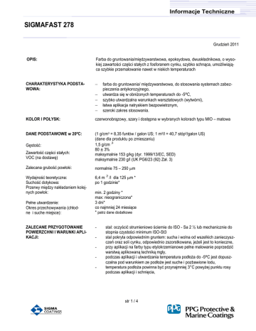 Informacje Techniczne SIGMAFAST 278 Grudzień 2011 OPIS: Farba do gruntowania/międzywarstwowa, epoksydowa, dwuskładnikowa, o wysokiej zawartości części stałych z fosforanem cynku, szybko schnąca, umożliwiająca szybkie przemalowanie nawet w niskich temperaturach CHARAKTERYSTYKA PODSTAWOWA: farba do gruntowania/ międzywarstwowa, do stosowania systemach zabezpieczenia antykorozyjnego, utwardza się w obniżonych temperaturach do -5⁰C, szybko utwardzalna warunkach warsztatowych (wytwórni), łatwa aplikacja natryskiem bezpowietrznym, szeroki zakres stosowania. KOLOR I POŁYSK: czerwonobrązowy, szary i dostępna w wybranych kolorach typu MIO – matowa DANE PODSTAWOWE w 20ºC: Zawartość części stałych: VOC (na dostawę) (1 g/cm3 = 8,35 funtów / galon US; 1 m2/l = 40,7 stóp2/galon US) (dane dla produktu po zmieszaniu) 1,5 g/cm 3 80 ± 3% maksymalnie 153 g/kg (dyr. 1999/13/EC, SED) maksymalnie 230 g/l (UK PG6/23 (92) Zał. 3) Zalecana grubość powłoki: normalnie 75 – 250 m Wydajność teoretyczna: Suchość dotykowa: Przerwy między nakładaniem kolejnych powłok: 6,4 m 2 /l dla 125 m * po 1 godzinie* Gęstość: Pełne utwardzenie: Okres przechowywania (chłodne i suche miejsce): ZALECANE PRZYGOTOWANIE POWIERZCHNI I WARUNKI APLIKACJI: min. 2 godziny * max: nieograniczona* 3 dni* co najmniej 24 miesiące * patrz dane dodatkowe - stal: oczyścić strumieniowo ściernie do ISO - Sa 2 ½ lub mechanicznie do stopnia czystości minimum ISO-St3 stal pokryta odpowiednim gruntem: sucha i wolna od wszelkich zanieczyszczeń oraz soli cynku, odpowiednio zszorstkowana, jeżeli jest to konieczne, przy aplikacji na farby typu etylokrzemianowe pełne malowanie poprzedzić warstwą aplikowaną techniką mgły, podczas aplikacji i utwardzania temperatura podłoża do -5⁰C jest dopuszczalna pod warunkiem ze podłoże jest suche i pozbawione lodu, temperatura podłoża powinna być przynajmniej 3°C powyżej punktu rosy podczas aplikacji i schnięcia, str 1 / 4 Informacje Techniczne SIGMAFAST 278 Grudzień 2011 INSTRUKCJA DLA UŻYTKOWNIKA: stosunek mieszania objętościowo: baza do utwardzacza 75: 25 temperatura mieszanych – bazy i utwardzacza powinna przewyższać 15C; w przeciwnym razie może zaistnieć potrzeba dodatkowej ilości rozcieńczalnika dla uzyskania odpowiedniej lepkości nadmiar rozcieńczalnika powoduje powstawanie zacieków i spowalnia proces utwardzania rozcieńczalnik powinien być dodawany dopiero po wymieszaniu składników Czas wstępny: nie ma Przydatność do stosowania po wymieszaniu składników w temp. 20C: 1 godz. * * - patrz dane dodatkowe NATRYSK BEZPOWIETRZNY: Zalecany rozcieńczalnik: Objętość rozcieńczalnika Kąt dyszy: Średnica dyszy: Ciśnienie na dyszy: MALOWANIE PĘDZLEM, WAŁKIEM: Zalecany rozcieńczalnik: Objętość rozcieńczalnika ROZPUSZCZALNIK DO MYCIA: BHP: DODATKOWE DANE: Thinner 91-92 0 – 10%, 30-40% przy aplikacji techniką mgły ok. 0,45 mm – 0,53 mm (=0,018” – 0,021”) ok. 0,48 mm – 0,63 mm (=0,019” – 0,025”) 20-25 MPa (= ok. 200-250 bar, 2800-3500 psi) Aplikacja wałkiem pozostawia ślady wałka i jest możliwa tylko dla minimalnej GPS. Należy stosować odpowiedni do farb epoksydowych wałek. Thinner 91-92 0 – 5%, Aplikacja pędzlem może pozostawiać ślady z uwagi na tiksotropowe właściwości farby, dopuszczalna tylko dla małych powierzchni, krawędzi, wyprawek oraz uzupełnienia grubości GPS. Thinner 90-53 patrz arkusze BHP nr 1430, 1431 oraz odpowiednie karty bezpieczeństwa produktu dla farby i zalecanych rozcieńczalników farba jest wyrobem rozpuszczalnikowym, w związku z czym należy zabezpieczyć się przed wdychaniem oparów lub mgły natryskowej a także unikać kontaktu farby z oczami i skórą. Grubość powłoki a wydajność teoretyczna: wydajność teoretyczna 10,6 [m2/l] 75 GPS (m) str 2 / 4 6,4 3,2 125 250 Informacje Techniczne SIGMAFAST 278 Grudzień 2011 Tabela przerw międzywarstwowych dla SigmaFast 278 przy grubości 125 μm dla przemalowywania dwuskładnikowymi farbami epoksydowymi i politemperatura uretanowymi powierzchni przerwa minimalna przerwa maksymalna*: -5C 0C 10C 20C 30C 24 godz. 14 godz. 4 godz. 2 godz. 1 godz. _ _ _ _ _ powłoka ma nieograniczony czas przemalowania pod warunkiem, że powierzchnia jest wolna od kredowania i innych zanieczyszczeń, w przypadku narażenia na działanie promieniowania słonecznego lub zanieczyszczenia powierzchni zalecane jest oczyszczenie i odpowiednie zszorstkowanie w celu zapewnienia dobrej adhezji kolejnej powłoki. o Optymalną adhezję otrzymujemy, gdy kolejna powłoka jest nakładana przed upływem pełnego czasu utwardzenia. o Tendencja do żółknięcia pod wpływem działania promieni słonecznych nie ma wpływu na właściwości ani nie powoduje żółknięcia powłoki nawierzchniowej. Tabela utwardzania przy grubości 125 µm temperatura suchość dotykowa suchość transpowierzchni portowa 16 godz. 38 godz. -5⁰C 11 godz. 24 godz. 0⁰C 2 godz. 6 godz. 10⁰C 1 godz. 2 godz. 20⁰C 0, 5 godz. 1 godz. 30⁰C pełne utwardzenie 21 dni 8 dni 3 dni 2 dni - odpowiednia wentylacja musi być zapewniona podczas aplikacji i utwardzania ( patrz karty informacyjne 1433 i 1434) Dostępność na świecie: Mimo, że najważniejszym celem firmy Sigma Coatings jest dostarczanie w każdym miejscu na świecie takiego samego produktu, mogą się zdarzyć niewielkie modyfikacje wynikające z lokalnych uwarunkowań lub przepisów. W takim przypadku wydaje się alternatywną kartę danych technicznych produktu. str 3 / 4 Informacje Techniczne SIGMAFAST 278 Grudzień 2011 ODNIESIENIA: Objaśnienia do kart technicznych produktów patrz: arkusz informacyjny nr 1411 Wskazówki BHP patrz: arkusz informacyjny nr 1430 Bezpieczeństwo w pomieszczeniach zamkniętych ochrona zdrowia, ryzyko wybuchu, ryzyko zatrucia patrz: arkusz informacyjny nr 1431 Bezpieczeństwo pracy w pomieszczeniach zamkniętych patrz: arkusz informacyjny nr 1433 Wskazówki dotyczące pra