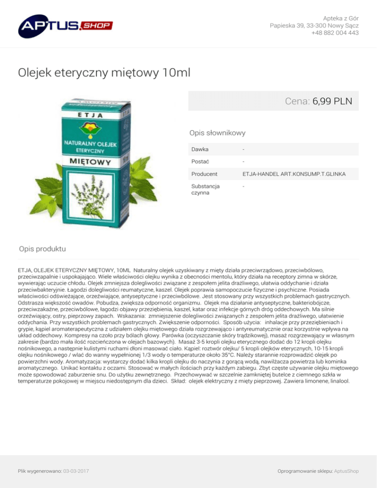 Apteka z Gór Papieska 39, 33-300 Nowy Sącz +48 882 004 443 Olejek eteryczny miętowy 10ml Cena: 6,99 PLN Opis słownikowy Dawka - Postać - Producent ETJA-HANDEL ART.KONSUMP.T.GLINKA Substancja czynna - Opis produktu ETJA, OLEJEK ETERYCZNY MIĘTOWY, 10ML Naturalny olejek uzyskiwany z mięty działa przeciwrządowo, przeciwbólowo, przeciwzapalnie i uspokajająco. Wiele właściwości olejku wynika z obecności mentolu, który działa na receptory zimna w skórze, wywierając uczucie chłodu. Olejek zmniejsza dolegliwości związane z zespołem jelita drażliwego, ułatwia oddychanie i działa przeciwbakteryjnie. Łagodzi dolegliwości reumatyczne, kaszel. Olejek poprawia samopoczucie fizyczne i psychiczne. Posiada właściwości odświeżające, orzeźwiające, antyseptyczne i przeciwbólowe. Jest stosowany przy wszystkich problemach gastrycznych. Odstrasza większość owadów. Pobudza, zwiększa odporność organizmu. Olejek ma działanie antyseptyczne, bakteriobójcze, przeciwzakaźne, przeciwbólowe, łagodzi objawy przeziębienia, kaszel, katar oraz infekcje górnych dróg oddechowych. Ma silnie orzeźwiający, ostry, pieprzowy zapach. Wskazania: zmniejszenie dolegliwości związanych z zespołem jelita drażliwego, ułatwienie oddychania. Przy wszystkich problemach gastrycznych. Zwiększenie odporności. Sposób użycia: inhalacje przy przeziębieniach i grypie, kąpiel aromaterapeutyczna z udziałem olejku miętowego działa rozgrzewająco i antyreumatycznie oraz korzystnie wpływa na układ oddechowy. Kompresy na czoło przy bólach głowy. Parówka (oczyszczanie skóry trądzikowej), masaż rozgrzewający w własnym zakresie (bardzo mała ilość rozcieńczona w olejach bazowych). Masaż 3-5 kropli olejku eterycznego dodać do 12 kropli olejku nośnikowego, a następnie kulistymi ruchami dłoni masować ciało. Kąpiel: roztwór olejku/ 5 kropli olejków eterycznych, 10-15 kropli olejku nośnikowego / wlać do wanny wypełnionej 1/3 wody o temperaturze około 35°C. Należy starannie rozprowadzić olejek po powierzchni wody. Aromatyzacja: wystarczy dodać kilka kropli olejku do naczynia z gorącą wodą, nawilżacza powietrza lub kominka aromatycznego. Unikać kontaktu z oczami. Stosować w małych ilościach przy każdym zabiegu. Zbyt częste używanie olejku miętowego może spowodować zaburzenie snu. Do użytku zewnętrznego. Przechowywać w szczelnie zamkniętej butelce z ciemnego szkła w temperaturze pokojowej w miejscu niedostępnym dla dzieci. Skład: olejek elektryczny z mięty pieprzowej. Zawiera limonene, linalool. Plik wygenerowano: 03-03-2017 Powered by TCPDF (www.tcpdf.org) Oprogramowanie sklepu: AptusShop