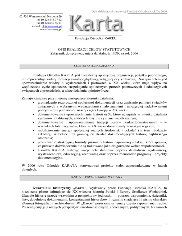 Opis działalności statutowej Fundacji Ośrodka KARTA 2006 02-536 Warszawa, ul. Narbutta 29 tel. (0 22) 848 07 12 fax (0 22) 646 65 11 e-mail: [email protected] www.karta.org.pl OPIS REALIZACJI CELÓW STATUTOWYCH Załącznik do sprawozdania z działalności FOK za rok 2006 CELE I STRATEGIA DZIAŁANIA Fundacja Ośrodka KARTA jest niezależną apolityczną organizacją pożytku publicznego, nie reprezentuje żadnej formacji światopoglądowej, religijnej czy kulturowej. Naszym celem jest upowszechnianie wiedzy o wydarzeniach i postawach w XX wieku, które mają wpływ na współczesne życie społeczne, zaspokajanie społecznych potrzeb poznawczych i edukacyjnych związanych z przeszłością, a także działania opiniotwórcze. Za najważniejsze przyjmujemy następujące kierunki działania: • gromadzenie rozproszonej społecznej dokumentacji oraz zapisanie pamięci świadków związanych z wybranymi wydarzeniami (mało znanymi i najczęściej nadużywanymi politycznie) z przeszłości naszej części Europy w XX wieku; • dokumentowanie i upowszechnianie historii osób, które ucierpiały w wyniku działania systemów totalitarnych, a których losy nie są znane współczesnym; • dokumentowanie i upowszechnianie tradycji postaw nonkonformistycznych – w warunkach totalitaryzmów, które w XX wieku dominowały w naszym regionie; • mobilizowanie energii społecznej różnych środowisk i pokoleń (w tym młodzieży szkolnej), w Polsce i za granicą, do działań dokumentujących historię najbliższego otoczenia; • promowanie atrakcyjnej formuły pisania o historii najnowszej – takiej, która sprawia, że przeszłe doświadczenia nie są traktowane jako drugorzędne wobec współczesności. • Ośrodek KARTA realizuje swoje cele statutowe poprzez działalność wydawniczą, wystawienniczą, edukacyjną, archiwalną oraz poprzez różnorodne programy i projekty dokumentacyjne. W 2006 roku Ośrodek KARATA kontynuował projekty stałe, zapoczątkowane w latach ubiegłych. KARTA — PISMO, KSIĄŻKI I WYSTAWY Kwartalnik historyczny „Karta”, wydawany przez Fundację Ośrodka KARTA, to niezależne pismo zajmujące się XX-wieczną historią Polski i Europy Środkowo-Wschodniej. Ukazuje historię przede wszystkim z perspektywy jednostki — poprzez wspomnienia, dzienniki, listy, dopełnione dokumentami, komentarzami historyków i licznymi (nadającymi pismu charakter albumu) fotografiami archiwalnymi. W „Karcie” poruszane są tematy często zapomniane, trudne. Prezentujemy je z różnych perspektyw narodowościowych, społecznych, politycznych. Na łamach 1 Opis działalności statutowej Fundacji Ośrodka KARTA 2006 pisma zabierają głos „zwykli” świadkowie historii, najważniejsze postaci wydarzeń, a także historycy analizujący je po latach. Do końca 2006 roku ukazało się 50 numerów pisma; antologia opublikowanych w „Karcie” materiałów została wydana w trzech numerach „Karty” niemieckojęzycznej, jednym numerze „Karty” po rosyjsku, a dwa bloki tematyczne — Dni Solidarności i Koniec Jałty — przygotowano w wersji angielskiej i hiszpańskiej, Dni Solidarności ukazały się również w wersji niemieckiej i ukraińskiej. W roku 2006 ukazały się numery 48–50 „Karty”. Podejmowane w piśmie tematy dotyczyły całego XX stulecia. W ubiegłym roku „Karta” utrzymywała swój albumowy charakter (w każdym numerze na 160 kolumnach około 100 fotografii), przy stałej poprawie poziomu edytorskiego. Na bazie „Karty” działa wydawnictwo, publikujące książki związane z historią XX wieku. W 2006 roku zrealizowane zostały kolejne przedsięwzięcia związane z wydawnictwami albumowymi, których inauguracja miała miejsce w 2005 roku. Zostały wydane trzy albumy: Mercedes a sprawa polska — opowieść o samochodach Benz, Daimler, Austro-Daimler i Mercedes wpisanych w losy Polski w latach 1896–2006. Album zawiera teksty źródłowe przedstawiające udział Mercedesa w życiu społecznym Polski i Polaków, a ponadto 230 zdjęć oraz niemal 100 reklam i druków ulotnych związanych z historią marki na ziemiach polskich. Stan wojenny. Ostatni atak systemu — album, za pomocą montażu tekstów źródłowych i bogatej ikonografii, ukazuje stan wojenny w czterech odsłonach: Uderzenie: 13–24 grudnia 1981; Wiosna nasza: 24 grudnia 1981 – wrzesień 1982; Zapaść: październik 1982 – sierpień 1986; Rozejm: wrzesień 1986. A Carnival under Sentence — wersja angielska albumu „Solidarność” 1980–81. Karnawał z wyrokiem o Pierwszej „Solidarności” od jej powstania w sierpniu 1980 do wprowadzenia stanu wojennego. Opozycyjny „karnawał” zestawiony został z zakonspirowanymi działaniami władzy przygotowującej się do zniszczenia „Solidarności”. Całość ilustruje ponad 450 zdjęć ulotek i plakatów. W 2006 roku Ośrodek KARTA kontynuował serie wydawnicze: „Świadectwa” — w 2006 roku trwały prace nad drugą książką w serii, tym razem dwutomową — tom I: Zamojszczyzna 1918–1943; tom II: Zamojszczyzna 1944–1959 — będącą obszernym wyborem ze wspomnień nieznanego w Polsce dziennika Zygmunta Klukowskiego, kronikarza Zamojszczyzny. Książka ukaże się w kwietniu 2007. „Żydzi polscy” — w 2006 roku ukazała się piąta książka w serii — Bunkier Chaima Icla Goldsteina. Jest to opowieść o siedmiorgu Żydów, którzy wraz z katolickim księdzem od września 1944 do 17 stycznia 1945 ukrywali się w piwnicy zrujnowanego domu przy ulicy Franciszkańskiej 8 w Warszawie. „Opozycja w PRL. Słownik biograficzny 1956–89” — W 2006 roku wydany został tom III, w którym zawartych jest 110 biogramów przedstawicieli opozycji z całej Polski, a także kalendarium opozycji w PRL 1956–89 wraz z kilkudziesięcioma zdjęciami ważnych wydarzeń tego okresu. „Polska–Ukraina: trudne pytania” — ukazał się 10 tom serii, który zawiera materiały XI międzynarodowego seminarium historyczne