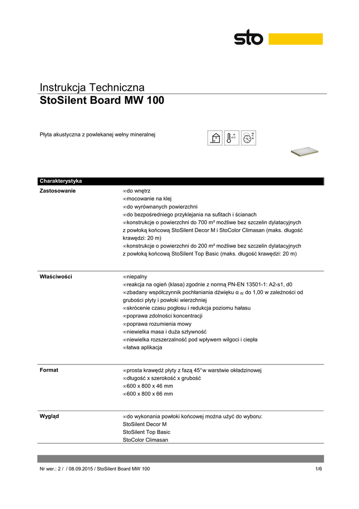 Instrukcja Techniczna StoSilent Board MW 100 Płyta akustyczna z powlekanej wełny mineralnej Charakterystyka Zastosowanie • do wnętrz • mocowanie na klej • do wyrównanych powierzchni • do bezpośredniego przyklejania na sufitach i ścianach • konstrukcje o powierzchni do 700 m² możliwe bez szczelin dylatacyjnych z powłoką końcową StoSilent Decor M i StoColor Climasan (maks. długość krawędzi: 20 m) • konstrukcje o powierzchni do 200 m² możliwe bez szczelin dylatacyjnych z powłoką końcową StoSilent Top Basic (maks. długość krawędzi: 20 m) Właściwości • niepalny • reakcja na ogień (klasa) zgodnie z normą PN-EN 13501-1: A2-s1, d0 • zbadany współczynnik pochłaniania dźwięku α W do 1,00 w zależności od grubości płyty i powłoki wierzchniej • skrócenie czasu pogłosu i redukcja poziomu hałasu • poprawa zdolności koncentracji • poprawa rozumienia mowy • niewielka masa i duża sztywność • niewielka rozszerzalność pod wpływem wilgoci i ciepła • łatwa aplikacja Format • prosta krawędź płyty z fazą 45° w warstwie okładzinowej • długość x szerokość x grubość • 600 x 800 x 46 mm • 600 x 800 x 66 mm Wygląd • do wykonania powłoki końcowej można użyć do wyboru: StoSilent Decor M StoSilent Top Basic StoColor Climasan Nr wer.: 2 / / 08.09.2015 / StoSilent Board MW 100 1/6 Instrukcja Techniczna StoSilent Board MW 100 Specyfika/informacje • nie nadaje się do stosowania na powierzchniach narażonych na obciążenia mechaniczne • nie należy stosować w kąpieliskach solankowych oraz w obszarach narażonych na bezpośrednie działanie wody Dane techniczne Norma/ przepis Wartość/ kontrolny Jednostka EN ISO 7783-2 < 2,0 m Reakcja na ogień (klasa) PN-EN 13501-1 A2-s1, d0 niepalny Wartość obliczeniowa TIAP-655 w oparciu przewodności cieplnej λ o EN 12667 0,040 W/(m*K) z powłoką Ciężar powierzchniowy 6,0 kg/m² 46 mm Ciężar powierzchniowy 7,9 kg/m² 66 mm Gęstość objętościowa 130 kg/m³ 46 mm Gęstość objętościowa 120 kg/m³ 66 mm Kryterium Równoważna dyfuzyjnie grubość warstwy powietrza Informacje z powłoką może różnić się w zależności od Współczynnik pochłaniania dźwięku α W powłoki, PN-EN ISO 11654 1,0 grubości i opcjonalnej wysokości zawieszenia Nr wer.: 2 / / 08.09.2015 / StoSilent Board MW 100 2/6 Instrukcja Techniczna StoSilent Board MW 100 Współczynnik pochłaniania może różnić się dźwięku NRC w zależności od powłoki, ASTM C423 1,00 grubości i opcjonalnej wysokości zawieszenia Podane parametry są wartościami średnimi albo przybliżonymi. Z uwagi na zastosowanie w naszych produktach naturalnych surowców, rzeczywiste wartości w poszczególnych dostawach mogą nieznacznie odbiegać od podanych, co jednak nie ma wpływu na przydatność produktu. Podłoże Wymagania Podłoże musi być zwarte, bardzo równe, stabilne, czyste, wolne od mleczka cementowego, wykwitów i substancji adhezyjnych, a także suche. Przyczepność do podłoża musi wynosić ≥min. 5 kPa Szczeliny dylatacyjne i oddzielające muszą zostać zachowane. Szczegółowa specyfikacja podana jest w wytycznych dotyczących obróbki. Przygotowania Stare podłoża: luźne fragmenty powłok jak również nienośne stare powłoki usunąć (mechanicznie lub za pomocą specjalnego środka chemicznego) a powierzchnię zmyć. Bardzo chłonne podłoża należy zagruntować środkiem StoSilent Prim. Beton: Za pomocą strumienia pary usunąć zanieczyszczenia z oleju szalunkowego, smaru i wosku. Niewielkie defekty i jamy usadowe wypełnić środkiem StoLevell In Z. Zagruntować środkiem StoPrim Plex. Na gładkim i/lub słabo chłonnym podłożu bezwzględnie konieczne jest zastosowanie mostka sczepnego ze środka StoSilent Prep Quarz. Płyty gipsowo-kartonowe: Maksymalny dopuszczalny odstęp szyn nośnych: 30 cm. Po szpachlowaniu należy zeszlifować wszelkie chropowatości. Powierzchnię płyt gipsowo-kartonowych oraz przeszlifowane miejsca szpachlowania należy zagruntować środkiem StoPrim Plex. Następnie nanieść powłokę pośrednią StoSilent Prep Quarz. Tynki gipsowe oraz gotowe tynki z grupy zapraw PG IV + V: Zeszlifować ewentualną zgorzelinę, odpylić i zagruntować środkiem StoPrim Plex, a następnie nanieść powłokę pośrednią StoSilent Prep Quarz. Ponadto należy zapoznać się z wytycznymi Federalnego Komitetu Farb i Ochrony (BFS) oraz instrukcją Federalnego Stowarzyszenia Przemysłu Gipsowego. Nr wer.: 2 / / 08.09.2015 / StoSilent Board MW 100 3/6 Instrukcja Techniczna StoSilent Board MW 100 Podłoże betonowe należy przygotować, stosując odpowiednią technikę zgodnie z przepisami ZTV-ING, część 3, rozdział 4. Aplikacja Temperatura aplikacji Najniższa temperatura obróbki i podłoża: +12 °C, przy wzgl ędnej wilgotności powietrza maks. 70 %; montaż po ustabilizowaniu się wilgotności równoważnej w pomieszczeniu. Szybkie, szokowe ogrzewanie lub schładzanie w trakcie montażu i wysychania może spowodować powstawanie rys. Zużycie Wykonanie Zużycie ok. 1,00 m²/m² Podane wartości dotyczące zużycia służą jedynie orientacji. Dokładne wartości dotyczące zużycia z uwzględnieniem odpadów należy ustalić w konkretnym obiekcie. Struktura powłok System: StoSilent Direct Środek gruntujący: W zależności od rodzaju i stanu podłoża ewentualne gruntowanie należy wykonać środkiem StoSilent Prim. Klej systemowy: StoSilent Coll MW (ok. 3,0 – 4,0 kg/m²) Akustyczna płyta podtynkowa: StoSilent Board MW 100 Systemowa szpachla do fugowania: StoSilent Filler (ok. 0,1 kg/m²) Powłoka pośrednia: StoSilent Top Basic (ok. 2,0 – 3,0 kg/m²) Niewymagane w przypadku powłok końcowych wykonanych przy użyciu StoColor Climasan. do wykonania powłoki końcowej można użyć do wyboru: StoSilent Decor M (0,8 - 0,9 kg/m² na cykl natrysku dyszą 6 mm) StoColor Climasan (natrysk w dwóch etapach) Aplikacja Płyty akustyczne w zależności od po