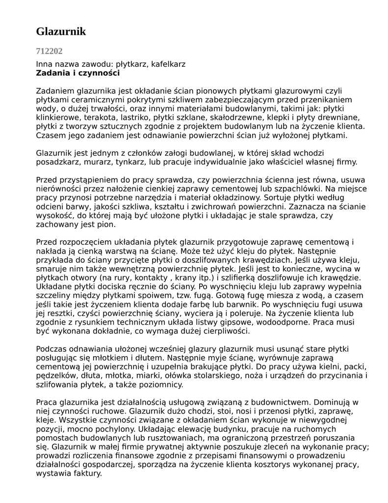 Glazurnik 712202 Inna nazwa zawodu: płytkarz, kafelkarz Zadania i czynności Zadaniem glazurnika jest okładanie ścian pionowych płytkami glazurowymi czyli płytkami ceramicznymi pokrytymi szkliwem zabezpieczającym przed przenikaniem wody, o dużej trwałości, oraz innymi materiałami budowlanymi, takimi jak: płytki klinkierowe, terakota, lastriko, płytki szklane, skałodrzewne, klepki i płyty drewniane, płytki z tworzyw sztucznych zgodnie z projektem budowlanym lub na życzenie klienta. Czasem jego zadaniem jest odnawianie powierzchni ścian już wyłożonej płytkami. Glazurnik jest jednym z członków załogi budowlanej, w której skład wchodzi posadzkarz, murarz, tynkarz, lub pracuje indywidualnie jako właściciel własnej firmy. Przed przystąpieniem do pracy sprawdza, czy powierzchnia ścienna jest równa, usuwa nierówności przez nałożenie cienkiej zaprawy cementowej lub szpachlówki. Na miejsce pracy przynosi potrzebne narzędzia i materiał okładzinowy. Sortuje płytki według odcieni barwy, jakości szkliwa, kształtu i zwichrowań powierzchni. Zaznacza na ścianie wysokość, do której mają być ułożone płytki i układając je stale sprawdza, czy zachowany jest pion. Przed rozpoczęciem układania płytek glazurnik przygotowuje zaprawę cementową i nakłada ją cienką warstwą na ścianę. Może też użyć kleju do płytek. Następnie przykłada do ściany przycięte płytki o doszlifowanych krawędziach. Jeśli używa kleju, smaruje nim także wewnętrzną powierzchnię płytek. Jeśli jest to konieczne, wycina w płytkach otwory (na rury, kontakty , krany itp.) i szlifierką doszlifowuje ich krawędzie. Układane płytki dociska ręcznie do ściany. Po wyschnięciu kleju lub zaprawy wypełnia szczeliny między płytkami spoiwem, tzw. fugą. Gotową fugę miesza z wodą, a czasem jeśli takie jest życzeniem klienta dodaje farbę lub barwnik. Po wyschnięciu fugi usuwa jej resztki, czyści powierzchnię ściany, wyciera ją i poleruje. Na życzenie klienta lub zgodnie z rysunkiem technicznym układa listwy gipsowe, wodoodporne. Praca musi być wykonana dokładnie, co wymaga dużej cierpliwości. Podczas odnawiania ułożonej wcześniej glazury glazurnik musi usunąć stare płytki posługując się młotkiem i dłutem. Następnie myje ścianę, wyrównuje zaprawą cementową jej powierzchnię i uzupełnia brakujące płytki. Do pracy używa kielni, packi, pędzelków, dłuta, młotka, miarki, ołówka stolarskiego, noża i urządzeń do przycinania i szlifowania płytek, a także poziomnicy. Praca glazurnika jest działalnością usługową związaną z budownictwem. Dominują w niej czynności ruchowe. Glazurnik dużo chodzi, stoi, nosi i przenosi płytki, zaprawę, kleje. Wszystkie czynności związane z okładaniem ścian wykonuje w niewygodnej pozycji, mocno pochylony. Układając elewację budynku, pracuje na ruchomych pomostach budowlanych lub rusztowaniach, ma ograniczoną przestrzeń poruszania się. Glazurnik w małej firmie prywatnej aktywnie poszukuje zleceń na wykonanie pracy; prowadzi rozliczenia finansowe zgodnie z przepisami finansowymi o prowadzeniu działalności gospodarczej, sporządza na życzenie klienta kosztorys wykonanej pracy, wystawia faktury. Wymagania psychologiczne Ze względu na konieczność szybkiego i sprawnego wykonywanie różnych czynności w czasie okładania ścian glazurą w pracy glazurnika jest niezbędna koordynacja wzrokowo-ruchowa i duża zręczność rąk. Przydatne jest także widzenie barw (rozróżnianie odcieni, nasycenia barw płytek) i poczucie estetyki. Glazurnik nierzadko musi pracować na wysokości (na rusztowaniach, drabinach lub ruchomych pomostach budowlanych). Dlatego w tej pracy niezbędny jest brak lęku przed wysokością, dobry zmysł równowagi, jak również widzenie stereoskopowe umożliwiające prawidłową ocenę odległości. Ze względu na cel pracy, jakim jest prawidłowe i w miarę szybkie pokrycie powierzchni ścian glazurą, niezbędna jest wytrzymałość na długotrwały wysiłek. Glazurnik nie może przerwać pracy, gdy odczuje zmęczenie, dlatego że nałożona zaprawa lub warstwa kleju może wyschnąć i trzeba będzie zaczynać pracę od nowa. Czynności musi wykonywać dokładnie i precyzyjnie, jeśli np. zlekceważy nierówności powierzchni płytek i nie wyrówna ich, uzyska nierówne, faliste powierzchnie i jego praca nie zostanie przyjęta przez brygadzistę lub klienta. Inną niezbędną cechą jest cierpliwość i umiejętność wykonywania pracy monotonnej (trwające wiele godzin układanie płytek jedna przy drugiej, powielanie tych samych czynności) oraz związana z tym zdolność koncentracji uwagi. Glazurnik powinien wykonywać czynności zgodnie z określonymi zasadami technologicznymi. Dlatego też musi mieć umiejętność podporządkowywania się. W tym zawodzie przydatne są zainteresowania techniczne. Kandydaci do pracy powinni lubić pracę w ruchu i umieć korzystać z różnego rodzaju narzędzi i przyrządów technicznych. Wymagania fizyczne i zdrowotne Praca glazurnika jest zaliczana do ciężkich. Największe znaczenie w tym zawodzie ma ogólna dobra sprawność fizyczna, duża sprawność układu kostno-stawowego i układu mięśniowego. Przydatna jest także sprawność w zakresie narządu dotyku i wzroku, a niezbędna jest dobra sprawność narządu równowagi. Bezwzględne przeciwwskazania do podjęcia pracy w tym zawodzie dotyczą osób mających: lęk wysokości (np. przy pracach na rusztowaniach), zaburzenia i uszkodzenia narządu równowagi, silne, nie nadające się do korekcji wady wzroku, choroby skóry, alergie. Przeciwwskazaniem względnym są choroby układu krążenia i oddechowego. Osoby niedosłyszące mają możliwość podjęcia pracy w tym zawodzie. Warunki podjęcia pracy w zawodzie Do podjęcia pracy glazurnika niezbędne jest posiadanie co najmniej gimnazjalnego wykształcenia. Nie jest wymagany kurs glazurnika, jeśli chce si