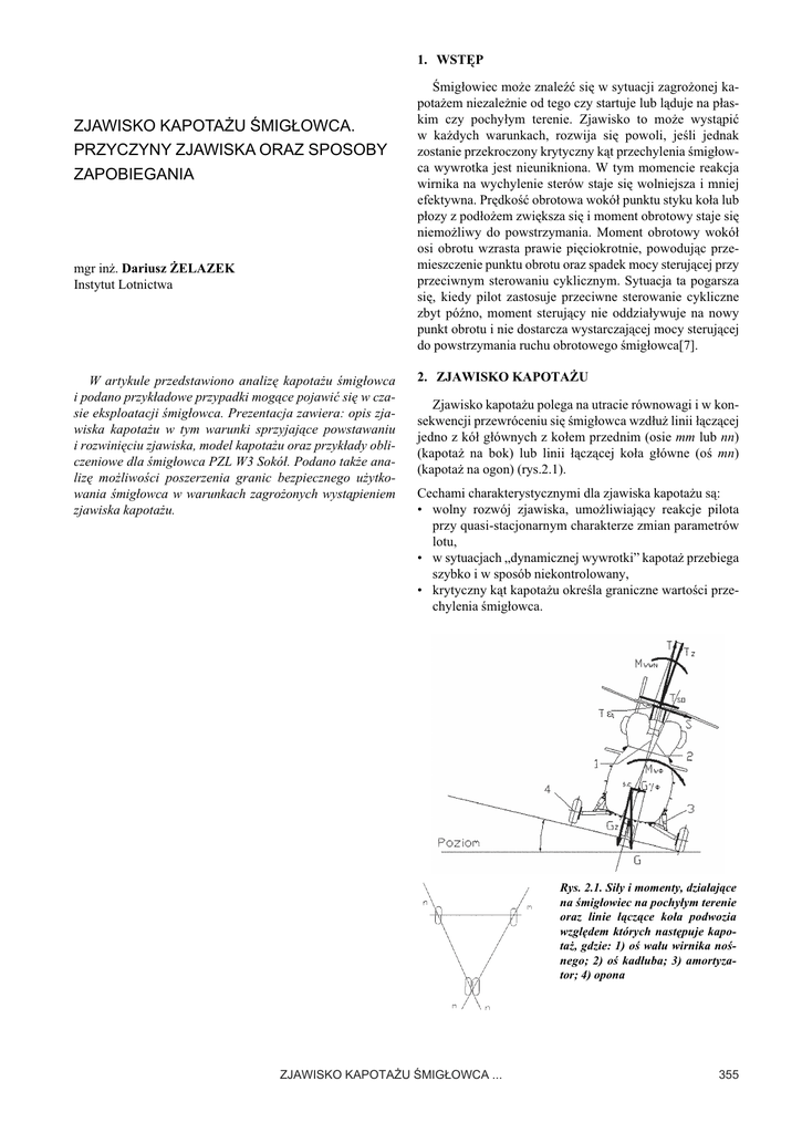 1. WSTĘP ZJAWISKO KAPOTAŻU ŚMIGŁOWCA. PRZYCZYNY ZJAWISKA ORAZ SPOSOBY ZAPOBIEGANIA mgr inż. Dariusz ŻELAZEK Instytut Lotnictwa W artykule przedstawiono analizę kapotażu śmigłowca i podano przykładowe przypadki mogące pojawić się w czasie eksploatacji śmigłowca. Prezentacja zawiera: opis zjawiska kapotażu w tym warunki sprzyjające powstawaniu i rozwinięciu zjawiska, model kapotażu oraz przykłady obliczeniowe dla śmigłowca PZL W3 Sokół. Podano także analizę możliwości poszerzenia granic bezpiecznego użytkowania śmigłowca w warunkach zagrożonych wystąpieniem zjawiska kapotażu. Śmigłowiec może znaleźć się w sytuacji zagrożonej kapotażem niezależnie od tego czy startuje lub ląduje na płaskim czy pochyłym terenie. Zjawisko to może wystąpić w każdych warunkach, rozwija się powoli, jeśli jednak zostanie przekroczony krytyczny kąt przechylenia śmigłowca wywrotka jest nieunikniona. W tym momencie reakcja wirnika na wychylenie sterów staje się wolniejsza i mniej efektywna. Prędkość obrotowa wokół punktu styku koła lub płozy z podłożem zwiększa się i moment obrotowy staje się niemożliwy do powstrzymania. Moment obrotowy wokół osi obrotu wzrasta prawie pięciokrotnie, powodując przemieszczenie punktu obrotu oraz spadek mocy sterującej przy przeciwnym sterowaniu cyklicznym. Sytuacja ta pogarsza się, kiedy pilot zastosuje przeciwne sterowanie cykliczne zbyt późno, moment sterujący nie oddziaływuje na nowy punkt obrotu i nie dostarcza wystarczającej mocy sterującej do powstrzymania ruchu obrotowego śmigłowca[7]. 2. ZJAWISKO KAPOTAŻU Zjawisko kapotażu polega na utracie równowagi i w konsekwencji przewróceniu się śmigłowca wzdłuż linii łączącej jedno z kół głównych z kołem przednim (osie mm lub nn) (kapotaż na bok) lub linii łączącej koła główne (oś mn) (kapotaż na ogon) (rys.2.1). Cechami charakterystycznymi dla zjawiska kapotażu są: • wolny rozwój zjawiska, umożliwiający reakcje pilota przy quasi-stacjonarnym charakterze zmian parametrów lotu, • w sytuacjach „dynamicznej wywrotki” kapotaż przebiega szybko i w sposób niekontrolowany, • krytyczny kąt kapotażu określa graniczne wartości przechylenia śmigłowca. Rys. 2.1. Siły i momenty, działające na śmigłowiec na pochyłym terenie oraz linie łączące koła podwozia względem których następuje kapotaż, gdzie: 1) oś wału wirnika nośnego; 2) oś kadłuba; 3) amortyzator; 4) opona ZJAWISKO KAPOTAŻU ŚMIGŁOWCA ... 355 2.1. Warunki krytyczne Przy stałych parametrach pracy systemu napędowego i wirnika, sumaryczny moment wywracający jest zależny od możliwości sterowania przeciwkapotażowego wektorem ciągu wirnika i momentem głowicy [1]. Przy wyłączonym napędzie o kapotażu decydują momenty przewracające od sił masowych. Zatem krytyczny kąt kapotażu przy pracującym układzie napędowym jest inny niż przy wyłączonym napędzie. Na wielkość krytycznego kąta kapotażu decydujący wpływ ma ciąg wirnika nośnego T. Zależność tę można przedstawić wyrażeniem: gdzie: Rys. 2.2. Warunki krytyczne w których może dojść do kapotażu Podczas startów do zawisu i lądowań z zawisu na płaskim oraz na pochylonym terenie (rys. 2.2) kapotaż, może wystąpić, jeżeli śmigłowiec zacznie obracać się wokół koła bądź płozy będącej w kontakcie z podłożem, a ruch obrotowy nie zostanie powstrzymany poprzez odchylenie tarczy sterującej w lewo. Śmigłowiec zagrożony jest zjawiskiem kapotażu w sytuacjach kiedy: • poprzeczny środek ciężkości znajduje się po lewej stronie, • boczny wiatr z lewej strony, • wykonuje zawis jednocześnie dotykając jednym kołem lub płozą podłoża, • siła ciągu równoważy ciężar, • kąt nachylenia podłoża przekroczy wartości krytyczne kąta nachylenia śmigłowca. 2.2. Krytyczny kąt kapotażu K Kryty czny kąt kapotażu γ kr definiowany jest jako kąt, po którego przekroczeniu pilot nie jest w stanie powstrzymać prędkości obrotowej śmigłowca obracającego się wokół punktu obrotu, którym jest opona lub płoza. Kąt ten w zależności od typu śmigłowca wynosi od kilku do kilkunastu stopni i zmienia się wraz z ciężarem śmigłowca i siłą ciągu wirnika nośnego. γ krK = γ krK (T ) (2.1) γ krK – krytyczny kąt kapotażu. Kąt przechylenia śmigłowca, przy którym zeruje się suma momentu przewracającego i momentu powracającego, T – ciąg wirnika nośnego. Drugą zmienną, od wielkości której zależą właściwości kapotażowe śmigłowca, jest jego ciężar. Dlatego też zależność (2.1) przyjmuje postać: T γ krK = γ krK G gdzie: G – ciężar śmigłowca. (2.2) 3. SYTUACJE ZAGROŻONE KAPOTAŻEM PODCZAS UŻYTKOWANIA ŚMIGŁOWCA 3.1. Kapotaż statyczny Jeżeli na stojący w bezruchu śmigłowiec zacznie działać odpowiednia co do wielkości i kierunku siła zewnętrzna, śmigłowiec zacznie się przechylać dokonując obrotu wokół osi określonej przez punkty podparcia. W przypadku śmigłowca o podwoziu trójkołowym, oś obrotu wyznaczać będą punkty styku z ziemią pneumatyków goleni przedniej i wewnętrznej w stosunku do obrotu goleni podwozia głównego [1]. Do pewnego kąta przechylenia odjęcie siły zewnętrznej wywoła samoczynny powrót śmigłowca do stanu równowagi. (rys. 3.1). Rys. 3.1. Samoczynny powrót śmigłowca do stanu równowagi (statyczny kąt kapotażu nie został przekroczony) (opracowanie własne) 356 PRACE INSTYTUTU LOTNICTWA Nr 194 – 195 Rys. 3.2. Kapotaż śmigłowca w wyniku przekroczenia statycznego kąta kapotażu Powodem tego samoczynnego powrotu jest efekt istnienia momentu powracającego, którego pokonanie wymagało przyłożenia siły zewnętrznej. Moment powracający w miarę przechylenia śmigłowca maleje i przy określonym kącie obrotu przyjmuje wartość zero. Powyżej tego kąta moment powracający przybiera wartość ujemną i staje się momentem wywracaj