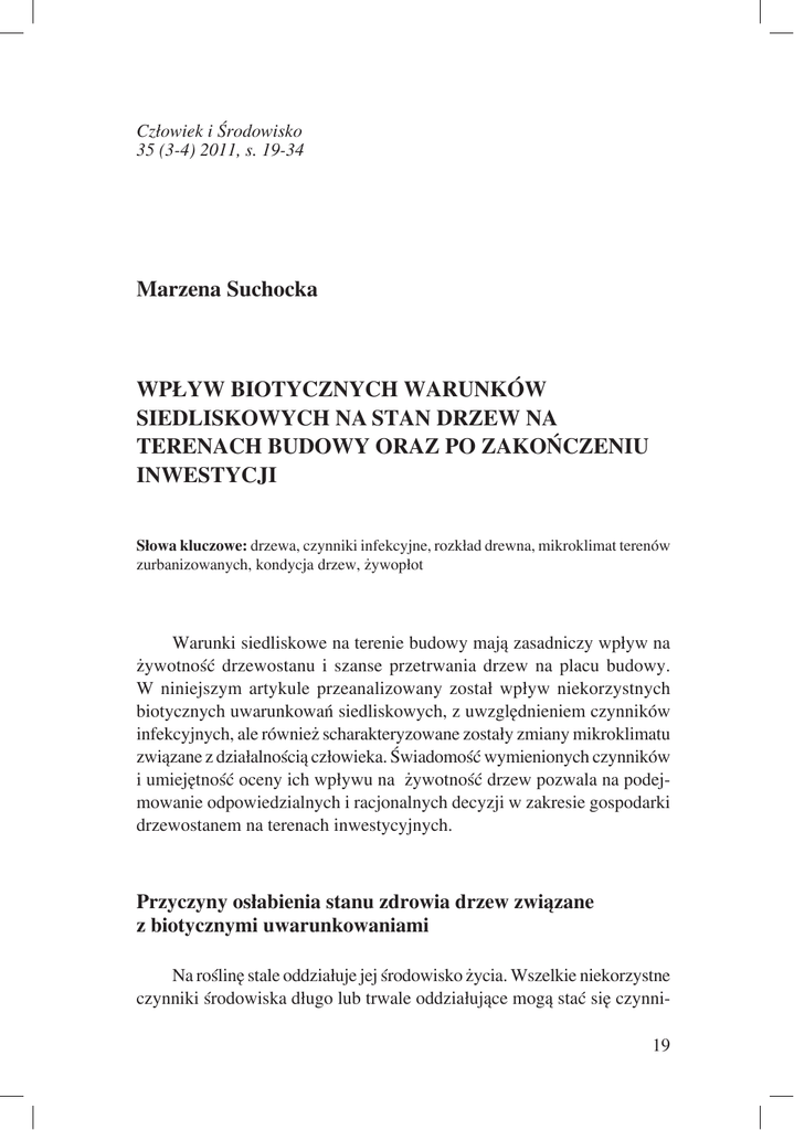 Wpływ biotycznych warunków siedliskowych na stan drzew na terenach budowy... Człowiek i Środowisko 35 (3-4) 2011, s. 19-34 Marzena Suchocka WPŁYW BIOTYCZNYCH WARUNKÓW SIEDLISKOWYCH NA STAN DRZEW NA TERENACH BUDOWY ORAZ PO ZAKOŃCZENIU INWESTYCJI Słowa kluczowe: drzewa, czynniki infekcyjne, rozkład drewna, mikroklimat terenów zurbanizowanych, kondycja drzew, żywopłot Warunki siedliskowe na terenie budowy mają zasadniczy wpływ na żywotność drzewostanu i szanse przetrwania drzew na placu budowy. W niniejszym artykule przeanalizowany został wpływ niekorzystnych biotycznych uwarunkowań siedliskowych, z uwzględnieniem czynników infekcyjnych, ale również scharakteryzowane zostały zmiany mikroklimatu związane z działalnością człowieka. Świadomość wymienionych czynników i umiejętność oceny ich wpływu na żywotność drzew pozwala na podejmowanie odpowiedzialnych i racjonalnych decyzji w zakresie gospodarki drzewostanem na terenach inwestycyjnych. Przyczyny osłabienia stanu zdrowia drzew związane z biotycznymi uwarunkowaniami Na roślinę stale oddziałuje jej środowisko życia. Wszelkie niekorzystne czynniki środowiska długo lub trwale oddziałujące mogą stać się czynni19 Marzena Suchocka kami chorobotwórczymi. Czynniki chorobotwórcze mogą mieć podłoże genetyczne lub pochodzenie abiotyczne i wówczas są to czynniki nieinfekcyjne. Czynniki infekcyjne natomiast, mające pochodzenie biotyczne, są wywołane działaniem patogenów, grzybów, bakterii, pierwotniaków czy wirusów chorobotwórczych (Kryczyński, 2005). W przypadku drzew rosnących w warunkach miejskich niekorzystnie czynniki siedliskowe wywołują u roślin reakcję stresową i obniżają ich odporność na choroby i infekcje. Arboryści zgodnie twierdzą, że wśród czynników biotycznych największe znaczenie ma infekcja grzybowa prowadząca do rozkładu drewna. W miastach jest ona często następstwem uszkodzeń mechanicznych lub złych warunków środowiskowych osłabiających odporność drzewa. Wśród drzew uszkodzonych zgnilizną najliczniejszą (75%) grupę stanowią drzewa z uszkodzonym systemem korzeniowym (Smiley i Frädrich, 1993). Większość autorów (Mattheck i Breloer, 1994; Lekes i Dandul, 1999; Hubrig, 2004) zgodnie twierdzi, że główne czynniki prowadzące do osłabienia kondycji (zarówno zdrowotności, jak i stabilności) drzew to: • właściwości siedliska (w tym niekorzystne warunki mikroklimatyczne); • wady drzewa (uszkodzenia wywołane przez czynniki abiotyczne, biotyczne i antropogeniczne); • właściwości gatunków drzew (różne właściwości mechaniczne drewna, różna wytrzymałość różnych gatunków drzew na niesprzyjające warunki otoczenia i zachodzące w nim zmiany). Niektórzy (np. Siewniak, 1996; Urban, 2008) wyodrębniają dodatkową grupę przyczyn szczególnie istotnych dla drzew rosnących na terenach zurbanizowanych: wadliwe zabiegi pielęgnacyjne (nieumiejętne cięcia, nieprawidłowe nawadnianie, usuwanie drzew sąsiednich) oraz błędy projektowe (nieodpowiednia przestrzeń). Z kolei Siewniak (1996), wymieniając główne powody zamierania drzew w miastach, podzielił je na te, które odnoszą się do: • korony drzewa: ograniczona przestrzeń dla rozwoju korony, przesuszenie (kseryzm), • korzeni: w tym ograniczona przestrzeń dla rozwoju korzeni wraz z nieprzepuszczalnością nawierzchni i zagęszczeniem gleby, uszkodzenia mechaniczne, • pnia: narażenie na kolizje i wandalizm. Duży wpływ na stan drzewa ma jego pielęgnacja, w tym takie zabiegi pielęgnacyjne jak cięcia. Cięcie bywa konieczne, ale zawsze jest mniej 20 Wpływ biotycznych warunków siedliskowych na stan drzew na terenach budowy... lub bardziej szkodliwe dla drzewa. Przez odcięcie konaru lub grubej gałęzi zostaje zakłócona równowaga biologiczna rośliny. Jest to zabieg zdecydowanie nadużywany lub wykonywany nieprawidłowo (Suchocka, 2010). Do najczęstszych błędów zalicza się przeprowadzanie cięć w nieodpowiednim terminie i zbyt drastyczne cięcia (silna redukcja korony, ogławianie) (Kosmala, 2007). Czynniki antropogeniczne Jak już wspomniano, ograniczenie przestrzeni rozwoju korzeni to czynnik, który również niekorzystnie wpływa na rozwój drzew (Coder, 1996; Krizek i Dubik, 1987; Lindsey i Bassuk, 1992; Trowbridge i Bassuk, 2004; Randrup, 2005; Urban, 2008; Kosmala, 2009b). Niewielka ilość miejsca, którym dysponują drzewa, a szczególnie niewielkie rozmiary mis nie są w stanie zapewnić odpowiednich warunków do rozwoju korzeni. Z badań wynika, że istotny wpływ na kondycję drzew ma pokrycie powierzchni terenu, jak trawnik, płyty chodnikowe, asfalt czy wielkość powierzchni odkrytego terenu, na którym rosną drzewa (Dmuchowski i Badurek, 2001; Celestian i Martin, 2004). Celestian i Martin (2004) stwierdzili, że latem temperatura gleby oddalonej 1 m od asfaltu przekroczyła 40˚C. Temperatura ta jest progiem krytycznym dla tkanek korzeni i może spowodować bezpośrednie i pośrednie uszkodzenia skutkujące fizjologicznymi i chemicznymi zmianami wpływającymi na rozwój całego drzewa. W badaniach znaczenie miało również oddalenie od krawędzi ulicy. Drzewa rosnące dalej od jezdni miały korony zdrowsze od rosnących przy krawędzi jezdni, w pierwszym szpalerze (Dmuchowski i Badurek, 2001; Bąkowska, 2004). Częste uszkodzenia mechaniczne drzew związane są z bezpośrednim oddziaływaniem pojazdów i przechodniów, w tym wandalizmu, a także rozmaitymi pracami budowlanymi (Dmuchowski, 2001; Randrup, 2005; Borowski i Latocha, 2006; Kosmala, Rosłon-Szeryńska, Suchocka, 2010). 21 Marzena Suchocka Mikroklimat terenów zurbanizowanych Proces inwestycyjny prowadzi do zmiany użytkowania terenu. Po zakończeniu budowy warunki mikroklimatyczne ulegają zmianie, a w związku z większym natężeniem antropopresji są one zazwyczaj mniej korzystne dla rozwoju drzew (Cregg i Dix, 2001). Zmieniają się warunki nasłoneczn