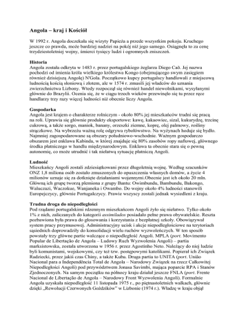 Angola – kraj i Kościół W 1992 r. Angola doczekała się wizyty Papieża a przede wszystkim pokoju. Kruchego jeszcze co prawda, może bardziej nadziei na pokój niż jego samego. Osiągnęła to za cenę trzydziestoletniej wojny, śmierci tysięcy ludzi i ogromnych zniszczeń. Historia Angola została odkryta w 1483 r. przez portugalskiego żeglarza Diego Caõ. Jej nazwa pochodzi od imienia króla wielkiego królestwa Kongo (obejmującego swym zasięgiem również dzisiejszą Angolę) N'Gola. Początkowo kupcy portugalscy handlowali z miejscową ludnością kością słoniową i złotem, ale w 1574 r. zmusili jej władców do uznania zwierzchnictwa Lizbony. Wtedy rozpoczął się również handel niewolnikami, wysyłanymi głównie do Brazylii. Ocenia się, że w ciągu trzech wieków przewinęło się tu przez ręce handlarzy trzy razy więcej ludności niż obecnie liczy Angola. Gospodarka Angola jest krajem o charakterze rolniczym - około 80% jej mieszkańców trudni się pracą na roli. Uprawia się głównie produkty eksportowe: kawę, kakaowiec, sizal, kukurydzę, trzcinę cukrową, a także sorgo, maniok, banany, orzeszki ziemne, koprę, olej palmowy, rośliny strączkowe. Na wybrzeżu ważną rolę odgrywa rybołówstwo. Na wyżynach hoduje się bydło. Najmniej zagospodarowane są obszary południowo-wschodnie. Ważnym gospodarczo obszarem jest enklawa Kabinda, w której znajduje się 80% zasobów ropy naftowej, głównego środka płatniczego w handlu międzynarodowym. Enklawa ta obecnie stara się o pewną autonomię, co może utrudnić i tak niełatwą sytuację płatniczą Angoli. Ludność Mieszkańcy Angoli zostali zdziesiątkowani przez długoletnią wojnę. Według szacunków ONZ 1,8 miliona osób zostało zmuszonych do opuszczenia własnych domów, a życie 4 milionów uznaje się za dotknięte działaniami wojennymi.Obecnie jest ich około 20 mln. Główną ich grupę tworzą plemiona z grupy Bantu: Owimbundu, Bambundu, Bakongo, Waluczazi, Waczokue, Wanjaneka i Owambo. Do wojny około 4% ludności stanowili Europejczycy, głównie Portugalczycy. Prawie wszyscy zostali jednak wysiedleni z kraju. Trudna droga do niepodległości Pod rządami portugalskimi rdzennym mieszkańcom Angoli żyło się niełatwo. Tylko około 1% z nich, zaliczanych do kategorii assimilados posiadało pełne prawa obywatelskie. Reszta pozbawiona była prawa do głosowania i korzystania z bezpłatnej szkoły. Obowiązywał system pracy przymusowej. Administracyjny ucisk i akcje niepodległościowe na terytoriach sąsiednich doprowadziły do konsolidacji wielu ruchów wyzwoleńczych. W ten sposób powstały trzy główne partie walczące o niepodległość Angoli. MPLA (port. Movimento Popular de Libertação de Angola – Ludowy Ruch Wyzwolenia Angoli) – partia marksistowska, została utworzona w 1956 r. przez Agostinho Neto. Należący do niej ludzie byli komunistami, wojskowymi, czy też tzw. postępowymi katolikami. Popierał ich Związek Radziecki, przez jakiś czas Chiny, a także Kuba. Druga partia to UNITA (port. União Nacional para a Independência Total de Angola – Narodowy Związek na rzecz Całkowitej Niepodległości Angoli) pod przywództwem Jonasa Savimbi, mająca poparcie RPA i Stanów Zjednoczonych. Na samym początku na północy kraju działał jeszcze FNLA (port. Frente Nacional de Libertação de Angola – Narodowy Front Wyzwolenia Angoli). Formalnie Angola uzyskała niepodległość 11 listopada 1975 r., po piętnastoletnich walkach, głównie dzięki „Rewolucji Czerwonych Goździków” w Lizbonie (1974 r.). Władzę w kraju objął Agostino Neto, przywódca MPLA, proklamując Ludową Republikę Angoli. Pierwszym posunięciem nowych władz było zmuszenie do opuszczenia kraju około 600 tys. Portugalczyków. W opozycji znalazła się wówczas UNITA. Wyniszczająca wojna domowa Kiedy formacje UNITY zbliżały się do Luandy i zagroziły rządom MPLA, Neto poprosił o pomoc Kubę. Fidel Castro wysłał tam 35 tys. żołnierzy, podobnym krokiem odpowiedziała RPA, wspomagając UNITĘ. MPLA przy pomocy Kubańczyków, a także dzięki wsparciu ZSRR, NRD i PRL wyparło UNITĘ z blisko 2/3 obszaru kraju. Tak rozpoczęła się wyniszczająca cały kraj wojna domowa, która trwała aż 16 lat i zakończyła się w 1991 r. Po rozpadzie Związku Radzieckiego strony zaczęły szukać możliwości rozwiązania konfliktu. Wycofano wojska Kuby i RPA. Negocjacje pokojowe prowadzono w Lizbonie pod auspicjami ONZ i przy współudziale Portugalii. Doprowadziły one do ustalenia rozejmu na 15 maja 1991 r. i wyznaczenia wolnych wyborów na wrzesień 1992 r. Efekty wojny wyzwoleńczej i domowej były przerażające. Szacuje się, że w ciągu tych 30 lat straciło życie 350 tys. ludzi, 80 tys. zostało inwalidami, 400 tys. zbiegło za granicę a około 2 mln musiało opuścić swoje miejsca zamieszkania. Wojna stała się też powodem wielkiej biedy. Te właśnie ofiary wspominał Jan Paweł II podczas tej Mszy św. sprawowanej w Huambo zachęcając do modlitwy „za tych braci i siostry, którzy na umęczonej, angolskiej ziemi stali się ofiarami, często niewinnymi, konfliktu ideologicznego i wojny: ich liczba sięga dziesiątków tysięcy”. Jednak wkrótce po wyborach prezydenckich wygranych przez przedstawiciela MPLA, walki wybuchły na nowo. Zakończono je w roku 1994 podpisaniem porozumienia pokojowego w Lusace. Cztery lata później niestety walki znów wybuchły z nową siłą. W 2002 roku śmierć przywódcy UNITA doprowadziła do kolejnego zawieszenia broni. Sytuacja w kraju zaczęła ulegać poprawie. Sytuacja w kraju zaczęła ulegać poprawie, jednakże prezydent José Eduardo dos Santos nie zdecydował się na przywrócenie demokratycznego sposobu sprawowania władzy. Wolne wybory odbyły, się we wrześniu 2008 r. Początki Kościoła w Angoli Odnosząc się do Uroczystości Zesłania Ducha Świętego, sprawowanej w Luandzie w 1992 r., Jan Paweł II powiedział, i