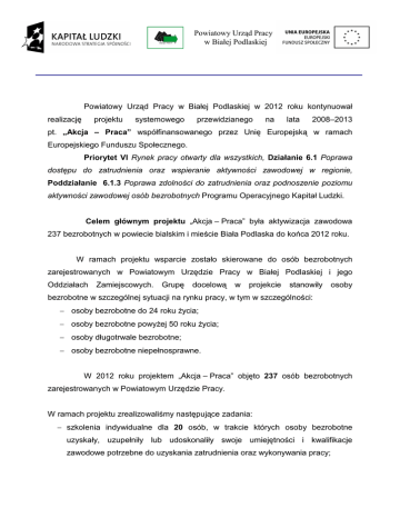 Powiatowy Urząd Pracy w Białej Podlaskiej Powiatowy Urząd Pracy w Białej Podlaskiej w 2012 roku kontynuował realizację projektu systemowego przewidzianego na lata 2008–2013 pt. „Akcja – Praca” współfinansowanego przez Unię Europejską w ramach Europejskiego Funduszu Społecznego. Priorytet VI Rynek pracy otwarty dla wszystkich, Działanie 6.1 Poprawa dostępu do zatrudnienia oraz wspieranie aktywności zawodowej w regionie, Poddziałanie 6.1.3 Poprawa zdolności do zatrudnienia oraz podnoszenie poziomu aktywności zawodowej osób bezrobotnych Programu Operacyjnego Kapitał Ludzki. Celem głównym projektu „Akcja – Praca” była aktywizacja zawodowa 237 bezrobotnych w powiecie bialskim i mieście Biała Podlaska do końca 2012 roku. W ramach projektu wsparcie zostało skierowane do osób bezrobotnych zarejestrowanych w Powiatowym Urzędzie Pracy w Białej Podlaskiej i jego Oddziałach Zamiejscowych. Grupę docelową w projekcie stanowiły osoby bezrobotne w szczególnej sytuacji na rynku pracy, w tym w szczególności: − osoby bezrobotne do 24 roku Ŝycia; − osoby bezrobotne powyŜej 50 roku Ŝycia; − osoby długotrwale bezrobotne; − osoby bezrobotne niepełnosprawne. W 2012 roku projektem „Akcja – Praca” objęto 237 osób bezrobotnych zarejestrowanych w Powiatowym Urzędzie Pracy. W ramach projektu zrealizowaliśmy następujące zadania: − szkolenia indywidualne dla 20 osób, w trakcie których osoby bezrobotne uzyskały, uzupełniły lub udoskonaliły swoje umiejętności i kwalifikacje zawodowe potrzebne do uzyskania zatrudnienia oraz wykonywania pracy; − staŜe dla 67 osób, w trakcie których osoby bezrobotne nabyły umiejętności praktyczne do wykonywania pracy przez wykonywanie zadań w miejscu pracy; − przyznaliśmy 150 osobom jednorazowe środki na podjęcie działalności gospodarczej w wysokości do 19 000,00zł. Na realizację projektu w 2012 roku pozyskaliśmy 3 431 300,00 zł. dofinansowania z Europejskiego Funduszu Społecznego.