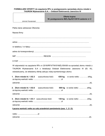 FORMULARZ OFERTY do zapytania RFx w postępowaniu sprzedaży złomu miedzi z TAURON Wytwarzanie S.A. – Oddział Elektrownia Jaworzno III Oferta kupna Nr postępowania MZL/Sp/021/2016 zadanie nr 2 (pieczęć Kupującego) Pełne dane adresowe Oferenta: Nazwa firmy ................................................................................................................................................... adres .................................................................................................................................... nr telefonu / nr faksu ................................................................................................................ adres do korespondencji ......................................................................................................... NIP .................................................. REGON ............................................................... e-mail: ....................................................................................................................................... W odpowiedzi na zapytanie RFx nr 2016/RFX/TW/01MZL/05436 na sprzedaż złomu miedzi z TAURON Wytwarzanie S.A z lokalizacji Oddział Elektrownia Jaworzno III (El. III), oświadczamy, że składamy ofertę zakupu niżej wymienionego złomu: 1. Złom miedzi kl. 1.02.3 szacunkowa ilość: 630 kg za łączną wartość netto: .................................................. zł w cenie netto: …..……. zł/kg, (słownie: ................................................................................................................................zł), 2. Złom miedzi kl. 1.02.6 szacunkowa ilość: 500 kg w cenie netto: …..……. zł/kg, za łączną wartość netto: .................................................. zł (słownie: ................................................................................................................................zł), 3. Złom miedzi kl. 1.03.1 szacunkowa ilość: 130 kg za łączną wartość netto: .................................................. zł w cenie netto: …..……. zł/kg, (słownie: ................................................................................................................................zł), Łączna wartość netto za cały przedmiot zamówienia (poz. 1, 2 i 3): netto: .....................................zł (słownie: ...............................................................................................................................zł). 1 Oświadczenia Oferenta: Oświadczamy, że uważamy się za związanych niniejszą ofertą do 60 dni od daty zakończenia postępowania. Deklarujemy dokonywanie przedpłat (zaliczek) na zakup złomu w formie przelewu przed odbiorem złomu. Oświadczamy, że zapoznaliśmy się z projektem umowy oraz zobowiązujemy się do jej podpisania w przypadku wyboru naszej oferty, pod rygorem utraty wadium. Deklaracja o odbiorze planowanej do sprzedaży ilości złomu w terminie wskazanym przez Sprzedającego w ust 1. Ogłoszenia. Oświadczamy, że dokonaliśmy oględzin złomu. Oświadczamy, że treść dokumentów załączonych do oferty jest zgodna ze stanem faktycznym. W złączeniu (w postaci plików dołączonych do oferty): skan potwierdzenia wpłaty wadium, skan aktualnego odpisu KRS lub z CEiDG skan aktualnego zaświadczenia o nadaniu numerów NIP, REGON, skan aktualnego zezwolenia na prowadzenie działalności w zakresie zbierania odpadów skan aktualnego zezwolenia na transportu odpadów lub oświadczenie o zleceniu usługi transportowej podwykonawcy wraz z kserokopią jego aktualnego zezwolenia na transport w/w odpadów, skan aktualnej polisy ubezpieczenia OC w zakresie prowadzonej działalności. ........................................... dnia ......................... (miejscowość) .............................................................. (podpis Oferenta lub jego pełnomocnika) 2