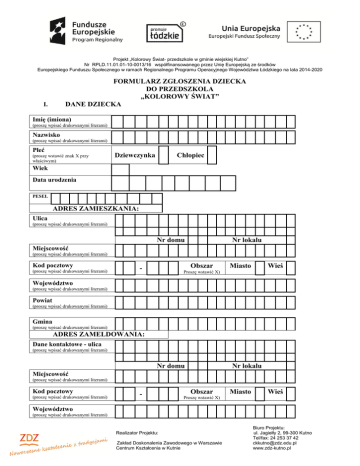 Projekt „Kolorowy Świat- przedszkole w gminie wiejskiej Kutno” Nr RPLD.11.01.01-10-0013/16 współfinansowanego przez Unię Europejską ze środków Europejskiego Funduszu Społecznego w ramach Regionalnego Programu Operacyjnego Województwa Łódzkiego na lata 2014-2020 FORMULARZ ZGŁOSZENIA DZIECKA DO PRZEDSZKOLA „KOLOROWY ŚWIAT” DANE DZIECKA I. Imię (imiona) (proszę wpisać drukowanymi literami) Nazwisko (proszę wpisać drukowanymi literami) Płeć (proszę wstawić znak X przy właściwym) Chłopiec Dziewczynka Wiek Data urodzenia PESEL ADRES ZAMIESZKANIA: Ulica (proszę wpisać drukowanymi literami) Nr domu Nr lokalu Miejscowość (proszę wpisać drukowanymi literami) Kod pocztowy (proszę wpisać drukowanymi literami) Obszar - Wieś Miasto Proszę wstawić X) Województwo (proszę wpisać drukowanymi literami) Powiat (proszę wpisać drukowanymi literami) Gmina (proszę wpisać drukowanymi literami) ADRES ZAMELDOWANIA: Dane kontaktowe - ulica (proszę wpisać drukowanymi literami) Nr domu Nr lokalu Miejscowość (proszę wpisać drukowanymi literami) Kod pocztowy (proszę wpisać drukowanymi literami) - Obszar Miasto Wieś Proszę wstawić X) Województwo (proszę wpisać drukowanymi literami) Realizator Projektu: Zakład Doskonalenia Zawodowego w Warszawie Centrum Kształcenia w Kutnie Biuro Projektu: ul. Jagiełły 2, 99-300 Kutno Tel/fax: 24 253 37 42 [email protected] www.zdz-kutno.pl Projekt „Kolorowy Świat- przedszkole w gminie wiejskiej Kutno” Nr RPLD.11.01.01-10-0013/16 współfinansowanego przez Unię Europejską ze środków Europejskiego Funduszu Społecznego w ramach Regionalnego Programu Operacyjnego Województwa Łódzkiego na lata 2014-2020 Powiat (proszę wpisać drukowanymi literami) Gmina (proszę wpisać drukowanymi literami) Numer telefonu stacjonarnego rodzica (proszę wpisać drukowanymi cyframi) Numer telefonu komórkowego rodzica/ opiekuna (proszę wpisać drukowanymi cyframi) Adres e-mail rodzica/opiekuna II. Ja niżej podpisana/y…………………………………………………… będąca/y rodzicem/opiekunem prawnym dziecka (imię nazwisko)…………………………………………... oświadczam, że dziecko: □ jest w wieku 3-6 lat □ zamieszkuje na terenie gminy wiejskiej Kutno □ nie ma przeciwwskazań zdrowotnych dziecka do uczęszczania do przedszkola III. Ja niżej podpisana/y…………………………………………………… będąca/y rodzicem/opiekunem prawnym dziecka (imię nazwisko)…………………………………………... oświadczam, że: □ dochód na członka rodziny wynosi poniżej min. Socjalnego □ jestem osobą samotnie wychowującą dziecko □ obydwoje rodzice/opiekunowie prawni dziecka są bezrobotni □ bezrobotny jest jeden rodzic/ opiekun prawny dziecka □ dziecko posiada rodzeństwo □ dziecko jest w wieku 3-4 lata 1. Przyjmuję do wiadomości, iż w przypadku zaistnienia zmian w informacjach podanych wyżej, bezzwłocznie zobowiązuję się do poinformowania o tym fakcie. 2. Oświadczam/y, że w przypadku przyjęcia mojego dziecka do przedszkola dołączę pisemne upoważnienie dla osób, które będą mogły odebrać dziecko z przedszkola. 3. Wyrażam dobrowolną zgodę na gromadzenie, przetwarzanie i przekazywanie danych osobowych mojego dziecka (w tym danych wrażliwych) zawartych w niniejszej karcie zgodnie z ustawą Realizator Projektu: Zakład Doskonalenia Zawodowego w Warszawie Centrum Kształcenia w Kutnie Biuro Projektu: ul. Jagiełły 2, 99-300 Kutno Tel/fax: 24 253 37 42 [email protected] www.zdz-kutno.pl Projekt „Kolorowy Świat- przedszkole w gminie wiejskiej Kutno” Nr RPLD.11.01.01-10-0013/16 współfinansowanego przez Unię Europejską ze środków Europejskiego Funduszu Społecznego w ramach Regionalnego Programu Operacyjnego Województwa Łódzkiego na lata 2014-2020 o ochronie danych osobowych dla potrzeb rekrutacji, realizacji, monitorowania i ewaluacji projektu, a także w zakresie niezbędnym do wywiązania się z obowiązków sprawozdawczych. 4. Zostałam/em poinformowana/y o prawie dostępu do treści swoich danych oraz mojego dziecka i możliwości ich poprawiania. 5. Zostałam/Em poinformowana/y że udział w projekcie jest bezpłatny i współfinansowany jest przez Unię Europejską ze środków Europejskiego Funduszu Społecznego w ramach Regionalnego Programu Operacyjnego Województwa Łódzkiego na lata 2014-2020. 6. Wyrażam zgodę na nieodpłatne i nieodwołalne rozpowszechnianie wizerunku mojego dziecka poprzez publikację zdjęć wykonanych w ramach działań promocyjnych i archiwizacyjnych w ramach projektu „Kolorowy Świat- przedszkole w gminie wiejskiej Kutno”. Jednocześnie oświadczam, iż zdjęcie te nie naruszają moich dóbr osobistych. 7. Uprzedzony/a o odpowiedzialności za złożenie nieprawdziwego oświadczenia lub zatajenie prawdy niniejszym oświadczam, że dane przedstawione w niniejszym dokumencie odpowiadają stanowi faktycznemu i są zgodne z prawdą. _____________________________ (podpis matki/opiekuna prawnego) _____________________________ ( podpis ojca/opiekuna prawnego) Realizator Projektu: Zakład Doskonalenia Zawodowego w Warszawie Centrum Kształcenia w Kutnie Biuro Projektu: ul. Jagiełły 2, 99-300 Kutno Tel/fax: 24 253 37 42 [email protected] www.zdz-kutno.pl
