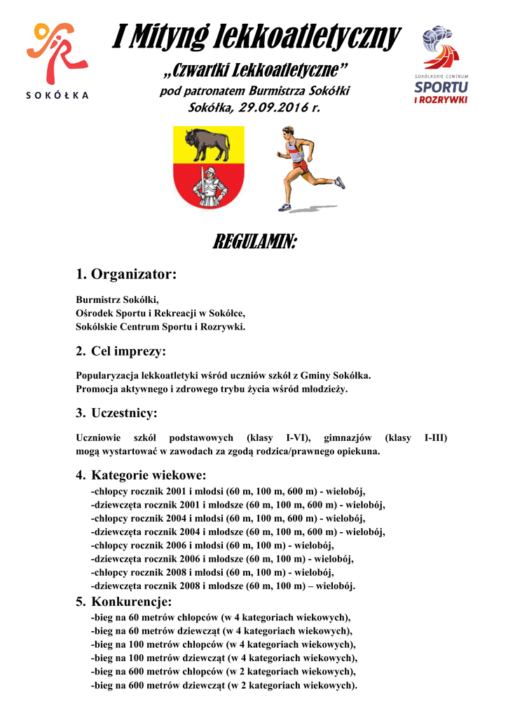 I Mityng lekkoatletyczny „Czwartki Lekkoatletyczne” pod patronatem Burmistrza Sokółki Sokółka, 29.09.2016 r. REGULAMIN: 1. Organizator: Burmistrz Sokółki, Ośrodek Sportu i Rekreacji w Sokółce, Sokólskie Centrum Sportu i Rozrywki. 2. Cel imprezy: Popularyzacja lekkoatletyki wśród uczniów szkół z Gminy Sokółka. Promocja aktywnego i zdrowego trybu życia wśród młodzieży. 3. Uczestnicy: Uczniowie szkół podstawowych (klasy I-VI), gimnazjów (klasy mogą wystartować w zawodach za zgodą rodzica/prawnego opiekuna. 4. Kategorie wiekowe: -chłopcy rocznik 2001 i młodsi (60 m, 100 m, 600 m) - wielobój, -dziewczęta rocznik 2001 i młodsze (60 m, 100 m, 600 m) - wielobój, -chłopcy rocznik 2004 i młodsi (60 m, 100 m, 600 m) - wielobój, -dziewczęta rocznik 2004 i młodsze (60 m, 100 m, 600 m) - wielobój, -chłopcy rocznik 2006 i młodsi (60 m, 100 m) - wielobój, -dziewczęta rocznik 2006 i młodsze (60 m, 100 m) - wielobój, -chłopcy rocznik 2008 i młodsi (60 m, 100 m) - wielobój, -dziewczęta rocznik 2008 i młodsze (60 m, 100 m) – wielobój. 5. Konkurencje: -bieg na 60 metrów chłopców (w 4 kategoriach wiekowych), -bieg na 60 metrów dziewcząt (w 4 kategoriach wiekowych), -bieg na 100 metrów chłopców (w 4 kategoriach wiekowych), -bieg na 100 metrów dziewcząt (w 4 kategoriach wiekowych), -bieg na 600 metrów chłopców (w 2 kategoriach wiekowych), -bieg na 600 metrów dziewcząt (w 2 kategoriach wiekowych). I-III) 6. Termin i miejsce: Termin: 29.09.2016r. Otwarcie biura zawodów(namiot ustawiony przy bieżni) - godz. 15.30, Pierwsze starty – ok. godz. 16:00 - 16:30. Miejsce: stadion Ośrodka Sportu i Rekreacji w Sokółce ul. Mariańska 31. 7. Klasyfikacja końcowa i punktacja: W klasyfikacji końcowej o zajętym miejscu decydować będą punkty uzyskane w poszczególnych konkurencjach. Punktacja: I miejsce – 15 pkt. II miejsce – 14 pkt. III miejsce – 13 pkt. IV miejsce – 12 pkt. V miejsce – 11 pkt. VI miejsce – 10 pkt. VII miejsce – 9 pkt. VIII miejsce – 8 pkt. IX miejsce – 7 pkt. X miejsce – 6 pkt. XI miejsce – 5 pkt. XII miejsce – 4 pkt. XIII miejsce – 3 pkt. XIV miejsce – 2 pkt. XV miejsce – 1 pkt. 8. Nagrody: Pamiątkowe medale za pierwsze 3 miejsca, Dyplomy za pierwszych 6 miejsc. 9. Zgłoszenia: Zgłoszenia przyjmowane będą w biurze zawodów (namiot ustawiony przy bieżni) od godziny 15:30 do 16:00. Zawodników mogą zgłosić rodzice/prawni opiekunowie. 10. Postanowienia końcowe: Sytuacje nieobjęte powyższym regulaminem rozstrzyga organizator.