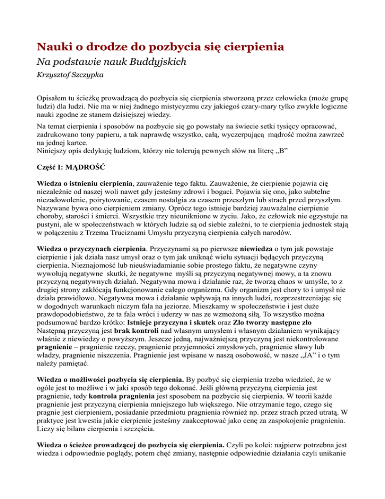 Nauki o drodze do pozbycia się cierpienia Na podstawie nauk Buddyjskich Krzysztof Szczypka Opisałem tu ścieżkę prowadzącą do pozbycia się cierpienia stworzoną przez człowieka (może grupę ludzi) dla ludzi. Nie ma w niej żadnego mistycyzmu czy jakiegoś czary-mary tylko zwykłe logiczne nauki zgodne ze stanem dzisiejszej wiedzy. Na temat cierpienia i sposobów na pozbycie się go powstały na świecie setki tysięcy opracować, zadrukowano tony papieru, a tak naprawdę wszystko, całą, wyczerpującą mądrość można zawrzeć na jednej kartce. Niniejszy opis dedykuję ludziom, którzy nie tolerują pewnych słów na literę „B” Część I: MĄDROŚĆ Wiedza o istnieniu cierpienia, zauważenie tego faktu. Zauważenie, że cierpienie pojawia cię niezależnie od naszej woli nawet gdy jesteśmy zdrowi i bogaci. Pojawia się ono, jako subtelne niezadowolenie, poirytowanie, czasem nostalgia za czasem przeszłym lub strach przed przyszłym. Nazywane bywa ono cierpieniem zmiany. Oprócz tego istnieje bardziej zauważalne cierpienie choroby, starości i śmierci. Wszystkie trzy nieuniknione w życiu. Jako, że człowiek nie egzystuje na pustyni, ale w społeczeństwach w których ludzie są od siebie zależni, to te cierpienia jednostek stają w połączeniu z Trzema Truciznami Umysłu przyczyną cierpienia całych narodów. Wiedza o przyczynach cierpienia. Przyczynami są po pierwsze niewiedza o tym jak powstaje cierpienie i jak działa nasz umysł oraz o tym jak uniknąć wielu sytuacji będących przyczyną cierpienia. Nieznajomość lub nieuświadamianie sobie prostego faktu, że negatywne czyny wywołują negatywne skutki, że negatywne myśli są przyczyną negatywnej mowy, a ta znowu przyczyną negatywnych działań. Negatywna mowa i działanie raz, że tworzą chaos w umyśle, to z drugiej strony zakłócają funkcjonowanie całego organizmu. Gdy organizm jest chory to i umysł nie działa prawidłowo. Negatywna mowa i działanie wpływają na innych ludzi, rozprzestrzeniając się w dogodnych warunkach niczym fala na jeziorze. Mieszkamy w społeczeństwie i jest duże prawdopodobieństwo, że ta fala wróci i uderzy w nas ze wzmożoną siłą. To wszystko można podsumować bardzo krótko: Istnieje przyczyna i skutek oraz Zło tworzy następne zło Następną przyczyną jest brak kontroli nad własnym umysłem i własnym działaniem wynikający właśnie z niewiedzy o powyższym. Jeszcze jedną, najważniejszą przyczyną jest niekontrolowane pragnienie – pragnienie rzeczy, pragnienie przyjemności zmysłowych, pragnienie sławy lub władzy, pragnienie niszczenia. Pragnienie jest wpisane w naszą osobowość, w nasze „JA” i o tym należy pamiętać. Wiedza o możliwości pozbycia się cierpienia. By pozbyć się cierpienia trzeba wiedzieć, że w ogóle jest to możliwe i w jaki sposób tego dokonać. Jeśli główną przyczyną cierpienia jest pragnienie, tedy kontrola pragnienia jest sposobem na pozbycie się cierpienia. W teorii każde pragnienie jest przyczyną cierpienia mniejszego lub większego. Nie otrzymanie tego, czego się pragnie jest cierpieniem, posiadanie przedmiotu pragnienia również np. przez strach przed utratą. W praktyce jest kwestia jakie cierpienie jesteśmy zaakceptować jako cenę za zaspokojenie pragnienia. Liczy się bilans cierpienia i szczęścia. Wiedza o ścieżce prowadzącej do pozbycia się cierpienia. Czyli po kolei: najpierw potrzebna jest wiedza i odpowiednie poglądy, potem chęć zmiany, następnie odpowiednie działania czyli unikanie negatywnych myśli, mowy i czynów. To jednak nie wszystko, należy stworzyć nową jakość poprzez kreowanie pozytywnych myśli, pozytywnej mowy i pozytywnych działań. By możliwe było spełnianie poprzednich punktów potrzebna jest jakaś kontrola nad własnym umysłem i działaniami przez niego prowokowanymi. Kontrolę daje nam medytacja. Medytacja uspokaja umysł i co za tym idzie uspokaja cały organizm sprawiając, że staje się on zrównoważony i zdrowy. Zdrowe ciało, to zdrowy umysł i kółeczko się zamyka. Zdrowy umysł i zdrowe ciało, to spokój i zadowolenie, mniej pragnień i zdrowe działania. Trening medytacyjny sprawia, że w większym stopniu stajemy się świadomi zarówno tego co wpływa do naszego umysłu, jak i naszej mowy, myśli (zauważycie, że myśli nie zależą tylko od naszej woli) oraz działań naszego ciała. Generalnie rozszerzona medytacją świadomość umożliwia kontrolę pragnienia oraz naszych działań. Część II : MORALNOŚĆ Praktyka moralności dotyka działań ciała mowy i umysłu. Jest to część w której można wykorzystać wiedzę teoretyczną lub po prostu zaufać ścieżce. O moralności można pisać bardzo wiele, ale generalnie chodzi o zasadę nie szkodzenia innym. Dalajlama ujął to tymi słowami „Nasze osobiste prawo do szczęścia nie jest ważniejsze od praw innych ludzi” Oznacza to, że goniąc za własnym szczęściem musimy zwracać uwagę, czy po drodze nie depczemy po innych ludziach. Moralne życie uspokaja umysł umożliwiając jego efektywniejszą kontrolę. Moralne życie nie tworzy cierpienia innych ludzi. Jeśli inni żyją moralnie, to nie stają się przyczynami naszego cierpienia. Wiem, że niby jest to oczywiste, gdy się czyta takie słowa w książce, ale jeśli się rozejrzycie, to zauważycie, że praktyka życiowa mówi co innego. Pamiętajmy, że bieda, opresja i cierpienie, czyli zło tego świata stworzone jest przez ludzi dla ludzi nie przez jakiegoś boga, czy szatana. Część III: MEDYTACJA Czyli narzędzie kontroli umysłu, a poprzez umysł całego ciała. Narzędzie, które porządkuje rozbiegany umysł i przywraca jego naturalną uwagę. Kontrola umysłu pozwala nie tylko unikać negatywnych słów i działań, ale również pomaga w tworzeniu działań pozytywnych, co jest jeszcze trudniejsze. Jest to również kontrola treści jakimi faszeruje nas współczesny, utowarowiony świat. Musi