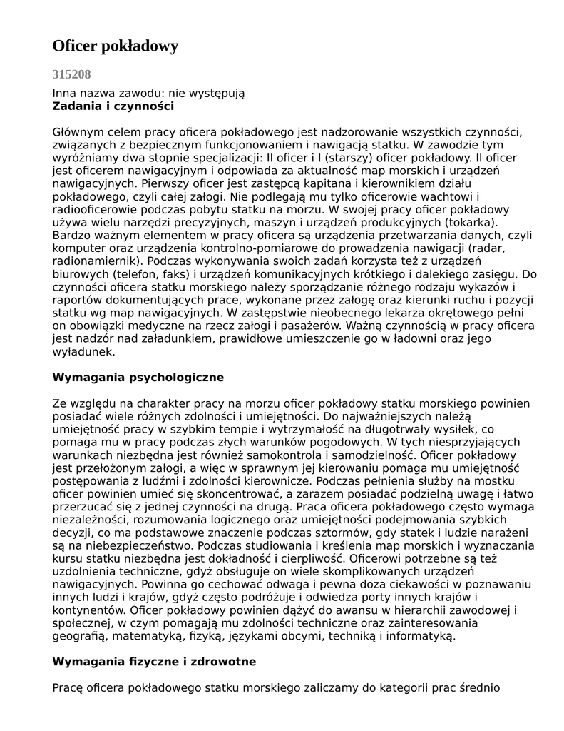 Oficer pokładowy 315208 Inna nazwa zawodu: nie występują Zadania i czynności Głównym celem pracy oficera pokładowego jest nadzorowanie wszystkich czynności, związanych z bezpiecznym funkcjonowaniem i nawigacją statku. W zawodzie tym wyróżniamy dwa stopnie specjalizacji: II oficer i I (starszy) oficer pokładowy. II oficer jest oficerem nawigacyjnym i odpowiada za aktualność map morskich i urządzeń nawigacyjnych. Pierwszy oficer jest zastępcą kapitana i kierownikiem działu pokładowego, czyli całej załogi. Nie podlegają mu tylko oficerowie wachtowi i radiooficerowie podczas pobytu statku na morzu. W swojej pracy oficer pokładowy używa wielu narzędzi precyzyjnych, maszyn i urządzeń produkcyjnych (tokarka). Bardzo ważnym elementem w pracy oficera są urządzenia przetwarzania danych, czyli komputer oraz urządzenia kontrolno-pomiarowe do prowadzenia nawigacji (radar, radionamiernik). Podczas wykonywania swoich zadań korzysta też z urządzeń biurowych (telefon, faks) i urządzeń komunikacyjnych krótkiego i dalekiego zasięgu. Do czynności oficera statku morskiego należy sporządzanie różnego rodzaju wykazów i raportów dokumentujących prace, wykonane przez załogę oraz kierunki ruchu i pozycji statku wg map nawigacyjnych. W zastępstwie nieobecnego lekarza okrętowego pełni on obowiązki medyczne na rzecz załogi i pasażerów. Ważną czynnością w pracy oficera jest nadzór nad załadunkiem, prawidłowe umieszczenie go w ładowni oraz jego wyładunek. Wymagania psychologiczne Ze względu na charakter pracy na morzu oficer pokładowy statku morskiego powinien posiadać wiele różnych zdolności i umiejętności. Do najważniejszych należą umiejętność pracy w szybkim tempie i wytrzymałość na długotrwały wysiłek, co pomaga mu w pracy podczas złych warunków pogodowych. W tych niesprzyjających warunkach niezbędna jest również samokontrola i samodzielność. Oficer pokładowy jest przełożonym załogi, a więc w sprawnym jej kierowaniu pomaga mu umiejętność postępowania z ludźmi i zdolności kierownicze. Podczas pełnienia służby na mostku oficer powinien umieć się skoncentrować, a zarazem posiadać podzielną uwagę i łatwo przerzucać się z jednej czynności na drugą. Praca oficera pokładowego często wymaga niezależności, rozumowania logicznego oraz umiejętności podejmowania szybkich decyzji, co ma podstawowe znaczenie podczas sztormów, gdy statek i ludzie narażeni są na niebezpieczeństwo. Podczas studiowania i kreślenia map morskich i wyznaczania kursu statku niezbędna jest dokładność i cierpliwość. Oficerowi potrzebne są też uzdolnienia techniczne, gdyż obsługuje on wiele skomplikowanych urządzeń nawigacyjnych. Powinna go cechować odwaga i pewna doza ciekawości w poznawaniu innych ludzi i krajów, gdyż często podróżuje i odwiedza porty innych krajów i kontynentów. Oficer pokładowy powinien dążyć do awansu w hierarchii zawodowej i społecznej, w czym pomagają mu zdolności techniczne oraz zainteresowania geografią, matematyką, fizyką, językami obcymi, techniką i informatyką. Wymagania fizyczne i zdrowotne Pracę oficera pokładowego statku morskiego zaliczamy do kategorii prac średnio ciężkich. Największe znaczenie w tym zawodzie ma duża sprawność narządów równowagi (praca na statku kołysanym przez fale) oraz układu krążenia. Wskazane jest też, aby oficer odznaczał się dobrym ogólnym stanem zdrowia, a w szczególności dużą sprawnością układu kostno-stawowego i mięśniowego (praca w ciągłym ruchu). Do pracy w tym zawodzie istnieją następujące przeciwwskazania: - nowotwory złośliwe - choroby zakaźne i pasożytnicze - choroby słuchu, wzroku, skóry i uzębienia - choroby układu krążenia, oddechowego, trawiennego, nerwowego i ruchu Ze względu na specyfikę pracy na morzu osoby niepełnosprawne nie są zatrudniane. Warunki podjęcia pracy w zawodzie Do podjęcia pracy w tym zawodzie niezbędne jest wykształceni średnie pomaturalne lub wyższe oraz uzyskanie specjalizacji, czyli dyplomu morskiego nawigatora I klasy lub dyplomu II oficera pokładowego. Kandydat ubiegający się o pracę w tym zawodzie powinien ukończyć kursy BHP, ppoż., ratownika morskiego, obsługi komputera oraz radiowo-satelitarny i nawigacji radarowej. Konieczna jest znajomość języka angielskiego lub niemieckiego. Do pracy w zawodzie oficera pokładowego statku morskiego preferowani są mężczyźni w wieku do 45 lat. Możliwości awansu w hierarchii zawodowej W zawodzie oficera pokładowego istnieją ograniczone możliwości rozwoju kariery zawodowej, to znaczy oficer może osiągać wyższy stopień specjalizacji lub awansować na kapitana statku morskiego. Możliwe jest to po ukończeniu specjalistycznych kursów lub Wyższej Szkoły Morskiej. Możliwości podjęcia pracy przez dorosłych Osoby, które chciałyby powrócić do zawodu oficera po dłuższej przerwie lub podjąć pracę w starszym wieku, mogą to uczynić do 50 roku życia. Osoba ta musi tylko odznaczać się dobrym ogólnym stanem zdrowia i spełniać warunki przedstawione w rozdziale „Warunki podjęcia pracy w zawodzie”. Możliwości zatrudnienia oraz płace Informacje będą sukcesywnie uzupełniane. Zawody pokrewne - oficer mechanik statku morskiego - kierownik statku żeglugi śródlądowej - kapitan statku morskiego - marynarz statku morskiego Polecana literatura Pod obcą banderą - poradnik dla oficerów i marynarzy, Gdynia 1992 Elementy nauki o pracy, Gdynia 1977 Instytut Medycyny Morskiej Tropikalnej - biuletyn metodyczno-organizacyjny, 1989 supl.1. Janiszewski, O obserwacji uczestniczącej na statku morskim, „Studia socjologiczne” nr 4, 1971 Ważniejsze adresy Informacje będą sukcesywnie uzupełniane.