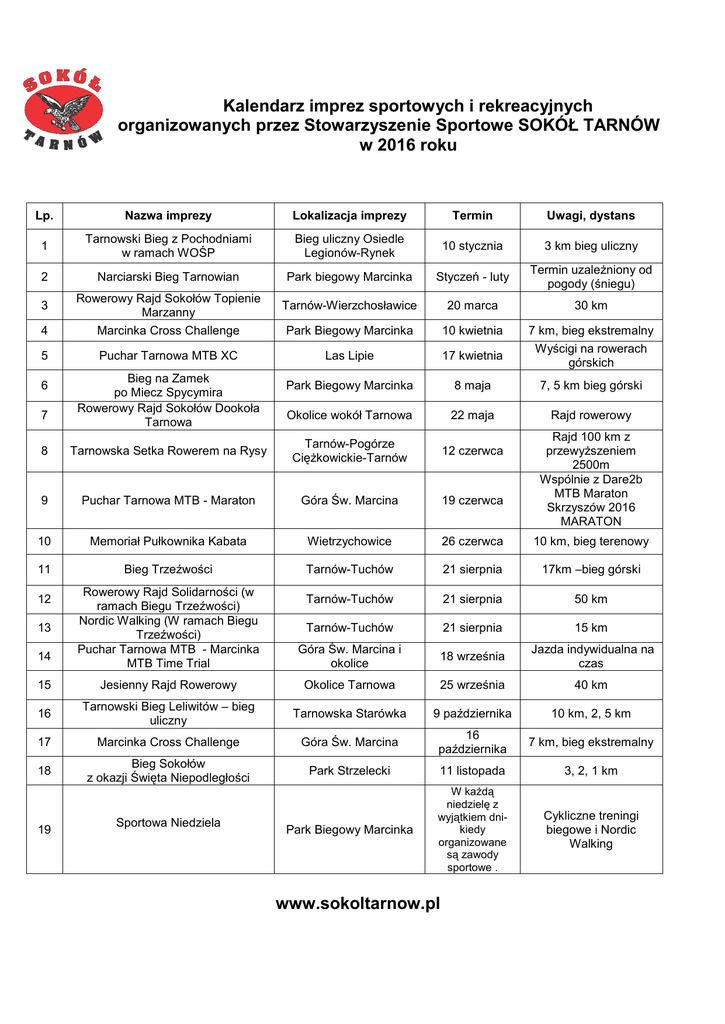 Kalendarz imprez sportowych i rekreacyjnych organizowanych przez Stowarzyszenie Sportowe SOKÓŁ TARNÓW w 2016 roku Lp. Nazwa imprezy Lokalizacja imprezy Termin Uwagi, dystans 1 Tarnowski Bieg z Pochodniami w ramach WOŚP Bieg uliczny Osiedle Legionów-Rynek 10 stycznia 3 km bieg uliczny 2 Narciarski Bieg Tarnowian Park biegowy Marcinka Styczeń - luty Termin uzależniony od pogody (śniegu) Tarnów-Wierzchosławice 20 marca 30 km Park Biegowy Marcinka 10 kwietnia Las Lipie 17 kwietnia 7 km, bieg ekstremalny Wyścigi na rowerach górskich Park Biegowy Marcinka 8 maja 7, 5 km bieg górski Okolice wokół Tarnowa 22 maja Rajd rowerowy 4 Rowerowy Rajd Sokołów Topienie Marzanny Marcinka Cross Challenge 5 Puchar Tarnowa MTB XC 3 6 7 Bieg na Zamek po Miecz Spycymira Rowerowy Rajd Sokołów Dookoła Tarnowa Rajd 100 km z przewyższeniem 2500m Wspólnie z Dare2b MTB Maraton Skrzyszów 2016 MARATON 8 Tarnowska Setka Rowerem na Rysy Tarnów-Pogórze Ciężkowickie-Tarnów 12 czerwca 9 Puchar Tarnowa MTB - Maraton Góra Św. Marcina 19 czerwca 10 Memoriał Pułkownika Kabata Wietrzychowice 26 czerwca 10 km, bieg terenowy 11 Bieg Trzeźwości Tarnów-Tuchów 21 sierpnia 17km –bieg górski Tarnów-Tuchów 21 sierpnia 50 km Rowerowy Rajd Solidarności (w ramach Biegu Trzeźwości) Nordic Walking (W ramach Biegu Trzeźwości) Puchar Tarnowa MTB - Marcinka MTB Time Trial Tarnów-Tuchów 21 sierpnia 15 km Góra Św. Marcina i okolice 18 września Jazda indywidualna na czas 15 Jesienny Rajd Rowerowy Okolice Tarnowa 25 września 40 km 16 Tarnowski Bieg Leliwitów – bieg uliczny Tarnowska Starówka 9 października 10 km, 2, 5 km 17 Marcinka Cross Challenge Góra Św. Marcina 16 października 7 km, bieg ekstremalny 18 Bieg Sokołów z okazji Święta Niepodległości Park Strzelecki 11 listopada 3, 2, 1 km Park Biegowy Marcinka W każdą niedzielę z wyjątkiem dnikiedy organizowane są zawody sportowe . Cykliczne treningi biegowe i Nordic Walking 12 13 14 19 Sportowa Niedziela www.sokoltarnow.pl