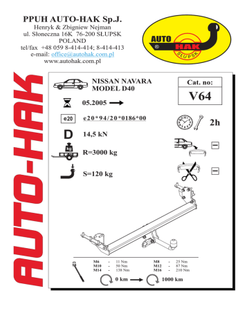 PPUH AUTO-HAK Sp.J. Henryk & Zbigniew Nejman ul. S³oneczna 16K 76-200 S£UPSK POLAND tel/fax +48 059 8-414-414; 8-414-413 e-mail: [email protected] www.autohak.com.pl AUTO HAK ® NISSAN NAVARA MODEL D40 V64 05.2005 e 20 e 2 0 * 9 4 / 2 0 *0186*00 D 14,5 kN kg 2h - R=3000 kg - S=120 kg M6 M10 M14 - 11 Nm 50 Nm 138 Nm 0 km M8 M12 M16 - 25 Nm 87 Nm 210 Nm 1000 km OD PRODUCENTA: PL Dziêkujemy za wybór produkowanego przez nasz¹ firmê zaczepu kulowego. Jego niezawodnoœæ zosta³a potwierdzona licznymi testami oraz opiniami zadowolonych klientów. Jednak¿e niezawodnoœæ zaczepów kulowych jest zale¿na równie¿ od prawid³owego monta¿u oraz prawid³owej eksploatacji. Z tego powodu prosimy Pañstwa o staranne przeczytanie niniejszej instrukcji monta¿u oraz przestrzeganie w³aœciwych wskazówek. Zaczep nale¿y zamontowaæ w miejscach do tego celu przeznaczonych przez producenta samochodu. FROM MANUFACTURER: GB Thank you for buying our product. Their reliability has been confirmed in many tests. Reliability of towbar depends also on correct assembly and right operation. For this reasons we kindly ask to read carefully this instruction and apply to hints. The towbar should be install in points described by a car producer. VON DEM HERSTELLER: D F Die Zuverlässigkeit der Anhängekupplung ist jedoch auch von der ordnungsgemäßen Montage und der richtigen Nutzung abhängig. Daher werden Sie gebeten, sorgfältig die folgende Montageanleitung zu lesen und sich an die entsprechenden Anweisungen zu halten. Die Anhängekupplung muss an den vom Fahrzeughersteller vorgeschriebenen Befestigungsstellen montiert werden. DE LA PART DU FABRICANT: Merci d'avoir choisi le dispositif d'attelage aÌ boule produit par notre societ́e.́ Sa fiabilite´a et́e´confirmeé par de nombreux tests et a travers l'opinion des clients satisfaits. Toutefois, la fiabilite´des dispositifs d'attelage a`boule deṕend également d'une installation et d'une utilisation correcte. Pour cette raison, nous vous demandons de lire attentivement cette instruction de montage et d'en respecter les consignes. Le dispositif d'attelage a`boule doit et^re monte´dans des emplacements prev́us a cet effet par le fabricant de voiture. FRA PRODUCENTEN: DK Tak fordi De har valgt vores anhængertræk. Dets pålidelighed er blevet bekræftet i mange undersøgelser samt af tilfredse kunder. Vores anhængertræks pålidelighed er også afhængig af korrekt montering og korrekt betjening. Af denne grund beder vi Dem at læse denne instruktion grundigt og overholde de korrekte anvisninger. DE PRODUCTOR: E Gracias por la elección del enganche de bola producido por nuestra empresa. Su fiabilidad fue confirmada por numerosos testos y opiniones de los clientes quienes estuvieron contentos. Sin embargo la fiabilidad de enganche de bola depende también de un montaje adecuado y su explotación adecuada. Por esa causa por favor leer atentamente la instrucción del montaje y observar adecuadas indicadoras. VAN DE FABRIKANT: NL Bedankt voor de aanschaf van onze kogeltrekhaak. Hoe betrouwbaar die is blijkt wel uit vele tests en meningen van tevreden klanten. Toch is de betrouwbaarheid van een kogeltrekhaak er mede van afhankelijk dat deze correct gemonteerd is en op de juiste manier wordt gebruikt. Daarom wordt u verzocht deze montagehandleiding zorgvuldig te lezen en de aanwijzingen te volgen. FRA PRODUSENTEN: N Takk for at dere har valgt kulefestet produsert av vårt firma. Driftssikkerheten på kulefestet har blitt bekreftet av flere tester og tilbakemeldinger fra fornøyde kunder. Allikevel er driftssikkerheten også avhengig av en korrekt montering og riktig bruk. Derfor ber vi dere om å lese denne monteringsinstruksen nøye og anbefaler at dere følger veiledningen. ETT BUDSKAP FRÅN TILLVERKAREN: S Vi skulle vilja tacka er för ert val och inköp. Våra dragkrokars pålitlighet har bevisats av olika tester samt referenser från nöjda kunder. Man får inte glömma att dragkrokars pålitlighet beror också på rätt installation och rätt bruk. Därför skulle vi vilja be att ni läser noga denna installationsanvisning och följer alla regler och tips som den anger. Dragkroken ska installeras i ett ställe som blivit påpekade av biltillverkaren. DAL FABBRICANTE: IT -2- Vi ringraziamo per aver scelto il gancio di traino a sfera prodotto dalla nostra azienda. La sua affidabilità è stata confermata da numerosi test e dalle opinioni positive dei clienti. Tuttavia, il perfetto funzionamento dei ganci di traino a sfera dipende anche dalla correttezza del montaggio e dall'utilizzo appropriato. Per questo motivo, Vi preghiamo di leggere attentamente le presenti istruzioni di montaggio e di attenervi alle indicazioni in esse contenute. Il gancio di traino deve essere montato nei punti predisposti a tal fine dal fabbricante del veicolo. PL GB D F A-A DK E NL The clearance specified in appendix VII, diagram 25a/b of Regulation No. 55.01 UN EU must be guaranteed at laden weight of the vehicle. Der Freiraum nach Anhang VII, Abbildung 25a/b der Vorschriften 55.01 EG ist zu gewährleistenbei zulässigem Gesamtgewichtdes Fahrzeuges. L’espace libre doit etre garanti conformément a l’annexe VII, illustration 25a/b de la reglements 55.01 CE pour un poids total en charge autorisé du véhicule. I overensstemmelse med bilag VII, figur 25a/b til forordninger 55.01 EF for køretøjets tilladte totalvægt skal der garanteres en friplads. Hay que garantizar un espacio suelto según archivo adjunto VII, ilustración 25a/b regulaciones 55.01 UN EU de peso admisible y total del vehículo. De in bijlage VII afbeelding 25a/b vanreglement 55.01 UN EU gespecificeerde vrije ruimte moet bij een maximale gewichtsbelasting van het voertuig gegarandeerd zijn. N Det skal sørges for fritt rom ifølge vedlegget VII, illustrasjon 25a/b forskrifter 55.01 UN EU ved den tillatte totale vekten av fartøyet. S Man ska garantera ett fritt tillgängligt utrymme - se bilaga VII, dia