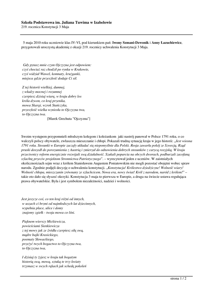 Szkoła Podstawowa im. Juliana Tuwima w Izabelowie 219. rocznica Konstytucji 3 Maja 5 maja 2010 roku uczniowie klas IV-VI, pod kierunkiem pań: Iwony Szmani-Dzwonik i Anny Łazuchiewicz, przygotowali uroczystą akademię z okazji 219. rocznicy uchwalenia Konstytucji 3 Maja. Gdy pytasz mnie czym Ojczyzna jest odpowiem: czyś chociaż raz chodził po rynku w Krakowie, czyś widział Wawel, komnaty, krużganki, miejsca gdzie przeszłość dodaje Ci sił. Z tej historii wielkiej, dumnej, z władzy mocnej i rozumnej czerpiesz dzisiaj wiarę, w kraju dobry los króla dzwon, co kraj przenika, mowa Skargi, wzrok Stańczyka, przeszłość wielka wzniosła to Ojczyzna twa, to Ojczyzna twa. [Marek Grechuta "Ojczyzna"] Swoim występem przypomnieli młodszym kolegom i koleżankom jaki nastrój panował w Polsce 1791 roku, o co walczyli polscy obywatele, zwłaszcza mieszczanie i chłopi. Pokazali trudną sytuację kraju w jego historii: „Jest wiosna 1791 roku. Stosunki w Europie zaczęły układać się niepomyślnie dla Polski. Rosja zawarła pokój ze Szwecją. Rząd pruski doszedł do porozumienia z Austrią i zmierzał do odnowienia dobrych stosunków z carycą rosyjską. W kraju przeciwnicy reform energicznie rozwijali swą działalność. Szukali poparcia na obcych dworach, podburzali zacofaną szlachtę przeciw projektom Stronnictwa Patriotycznego”. – wyrecytował jeden z uczniów. W zaistniałych okolicznościach sejm wraz z królem Stanisławem Augustem Poniatowskim nie mogli pozostać obojętni wobec spraw narodu. Zgodnie podjęli decyzję o uchwaleniu konstytucji. „Konstytucja! Królestwo dziedziczne! Wolność wiary! Wolność chłopa, mieszczanin zrównany ze szlachcicem. Nowa era, nowy świat! Król z narodem, naród z królem!” – takie oto dało się słyszeć okrzyki. Konstytucja 3 maja to pierwsza w Europie, a druga na świecie ustawa regulująca prawa obywatelskie. Była i jest symbolem niezależności, nadziei i wolności. Jest jeszcze coś, co ten kraj różni od innych, w uszach ci brzmi od najmłodszych lat dziecinnych, wypełnia place, ulice i domy znajomy zgiełk - twoja mowa co lśni. Pięknem wierszy Mickiewicza, powieściami Sienkiewicza z tej mowy jak ze źródła czerpiesz siłę swą, mądre bajki Krasickiego, poematy Słowackiego, przeżyć twych bogactwo to Ojczyzna twa, to Ojczyzna twa, I dzisiaj ty żyjesz w kraju tak bogatym historią swą, mową, sztuką te trzy kwiaty trzymasz w swych rękach jak schedę pokoleń strona 1 / 2 Szkoła Podstawowa im. Juliana Tuwima w Izabelowie 219. rocznica Konstytucji 3 Maja muszą wciąż kwitnąć by kraj dalej trwa. Bez historii, mowy, sztuki, bez mądrości tej z nauki naród się zamieni w bezimienny kraj, dziś Ojczyzna jest w potrzebie czeka ciebie, wierzy w ciebie tysiąc lat historii patrzy w serce twe, Masz obronić co najlepsze by służyło Polsce jeszcze liczy na twą pomoc dziś Ojczyzna twa dziś Ojczyzna twa. [Marek Grechuta "Ojczyzna"] strona 2 / 2