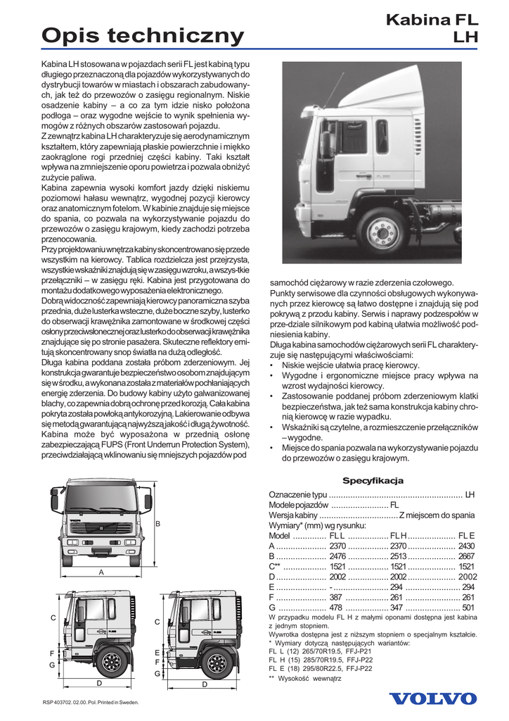 Opis techniczny Kabina LH stosowana w pojazdach serii FL jest kabiną typu długiego przeznaczoną dla pojazdów wykorzystywanych do dystrybucji towarów w miastach i obszarach zabudowanych, jak też do przewozów o zasięgu regionalnym. Niskie osadzenie kabiny – a co za tym idzie nisko położona podłoga – oraz wygodne wejście to wynik spełnienia wymogów z różnych obszarów zastosowań pojazdu. Z zewnątrz kabina LH charakteryzuje się aerodynamicznym kształtem, który zapewniają płaskie powierzchnie i miękko zaokrąglone rogi przedniej części kabiny. Taki kształt wpływa na zmniejszenie oporu powietrza i pozwala obniżyć zużycie paliwa. Kabina zapewnia wysoki komfort jazdy dzięki niskiemu poziomowi hałasu wewnątrz, wygodnej pozycji kierowcy oraz anatomicznym fotelom. W kabinie znajduje się miejsce do spania, co pozwala na wykorzystywanie pojazdu do przewozów o zasięgu krajowym, kiedy zachodzi potrzeba przenocowania. Przy projektowaniu wnętrza kabiny skoncentrowano się przede wszystkim na kierowcy. Tablica rozdzielcza jest przejrzysta, wszystkie wskaźniki znajdują się w zasięgu wzroku, a wszys-tkie przełączniki – w zasięgu ręki. Kabina jest przygotowana do montażu dodatkowego wyposażenia elektronicznego. Dobrą widoczność zapewniają kierowcy panoramiczna szyba przednia, duże lusterka wsteczne, duże boczne szyby, lusterko do obserwacji krawężnika zamontowane w środkowej części osłony przeciwsłonecznej oraz lusterko do obserwacji krawężnika znajdujące się po stronie pasażera. Skuteczne reflektory emitują skoncentrowany snop światła na dużą odległość. Długa kabina poddana została próbom zderzeniowym. Jej konstrukcja gwarantuje bezpieczeństwo osobom znajdującym się w środku, a wykonana została z materiałów pochłaniających energię zderzenia. Do budowy kabiny użyto galwanizowanej blachy, co zapewnia dobrą ochronę przed korozją. Cała kabina pokryta została powłoką antykorozyjną. Lakierowanie odbywa się metodą gwarantującą najwyższą jakość i długą żywotność. Kabina może być wyposażona w przednią osłonę zabezpieczającą FUPS (Front Underrun Protection System), przeciwdziałającą wklinowaniu się mniejszych pojazdów pod Kabina FL LH samochód ciężarowy w razie zderzenia czołowego. Punkty serwisowe dla czynności obsługowych wykonywanych przez kierowcę są łatwo dostępne i znajdują się pod pokrywą z przodu kabiny. Serwis i naprawy podzespołów w prze-dziale silnikowym pod kabiną ułatwia możliwość podniesienia kabiny. Długa kabina samochodów ciężarowych serii FL charakteryzuje się następującymi właściwościami: • Niskie wejście ułatwia pracę kierowcy. • Wygodne i ergonomiczne miejsce pracy wpływa na wzrost wydajności kierowcy. • Zastosowanie poddanej próbom zderzeniowym klatki bezpieczeństwa, jak też sama konstrukcja kabiny chronią kierowcę w razie wypadku. • Wskaźniki są czytelne, a rozmieszczenie przełączników – wygodne. • Miejsce do spania pozwala na wykorzystywanie pojazdu do przewozów o zasięgu krajowym. Specyfikacja Oznaczenie typu ........................................................ LH Modele pojazdów ........................ FL Wersja kabiny ................................. Z miejscem do spania Wymiary* (mm) wg rysunku: Model .............. FL L ................. FL H .................... FL E A ..................... 2370 ................. 2370 .................... 2430 B ..................... 2476 ................. 2513 .................... 2667 C** .................. 1521 ................. 1521 .................... 1521 D ..................... 2002 ................. 2002 .................... 2002 E ..................... - ....................... 294 ....................... 294 F ..................... 387 .................. 261 ....................... 261 G .................... 478 .................. 347 ....................... 501 B A C C E F F G G D RSP 403702. 02.00. Pol. Printed in Sweden. D W przypadku modelu FL H z małymi oponami dostępna jest kabina z jednym stopniem. Wywrotka dostępna jest z niższym stopniem o specjalnym kształcie. * Wymiary dotyczą następujących wariantów: FL L (12) 265/70R19.5, FFJ-P21 FL H (15) 285/70R19.5, FFJ-P22 FL E (18) 295/80R22.5, FFJ-P22 ** Wysokość wewnątrz Opis techniczny Przyjemne miejsce pracy Zastosowany w kabinie układ klimatyzacji cechuje duża wydajność. Przefiltrowane powietrze nadmuchiwane jest do kabiny przez umieszczone wokół wloty. Ciche wentylatory zapewniają bezprze-ciągową wentylację i zapobiegają zaparowaniu szyb. Kabina posiada doskonałą izolację akustyczną i zapewnia kierowcy komfort najwyższej klasy. Nowoczesne wnę-trze kabiny jest jasne i przestronne. Tablica rozdzielcza z czytelnymi wskaźnikami Wszystkie przełączniki i wskaźniki są logicznie rozmieszczone na lekko wyprofilowanej tablicy rozdzielczej. Zapewnia to kierowcy doskonałą widoczność wszystkich wskaźników i wygodny dostęp do przełączników. Tablica rozdzielcza jest przystosowana do montażu dodatkowego wyposażenia elektronicznego. Przede wszystkim wygoda kierowcy Wydajność pracy kierowcy w dużym stopniu zależy od ukształtowania miejsca pracy i wygody. Ergonomiczny fotel kierowcy dostępny jest w czterech wa-riantach: może być zamocowany sztywno, resorowany mechanicznie lub oferowany jest w jednym z dwóch wariantów resorowania pneumatycznego. Fotel posiada szerokie możliwości regulacji, a wszystkie regulatory umieszczono w fotelu od strony drzwi. Dla wszystkich wariantów wspólną cechą jest głębokie siedzenie o anatomicznym kształcie, sprawiające, że kierowca siedzi stabilnie i wygodnie. W kabinie znajduje się duża ilość schowków. W półce na radio, będącej częścią profilowanej podsufitki, znajduje się miejsce na radioodbiornik, głośniki, rejestrator jazdy oraz schowek. Również w tablicy rozdzielczej po stronie pasażera znajduje si