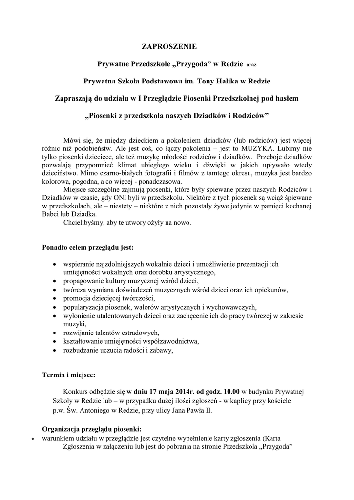 ZAPROSZENIE Prywatne Przedszkole „Przygoda” w Redzie oraz Prywatna Szkoła Podstawowa im. Tony Halika w Redzie Zapraszają do udziału w I Przeglądzie Piosenki Przedszkolnej pod hasłem „Piosenki z przedszkola naszych Dziadków i Rodziców” Mówi się, że między dzieckiem a pokoleniem dziadków (lub rodziców) jest więcej różnic niż podobieństw. Ale jest coś, co łączy pokolenia – jest to MUZYKA. Lubimy nie tylko piosenki dziecięce, ale też muzykę młodości rodziców i dziadków. Przeboje dziadków pozwalają przypomnieć klimat ubiegłego wieku i dźwięki w jakich upływało wtedy dzieciństwo. Mimo czarno-białych fotografii i filmów z tamtego okresu, muzyka jest bardzo kolorowa, pogodna, a co więcej - ponadczasowa. Miejsce szczególne zajmują piosenki, które były śpiewane przez naszych Rodziców i Dziadków w czasie, gdy ONI byli w przedszkolu. Niektóre z tych piosenek są wciąż śpiewane w przedszkolach, ale – niestety – niektóre z nich pozostały żywe jedynie w pamięci kochanej Babci lub Dziadka. Chcielibyśmy, aby te utwory ożyły na nowo. Ponadto celem przeglądu jest: wspieranie najzdolniejszych wokalnie dzieci i umożliwienie prezentacji ich umiejętności wokalnych oraz dorobku artystycznego, propagowanie kultury muzycznej wśród dzieci, twórcza wymiana doświadczeń muzycznych wśród dzieci oraz ich opiekunów, promocja dziecięcej twórczości, popularyzacja piosenek, walorów artystycznych i wychowawczych, wyłonienie utalentowanych dzieci oraz zachęcenie ich do pracy twórczej w zakresie muzyki, rozwijanie talentów estradowych, kształtowanie umiejętności współzawodnictwa, rozbudzanie uczucia radości i zabawy, Termin i miejsce: Konkurs odbędzie się w dniu 17 maja 2014r. od godz. 10.00 w budynku Prywatnej Szkoły w Redzie lub – w przypadku dużej ilości zgłoszeń - w kaplicy przy kościele p.w. Św. Antoniego w Redzie, przy ulicy Jana Pawła II. Organizacja przeglądu piosenki: warunkiem udziału w przeglądzie jest czytelne wypełnienie karty zgłoszenia (Karta Zgłoszenia w załączeniu lub jest do pobrania na stronie Przedszkola „Przygoda” www.edureda.pl) i przesłanie jej pocztą tradycyjną (adres: Prywatna Szkoła im. T.Halika w Redzie ul. Norwida 59, 84-240 Reda) lub w formie elektronicznej do Sekretariatu Szkoły i Przedszkola „Przygoda” ([email protected] lub [email protected] ) do dnia 26 kwietnia 2014. Przedszkole lub szkoła kierująca zgłoszenie może zaproponować maksymalnie jednego solistę lub zespół w każdej kategorii wiekowej: 3-lat, 4-lat, 5-lat, 6-lat lub pierwszej klasy szkoły podstawowej. Do udziału w konkursie zapraszamy: - solistów - zespoły wokalne, zespoły wokalne mogą liczyć maksymalnie 8 osób, każdy wykonawca (zespół) zaprezentuje jedną piosenkę, czas trwania występu nie może przekraczać 3 minut, piosenka winna pochodzić z przedszkolnego repertuaru muzycznego naszych Rodziców i/lub Dziadków, uczestnicy mogą śpiewać z podkładem muzycznym (instrumentalnym bez tekstu) z płyty, a cappella lub z osobą akompaniującą. mile widziane jest przebranie nawiązujące do charakteru utworu, zgłoszenie kandydata jest równoznaczne z akceptacją regulaminu konkursu, kolejność występów zostanie ustalona przez organizatora przeglądu po zamknięciu list zgłoszeń, organizatorzy zapewniają sprzęt nagłaśniający i mikrofony. Jury złożone z profesjonalnych muzyków (Przewodniczącym będzie dyrygent i kompozytor Pan Tadeusz Dixa) będzie oceniało: - walory głosowe - interpretację - ciekawy dobór repertuaru - muzykalność i poczucie rytmu - dobór stroju do charakteru utworu - ogólny wyraz artystyczny. Nagrody przyznawane będą w dwóch kategoriach: - solista - zespół wokalny z podziałem na określone powyżej grupy wiekowe. Nagrody: Płyty, nagrane na koszt organizatora Przeglądu w profesjonalnym studiu nagrań, na których zwycięskie zespoły i soliści utrwalą swoje utwory. Każdy z uczestników otrzyma pamiątkowy dyplom. Kontakt: W razie pytań prosimy dzwonić do Sekretariatu Przedszkola „Przygoda” i Szkoły Podstawowej im T.Halika w Redzie pod wspólny numer 58 678 47 32 lub pisać na podane powyżej adresy e-mail.