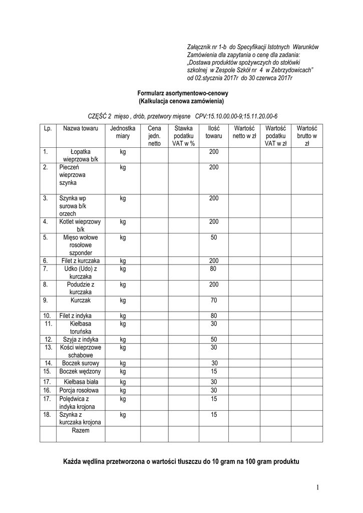Załącznik nr 1-b do Specyfikacji Istotnych Warunków Zamówienia dla zapytania o cenę dla zadania: „Dostawa produktów spożywczych do stołówki szkolnej w Zespole Szkół nr 4 w Zebrzydowicach” od 02.stycznia 2017r do 30 czerwca 2017r Formularz asortymentowo-cenowy (Kalkulacja cenowa zamówienia) CZĘŚĆ 2 mięso , drób, przetwory mięsne CPV:15.10.00.00-9;15.11.20.00-6 Lp. 1. 2. 3. 4. 5. 6. 7. 8. 9. 10. 11. 12. 13. 14. 15. 17. 16. 17. 18. Nazwa towaru Jednostka miary Łopatka wieprzowa b/k Pieczeń wieprzowa szynka kg 200 kg 200 Szynka wp surowa b/k orzech Kotlet wieprzowy b/k Mięso wołowe rosołowe szponder Filet z kurczaka Udko (Udo) z kurczaka Podudzie z kurczaka Kurczak kg 200 kg 200 kg 50 kg kg 200 80 kg 200 kg 70 Filet z indyka Kiełbasa toruńska Szyja z indyka Kości wieprzowe schabowe Boczek surowy Boczek wędzony kg kg 80 30 kg kg 50 30 kg kg 30 15 kg kg kg 30 30 15 kg 15 Kiełbasa biała Porcja rosołowa Polędwica z indyka krojona Szynka z kurczaka krojona Razem Cena jedn. netto Stawka podatku VAT w % Ilość towaru Wartość netto w zł Wartość podatku VAT w zł Wartość brutto w zł Każda wędlina przetworzona o wartości tłuszczu do 10 gram na 100 gram produktu 1 Minimalny termin przydatności do spożycia: świeże Wartość oferty netto......................................... zł (słownie ..................................................................................................... zł). Wartość podatku VAT...................................... zł (słownie...................................................................................................... zł) Wartość oferty brutto........................................zł (słownie ..................................................................................................... zł). Uwaga! Podana ilość towarów jest ilością szacunkową. Zamawiający zastrzega sobie możliwość zmian ilościowych w poszczególnych pozycjach, w tym także zamówienia mniejszej ilości towarów. Zmiany ilości związane są z faktyczną liczbą osób korzystających z dożywiania . ............................... miejscowość i data ………………………………… (pieczęć i podpis osób wykazanych w dokumencie uprawniającym do występowania w obrocie prawnym lub posiadających pełnomocnictwo) 2