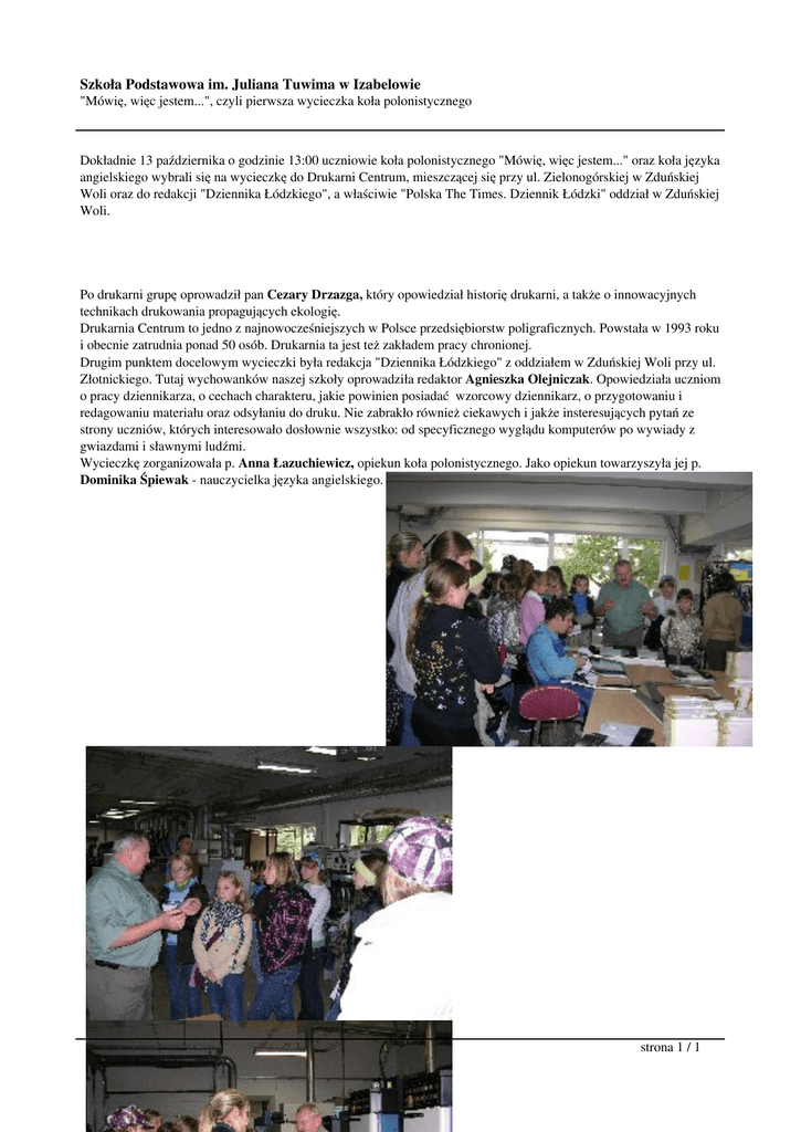 Szkoła Podstawowa im. Juliana Tuwima w Izabelowie "Mówię, więc jestem...", czyli pierwsza wycieczka koła polonistycznego Dokładnie 13 października o godzinie 13:00 uczniowie koła polonistycznego "Mówię, więc jestem..." oraz koła języka angielskiego wybrali się na wycieczkę do Drukarni Centrum, mieszczącej się przy ul. Zielonogórskiej w Zduńskiej Woli oraz do redakcji "Dziennika Łódzkiego", a właściwie "Polska The Times. Dziennik Łódzki" oddział w Zduńskiej Woli. Po drukarni grupę oprowadził pan Cezary Drzazga, który opowiedział historię drukarni, a także o innowacyjnych technikach drukowania propagujących ekologię. Drukarnia Centrum to jedno z najnowocześniejszych w Polsce przedsiębiorstw poligraficznych. Powstała w 1993 roku i obecnie zatrudnia ponad 50 osób. Drukarnia ta jest też zakładem pracy chronionej. Drugim punktem docelowym wycieczki była redakcja "Dziennika Łódzkiego" z oddziałem w Zduńskiej Woli przy ul. Złotnickiego. Tutaj wychowanków naszej szkoły oprowadziła redaktor Agnieszka Olejniczak. Opowiedziała uczniom o pracy dziennikarza, o cechach charakteru, jakie powinien posiadać wzorcowy dziennikarz, o przygotowaniu i redagowaniu materiału oraz odsyłaniu do druku. Nie zabrakło również ciekawych i jakże insteresujących pytań ze strony uczniów, których interesowało dosłownie wszystko: od specyficznego wyglądu komputerów po wywiady z gwiazdami i sławnymi ludźmi. Wycieczkę zorganizowała p. Anna Łazuchiewicz, opiekun koła polonistycznego. Jako opiekun towarzyszyła jej p. Dominika Śpiewak - nauczycielka języka angielskiego. strona 1 / 1