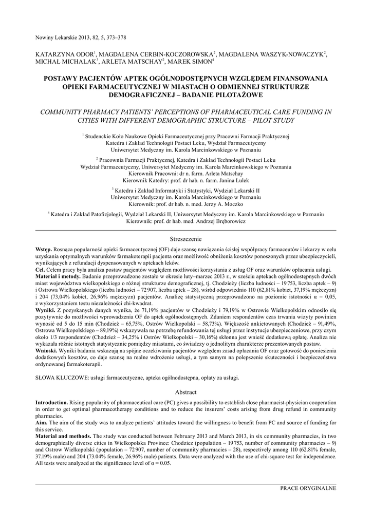Nowiny Lekarskie 2013, 82, 5, 373–378 KATARZYNA ODOR1, MAGDALENA CERBIN-KOCZOROWSKA 2, MAGDALENA WASZYK-NOWACZYK 2, MICHAŁ MICHALAK3, ARLETA MATSCHAY2, MAREK SIMON4 POSTAWY PACJENTÓW APTEK OGÓLNODOSTĘPNYCH WZGLĘDEM FINANSOWANIA OPIEKI FARMACEUTYCZNEJ W MIASTACH O ODMIENNEJ STRUKTURZE DEMOGRAFICZNEJ – BADANIE PILOTAŻOWE COMMUNITY PHARMACY PATIENTS’ PERCEPTIONS OF PHARMACEUTICAL CARE FUNDING IN CITIES WITH DIFFERENT DEMOGRAPHIC STRUCTURE – PILOT STUDY 1 Studenckie Koło Naukowe Opieki Farmaceutycznej przy Pracowni Farmacji Praktycznej Katedra i Zakład Technologii Postaci Leku, Wydział Farmaceutyczny Uniwersytet Medyczny im. Karola Marcinkowskiego w Poznaniu 2 Pracownia Farmacji Praktycznej, Katedra i Zakład Technologii Postaci Leku Wydział Farmaceutyczny, Uniwersytet Medyczny im. Karola Marcinkowskiego w Poznaniu Kierownik Pracowni: dr n. farm. Arleta Matschay Kierownik Katedry: prof. dr hab. n. farm. Janina Lulek 3 Katedra i Zakład Informatyki i Statystyki, Wydział Lekarski II Uniwersytet Medyczny im. Karola Marcinkowskiego w Poznaniu Kierownik: prof. dr hab. n. med. Jerzy A. Moczko 4 Katedra i Zakład Patofizjologii, Wydział Lekarski II, Uniwersytet Medyczny im. Karola Marcinkowskiego w Poznaniu Kierownik: prof. dr hab. med. Andrzej Bręborowicz Streszczenie Wstęp. Rosnąca popularność opieki farmaceutycznej (OF) daje szansę nawiązania ścisłej współpracy farmaceutów i lekarzy w celu uzyskania optymalnych warunków farmakoterapii pacjenta oraz możliwość obniżenia kosztów ponoszonych przez ubezpieczycieli, wynikających z refundacji dyspensowanych w aptekach leków. Cel. Celem pracy była analiza postaw pacjentów względem możliwości korzystania z usług OF oraz warunków opłacania usługi. Materiał i metody. Badanie przeprowadzone zostało w okresie luty–marzec 2013 r., w sześciu aptekach ogólnodostępnych dwóch miast województwa wielkopolskiego o różnej strukturze demograficznej, tj. Chodzieży (liczba ludności – 19 753, liczba aptek – 9) i Ostrowa Wielkopolskiego (liczba ludności – 72 907, liczba aptek – 28), wśród odpowiednio 110 (62,81% kobiet, 37,19% mężczyzn) i 204 (73,04% kobiet, 26,96% mężczyzn) pacjentów. Analizę statystyczną przeprowadzono na poziomie istotności α = 0,05, z wykorzystaniem testu niezależności chi-kwadrat. Wyniki. Z pozyskanych danych wynika, że 71,19% pacjentów w Chodzieży i 79,19% w Ostrowie Wielkopolskim odnosiło się pozytywnie do możliwości wprowadzenia OF do aptek ogólnodostępnych. Zdaniem respondentów czas trwania wizyty powinien wynosić od 5 do 15 min (Chodzież – 65,75%, Ostrów Wielkopolski – 58,73%). Większość ankietowanych (Chodzież – 91,49%, Ostrowa Wielkopolskiego – 89,19%) wskazywała na potrzebę refundowania tej usługi przez instytucje ubezpieczeniowe, przy czym około 1/3 respondentów (Chodzież – 34,25% i Ostrów Wielkopolski – 30,16%) skłonna jest wnieść dodatkową opłatę. Analiza nie wykazała różnic istotnych statystycznie pomiędzy miastami, co świadczy o jednolitym charakterze prezentowanych postaw. Wnioski. Wyniki badania wskazują na spójne oczekiwania pacjentów względem zasad opłacania OF oraz gotowość do poniesienia dodatkowych kosztów, co daje szansę na realne wdrożenie usługi, a tym samym na polepszenie skuteczności i bezpieczeństwa ordynowanej farmakoterapii. SŁOWA KLUCZOWE: usługi farmaceutyczne, apteka ogólnodostępna, opłaty za usługi. Abstract Introduction. Rising popularity of pharmaceutical care (PC) gives a possibility to establish close pharmacist-physician cooperation in order to get optimal pharmacotherapy conditions and to reduce the insurers’ costs arising from drug refund in community pharmacies. Aim. The aim of the study was to analyze patients’ attitudes toward the willingness to benefit from PC and source of funding for this service. Material and methods. The study was conducted between February 2013 and March 2013, in six community pharmacies, in two demographically diverse cities in Wielkopolska Province: Chodziez (population – 19 753, number of community pharmacies – 9) and Ostrow Wielkopolski (population – 72 907, number of community pharmacies – 28), respectively among 110 (62.81% female, 37.19% male) and 204 (73.04% female, 26.96% male) patients. Data were analyzed with the use of chi-square test for independence. All tests were analyzed at the significance level of α = 0.05. PRACE ORYGINALNE 374 Katarzyna Odor, Magdalena Cerbin-Koczorowska, Magdalena Waszyk-Nowaczyk, Michał Michalak i in. Results. The results have shown, that 71.19% of patients in Chodziez and 79.19% in Ostrow Wielkopolski had positive attitude towards PC implementation in community pharmacies. Duration of the visit should last between 5 and 15 minutes in respondents’ opinion (Chodziez – 65.75%, Ostrow Wielkopolski – 58.73%). Most surveyed (Chodziez – 91.49%, Ostrow Wielkopolski – 89.19%) indicated the need of service refund by National Health Fund or the other insurance institution. Nearly 1/3 of respondents (Chodziez – 34.25% and Ostrow Wielkopolski – 30.16%) were willing to pay an additional fee per PC visit. The rest of the analysis showed no significant differences among the cities, what indicates the unitary character ofpresented attitudes. Conclusions. The results indicate cohesive patients’ expectation towards the rules of PC payment and willingness to pay an additional fee, which gives a chance for a practical implementation of this service, and thus to improved effectiveness and safety of prescribed pharmacotherapy. KEY WORDS: pharmacy services, community pharmacy, fee-for-service plans. Wstęp Rolę apteki zdefiniowano w treści ustawy Prawo farmaceutyczne z dnia 6 września 2001 roku [1]. W art. 86 ust. 2 apteka została określona jako „placówka ochrony zdrowia publicznego (...) świadcząca usługi farmaceutyczne”. Do usług tych zalicza się m.in. wydawanie produktów lecz