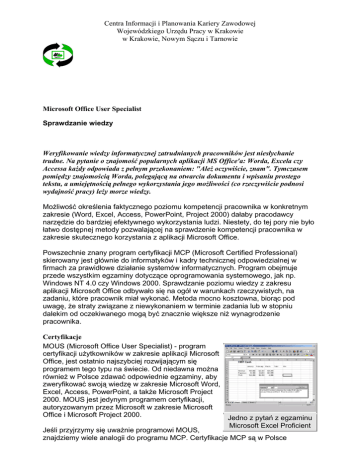 Centra Informacji i Planowania Kariery Zawodowej Wojewódzkiego Urzędu Pracy w Krakowie w Krakowie, Nowym Sączu i Tarnowie Microsoft Office User Specialist Sprawdzanie wiedzy Weryfikowanie wiedzy informatycznej zatrudnianych pracowników jest niesłychanie trudne. Na pytanie o znajomość popularnych aplikacji MS Office'a: Worda, Excela czy Accessa każdy odpowiada z pełnym przekonaniem: "Ależ oczywiście, znam". Tymczasem pomiędzy znajomością Worda, polegającą na otwarciu dokumentu i wpisaniu prostego tekstu, a umiejętnością pełnego wykorzystania jego możliwości (co rzeczywiście podnosi wydajność pracy) leży morze wiedzy. Możliwość określenia faktycznego poziomu kompetencji pracownika w konkretnym zakresie (Word, Excel, Access, PowerPoint, Project 2000) dałaby pracodawcy narzędzie do bardziej efektywnego wykorzystania ludzi. Niestety, do tej pory nie było łatwo dostępnej metody pozwalającej na sprawdzenie kompetencji pracownika w zakresie skutecznego korzystania z aplikacji Microsoft Office. Powszechnie znany program certyfikacji MCP (Microsoft Certified Professional) skierowany jest głównie do informatyków i kadry technicznej odpowiedzialnej w firmach za prawidłowe działanie systemów informatycznych. Program obejmuje przede wszystkim egzaminy dotyczące oprogramowania systemowego, jak np. Windows NT 4.0 czy Windows 2000. Sprawdzanie poziomu wiedzy z zakresu aplikacji Microsoft Office odbywało się na ogół w warunkach rzeczywistych, na zadaniu, które pracownik miał wykonać. Metoda mocno kosztowna, biorąc pod uwagę, że straty związane z niewykonaniem w terminie zadania lub w stopniu dalekim od oczekiwanego mogą być znacznie większe niż wynagrodzenie pracownika. Certyfikacje MOUS (Microsoft Office User Specialist) - program certyfikacji użytkowników w zakresie aplikacji Microsoft Office, jest ostatnio najszybciej rozwijającym się programem tego typu na świecie. Od niedawna można również w Polsce zdawać odpowiednie egzaminy, aby zweryfikować swoją wiedzę w zakresie Microsoft Word, Excel, Access, PowerPoint, a także Microsoft Project 2000. MOUS jest jedynym programem certyfikacji, autoryzowanym przez Microsoft w zakresie Microsoft Office i Microsoft Project 2000. Jedno z pytań z egzaminu Microsoft Excel Proficient Jeśli przyjrzymy się uważnie programowi MOUS, znajdziemy wiele analogii do programu MCP. Certyfikacje MCP są w Polsce Centra Informacji i Planowania Kariery Zawodowej Wojewódzkiego Urzędu Pracy w Krakowie w Krakowie, Nowym Sączu i Tarnowie doskonale znane, pisano już o nich wielokrotnie, również na łamach PCkuriera. Aby uzyskać tytuł MCP, wystarczy zdać jeden z egzaminów certyfikacyjnych Microsoft, ale do uzyskania tytułu Microsoft Certified Systems Engineer wymagane jest zdanie sześciu lub siedmiu egzaminów, w zależności od ścieżki (Windows NT 4.0 czy Windows 2000). W MOUS obowiązują po-dobne zasady. Aby uzyskać certyfikat MOUS, należy zdać jeden lub więcej egzaminów z poszczególnych aplikacji Office'a, w zależności od rodzaju certyfikatu: MOUS Core/Proficient, MOUS Expert oraz MOUS Master. Certyfikat MOUS Core/Proficient lub MOUS Expert otrzymuje się po pomyślnym przejściu jednego egzaminu; aby zostać MOUS Master, trzeba zdać cały pakiet egzaminów. W zależności od wersji Microsoft Office - Office 2000, Office 97, Office 95, istnieją różne ścieżki certyfikacyjne. Zobaczmy, jak to wygląda na przykładzie ścieżki Office 2000. W tym przypadku certyfikat MOUS można uzyskać na trzech poziomach: Core, Expert i Master. Aby zostać Microsoft Office User Specialist na poziomie Core, należy zdać dowolny z egzaminów na poziomie Core z Microsoft Word 2000, Excel 2000, Access 2000, Power Point 2000, Outlook 2000. Aby zostać Microsoft Office User Specialist na poziomie Expert, należy zdać dowolny z egzaminów na poziomie Expert z Microsoft Word 2000 lub Excel 2000. Wymagania, jakie obowiązują przy poszczególnych egzaminach można znaleźć na stronie poświęconej certyfikacjom MOUS www.mous.net. Witryna jest angielskojęzyczna. Wkrótce ma się pojawić polska witryna poświęcona certyfikacjom MOUS www.mous.pl. Certyfikaty Master zdobywa się w podobny sposób, jak tytuł MCSE w programie MCP - należy zdać określony pakiet egzaminów z danej wersji Office. W przypadku Office 2000 należy zdać następujące egzaminy: • • • • • Microsoft Word 2000 Expert, Microsoft Excel 2000 Expert, Microsoft Access 2000, Microsoft Power Point 2000, Microsoft Outlook 2000. Analogicznie zdefiniowane są warunki certyfikacji MOUS w ścieżkach Office 97 i Office 95, choć tam poziom Core jest zastąpiony poziomem Proficient. We wszystkich ścieżkach można zdobyć certyfikat MOUS Master, zdając odpowiedni pakiet egzaminów w ścieżce. Program MOUS obejmuje również egzaminy z programu Microsoft Project 2000, na poziomach Core i Expert. System certyfikacji MOUS jest bardzo elastyczny. W zależności od potrzeb, można wybrać zarówno aplikację, jak i poziom egzaminu, tak aby dopasować wymagania do konkretnego stanowiska pracy. Nie od każdego pracownika będziemy wszak Centra Informacji i Planowania Kariery Zawodowej Wojewódzkiego Urzędu Pracy w Krakowie w Krakowie, Nowym Sączu i Tarnowie wymagać poziomu Master, bo mogłoby to okazać się zbyt kosztowne dla firmy. Egzamin Egzamin MOUS, podobnie jak egzaminy MCP można zdawać wielokrotnie. Niestety, za każdym razem koszt jest niezmienny - 28 USD. Procedury rejestracyjne są takie same, jak przy certyfikacji MCP. Zamawiany jest odpowiedni egzamin w wybranym ośrodku i ustalany termin. Egzamin jest praktyczny, ponieważ każde pytanie to polecenie wykonania określonego zadania. W zasadzie nie różnią się one niczym od zadań wykonywanych w codziennej pracy z daną aplikacją. Wydane polecenie musimy zrealizować na uruchomionej symulacji aplikacji, z której chcemy uzyskać certyfikat (patrz ekran na str. 67). Cz
