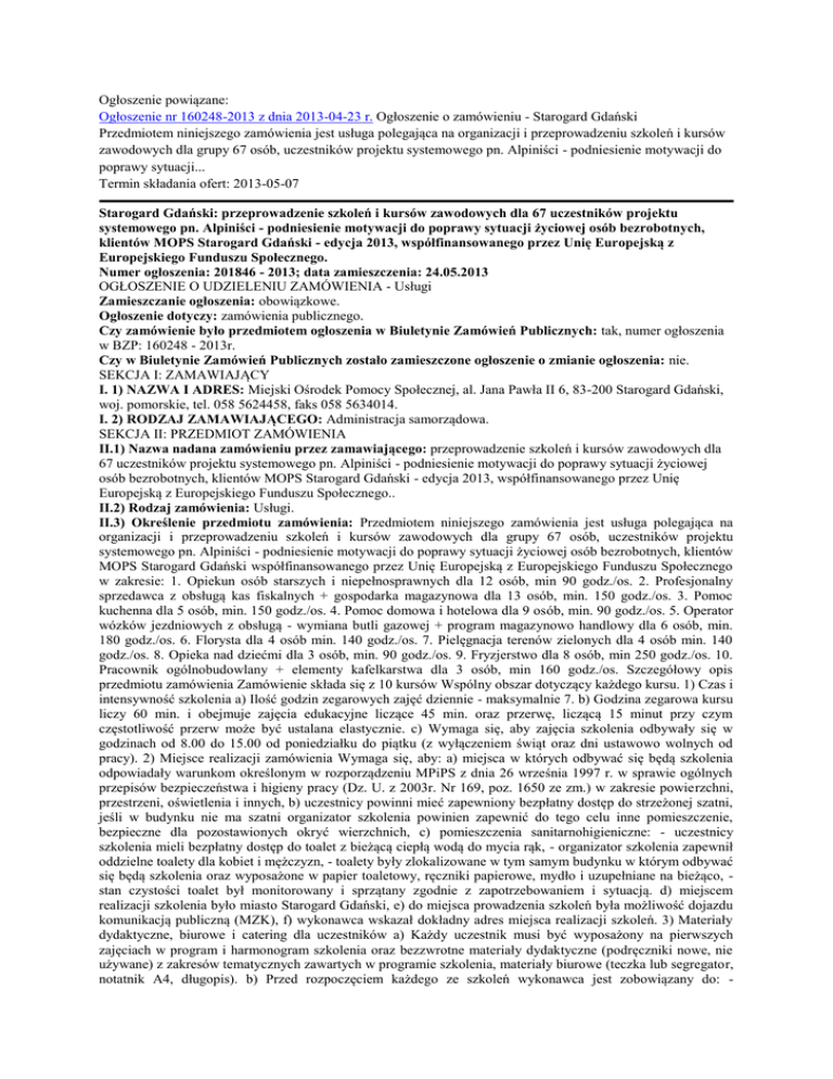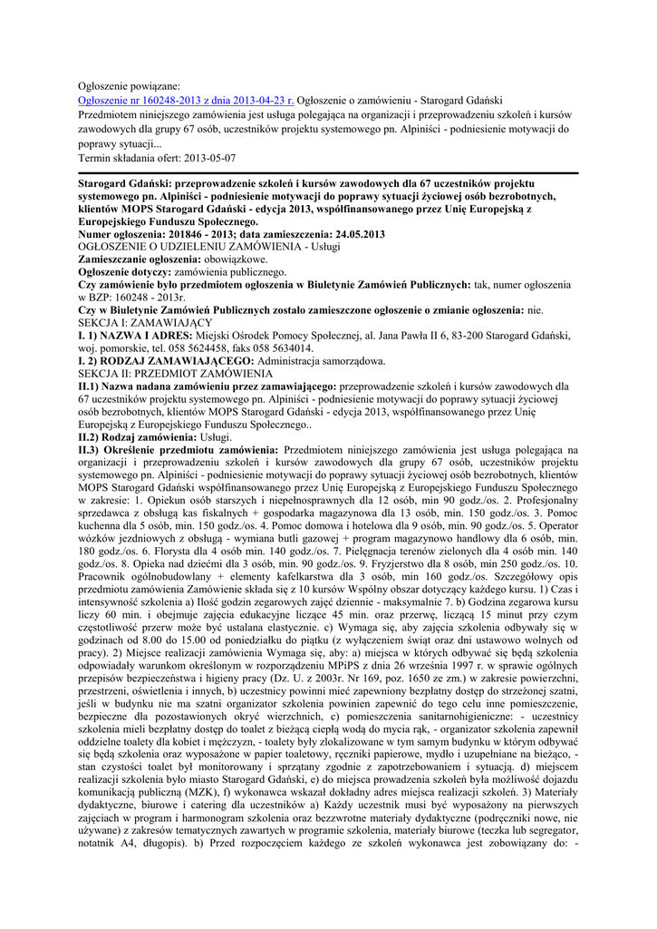 Ogłoszenie powiązane: Ogłoszenie nr 160248-2013 z dnia 2013-04-23 r. Ogłoszenie o zamówieniu - Starogard Gdański Przedmiotem niniejszego zamówienia jest usługa polegająca na organizacji i przeprowadzeniu szkoleń i kursów zawodowych dla grupy 67 osób, uczestników projektu systemowego pn. Alpiniści - podniesienie motywacji do poprawy sytuacji... Termin składania ofert: 2013-05-07 Starogard Gdański: przeprowadzenie szkoleń i kursów zawodowych dla 67 uczestników projektu systemowego pn. Alpiniści - podniesienie motywacji do poprawy sytuacji życiowej osób bezrobotnych, klientów MOPS Starogard Gdański - edycja 2013, współfinansowanego przez Unię Europejską z Europejskiego Funduszu Społecznego. Numer ogłoszenia: 201846 - 2013; data zamieszczenia: 24.05.2013 OGŁOSZENIE O UDZIELENIU ZAMÓWIENIA - Usługi Zamieszczanie ogłoszenia: obowiązkowe. Ogłoszenie dotyczy: zamówienia publicznego. Czy zamówienie było przedmiotem ogłoszenia w Biuletynie Zamówień Publicznych: tak, numer ogłoszenia w BZP: 160248 - 2013r. Czy w Biuletynie Zamówień Publicznych zostało zamieszczone ogłoszenie o zmianie ogłoszenia: nie. SEKCJA I: ZAMAWIAJĄCY I. 1) NAZWA I ADRES: Miejski Ośrodek Pomocy Społecznej, al. Jana Pawła II 6, 83-200 Starogard Gdański, woj. pomorskie, tel. 058 5624458, faks 058 5634014. I. 2) RODZAJ ZAMAWIAJĄCEGO: Administracja samorządowa. SEKCJA II: PRZEDMIOT ZAMÓWIENIA II.1) Nazwa nadana zamówieniu przez zamawiającego: przeprowadzenie szkoleń i kursów zawodowych dla 67 uczestników projektu systemowego pn. Alpiniści - podniesienie motywacji do poprawy sytuacji życiowej osób bezrobotnych, klientów MOPS Starogard Gdański - edycja 2013, współfinansowanego przez Unię Europejską z Europejskiego Funduszu Społecznego.. II.2) Rodzaj zamówienia: Usługi. II.3) Określenie przedmiotu zamówienia: Przedmiotem niniejszego zamówienia jest usługa polegająca na organizacji i przeprowadzeniu szkoleń i kursów zawodowych dla grupy 67 osób, uczestników projektu systemowego pn. Alpiniści - podniesienie motywacji do poprawy sytuacji życiowej osób bezrobotnych, klientów MOPS Starogard Gdański współfinansowanego przez Unię Europejską z Europejskiego Funduszu Społecznego w zakresie: 1. Opiekun osób starszych i niepełnosprawnych dla 12 osób, min 90 godz./os. 2. Profesjonalny sprzedawca z obsługą kas fiskalnych + gospodarka magazynowa dla 13 osób, min. 150 godz./os. 3. Pomoc kuchenna dla 5 osób, min. 150 godz./os. 4. Pomoc domowa i hotelowa dla 9 osób, min. 90 godz./os. 5. Operator wózków jezdniowych z obsługą - wymiana butli gazowej + program magazynowo handlowy dla 6 osób, min. 180 godz./os. 6. Florysta dla 4 osób min. 140 godz./os. 7. Pielęgnacja terenów zielonych dla 4 osób min. 140 godz./os. 8. Opieka nad dziećmi dla 3 osób, min. 90 godz./os. 9. Fryzjerstwo dla 8 osób, min 250 godz./os. 10. Pracownik ogólnobudowlany + elementy kafelkarstwa dla 3 osób, min 160 godz./os. Szczegółowy opis przedmiotu zamówienia Zamówienie składa się z 10 kursów Wspólny obszar dotyczący każdego kursu. 1) Czas i intensywność szkolenia a) Ilość godzin zegarowych zajęć dziennie - maksymalnie 7. b) Godzina zegarowa kursu liczy 60 min. i obejmuje zajęcia edukacyjne liczące 45 min. oraz przerwę, liczącą 15 minut przy czym częstotliwość przerw może być ustalana elastycznie. c) Wymaga się, aby zajęcia szkolenia odbywały się w godzinach od 8.00 do 15.00 od poniedziałku do piątku (z wyłączeniem świąt oraz dni ustawowo wolnych od pracy). 2) Miejsce realizacji zamówienia Wymaga się, aby: a) miejsca w których odbywać się będą szkolenia odpowiadały warunkom określonym w rozporządzeniu MPiPS z dnia 26 września 1997 r. w sprawie ogólnych przepisów bezpieczeństwa i higieny pracy (Dz. U. z 2003r. Nr 169, poz. 1650 ze zm.) w zakresie powierzchni, przestrzeni, oświetlenia i innych, b) uczestnicy powinni mieć zapewniony bezpłatny dostęp do strzeżonej szatni, jeśli w budynku nie ma szatni organizator szkolenia powinien zapewnić do tego celu inne pomieszczenie, bezpieczne dla pozostawionych okryć wierzchnich, c) pomieszczenia sanitarnohigieniczne: - uczestnicy szkolenia mieli bezpłatny dostęp do toalet z bieżącą ciepłą wodą do mycia rąk, - organizator szkolenia zapewnił oddzielne toalety dla kobiet i mężczyzn, - toalety były zlokalizowane w tym samym budynku w którym odbywać się będą szkolenia oraz wyposażone w papier toaletowy, ręczniki papierowe, mydło i uzupełniane na bieżąco, stan czystości toalet był monitorowany i sprzątany zgodnie z zapotrzebowaniem i sytuacją. d) miejscem realizacji szkolenia było miasto Starogard Gdański, e) do miejsca prowadzenia szkoleń była możliwość dojazdu komunikacją publiczną (MZK), f) wykonawca wskazał dokładny adres miejsca realizacji szkoleń. 3) Materiały dydaktyczne, biurowe i catering dla uczestników a) Każdy uczestnik musi być wyposażony na pierwszych zajęciach w program i harmonogram szkolenia oraz bezzwrotne materiały dydaktyczne (podręczniki nowe, nie używane) z zakresów tematycznych zawartych w programie szkolenia, materiały biurowe (teczka lub segregator, notatnik A4, długopis). b) Przed rozpoczęciem każdego ze szkoleń wykonawca jest zobowiązany do: - informowania uczestników szkolenia o obowiązujących przepisach, dotyczących bloków tematycznych z powyższego szkolenia, na dzień realizacji szkolenia, c) Uczestnikom szkolenia, w każdym dniu odbywania zajęć należy zapewnić catering, w skład którego ma wejść: - posiłek obiadowy tzn. posiłek jednodaniowy, mięsny pełnowartościowy pod względem odżywczym, różnorodny, zgodny z zasadami żywienia. Zamawiający dopuszcza raz w tygodniu przygotowanie posiłku bez mięsa, np.: naleśniki z serem. Każdy z posiłków musi zawierać minimum 1000 kalorii. Temperatura wydawanych posiłków powinna być zgodna z normami żywieniowymi. W przypadku posi