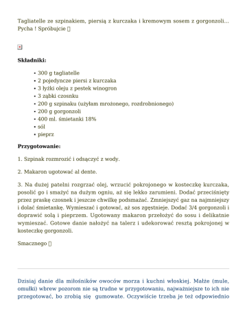 Tagliatelle ze szpinakiem, piersią z kurczaka i kremowym sosem z gorgonzoli… Pycha ! Spróbujcie Składniki: 300 g tagliatelle 2 pojedyncze piersi z kurczaka 3 łyżki oleju z pestek winogron 3 ząbki czosnku 200 g szpinaku (użyłam mrożonego, rozdrobnionego) 200 g gorgonzoli 400 ml. śmietanki 18% sól pieprz Przygotowanie: 1. Szpinak rozmrozić i odsączyć z wody. 2. Makaron ugotować al dente. 3. Na dużej patelni rozgrzać olej, wrzucić pokrojonego w kosteczkę kurczaka, posolić go i smażyć na dużym ogniu, aż się lekko zarumieni. Dodać przeciśnięty przez praskę czosnek i jeszcze chwilkę podsmażać. Zmniejszyć gaz na najmniejszy i dolać śmietankę. Wymieszać i gotować, aż sos zgęstnieje. Dodać 3/4 gorgonzoli i doprawić solą i pieprzem. Ugotowany makaron przełożyć do sosu i delikatnie wymieszać. Gotowe danie nałożyć na talerz i udekorować resztą pokrojonej w kosteczkę gorgonzoli. Smacznego Dzisiaj danie dla miłośników owoców morza i kuchni włoskiej. Małże (mule, omułki) wbrew pozorom nie są trudne w przygotowaniu, najważniejsze to ich nie przegotować, bo zrobią się gumowate. Oczywiście trzeba je też odpowiednio doprawić, aby wydobyć ich niepowtarzalny smak i aromat. Składniki: 200 g małży 400 g ryżu do risotto Arborio około 1 litra bulionu warzywnego 1/2 szklanki białego wytrawnego wina 2 łyżki oliwy z oliwek 1 cebula 3 ząbki czosnku 2 łyżki masła natka pietruszki sól, pieprz Przygotowanie: Świeże małże sprawdzamy czy mają zamkniętą skorupkę. Jeżeli są otwarte, stukamy lekko o blat. Jeśli małża się zamknie to znaczy, że jest świeża i odkładamy ją z pozostałymi, jeżeli nie to wyrzucamy (martwe powodują silne zatrucie). Następnie myjemy i oczyszczamy z narośli pod bieżącą wodą. Możemy również użyć małży mrożonych (będą już otwarte), ale świeże są smaczniejsze. Do garnka wlewamy bulion, dodajemy oliwę, sól, pieprz, czyste małże i przeciśnięty przez praskę czosnek. Gotujemy pod przykryciem około 4-5 min. W trakcie gotowania potrząsnąć garnkiem aby się wymieszały. Małże wyjmujemy z muszelek (kilka zostawiamy do dekoracji) i odkładamy. W dużej i szerokiej patelni roztopić 1 łyżkę masła, wrzucić drobno pokrojoną cebulkę i zeszklić. Dodajemy ryż i przez minutę podsmażamy mieszając, aż zrobi się szklisty. Wlewamy wino i gotujemy na średnim ogniu, aż wyparuje. Następnie dolewamy szklankę bulionu i często mieszamy. Gdy ryż wchłonie bulion, dolewamy kolejną szklankę i czynność powtarzamy, do momentu zużycia całego bulionu. Ryż gotujemy około 20 minut, pamiętając o częstym mieszaniu. Risotto wyłączamy, dodajemy małże bez muszelek, resztę masła, posiekaną natkę pietruszki i delikatnie mieszamy. Przekładamy na talerz i dekorujemy małżami w muszlach. Smacznego Cannelloni nadziewane szpinakiem i ricottą pod beszamelem to rodzaj zapiekanki, do której chętnie wracam. Zresztą… uwielbiam prawie wszystko co zapiekane Składniki: 15 rurek cannelloni 3 łyżki startego parmezanu do posypania Farsz: 500 g szpinaku (użyłam rozdrobniony, mrożony) 250 g ricotty 4 ząbki czosnku 1 łyżka masła 1 łyżka soku z cytryny 1 łyżka startego parmezanu sól, pieprz Sos beszamelowy: 2 łyżki masła 2 łyżki maki 2 szklanki mleka szczypta gałki muszkatołowej sól biały pieprz Przygotowanie: Szpinak przekładamy do szerokiego rondelka, dodajemy masło, przeciśnięty przez praskę czosnek i chwilkę gotujemy, aż woda odparuje. Szpinak studzimy i dokładnie mieszamy z ricottą, parmezanem i sokiem z cytryny. Doprawiamy solą i pieprzem. Gotowym farszem wypełniamy rurki (nie gotujemy) za pomocą rękawa cukierniczego. Jeżeli nie mamy, wypełniamy farszem duży woreczek do mrożonek, obcinamy jeden z narożników i nadziewamy rurki. Sos beszamelowy: W rondelku rozpuszczamy masło (na małym gazie), dodajemy mąkę i dokładnie mieszamy. Dolewamy mleko, cały czas energicznie mieszając, aż sos zgęstnieje. Dodajemy szczyptę gałki muszkatołowej i doprawiamy solą i pieprzem. Naczynie żaroodporne smarujemy delikatnie masłem i układamy w nim rurki z farszem. Całość dokładnie zalewamy sosem beszamelowym i posypujemy startym parmezanem. Wstawiamy do piekarnika nagrzanego do 175’C na około 35 minut. Smacznego Sos boloński to sos mięsny z dodatkiem warzyw, pomidorów i czerwonego wina. Ragu alla bolognese jest jednym z najbardziej popularnych i aromatycznych włoskich sosów, który przez długie i powolne gotowanie zawdzięcza swój wyborny smak. Podaje się go z makaronem typu tagliatelle. Składniki: 500 g mielonej wołowiny 100 g boczku 2 łodygi selera naciowego 1 duża marchewka 1 cebula 1 szklanka wytrawnego czerwonego wina 1 puszka pomidorów pelati 2 łyżki koncentratu pomidorowego 1 szklanka mleka 1 szklanka bulionu wołowego 3 łyżki oliwy z oliwek 1 łyżka masła starty parmezan sól, pieprz Przygotowanie: Na dużej, szerokiej patelni rozgrzać oliwę z oliwek i masło, wrzucić drobno posiekaną cebulę, seler naciowy, boczek, startą na drobnych oczkach marchewkę i podsmażyć. Następnie dodać mieloną wołowinę i smażyć, aż mięso zmieni kolor. Dolać wino, zmiksowane pomidory, koncentrat pomidorowy i bulion. Wymieszać i dusić pod przykryciem przez około 1/2 godziny. Potem wlać mleko i dusić kolejne 1 i 1/2 godziny od czasu do czasu mieszając. Doprawić solą i pieprzem. Podawać z makaronem tagliatelle i posypanym parmezanem. Smacznego Spaghetti pangrattato to makaron z chrupiącymi okruszkami chleba lub bułką tartą. Danie jest przykładem tego, że wystarczy kilka prostych składników, aby uzyskać zaskakujący efekt. Polecam Składniki: 300 g spaghetti 1 szklanka okruszków chleba (czerstwy chleb rozdrobniony malakserem lub bardzo drobno pokrojony) 1/2 łyżeczki suszonej papryczki chilli 3 ząbki czosnku 1 pęczek natki pietruszki skórka z 1 cytryny sok z 1/2 cytryny oliwa z oliwek (około 