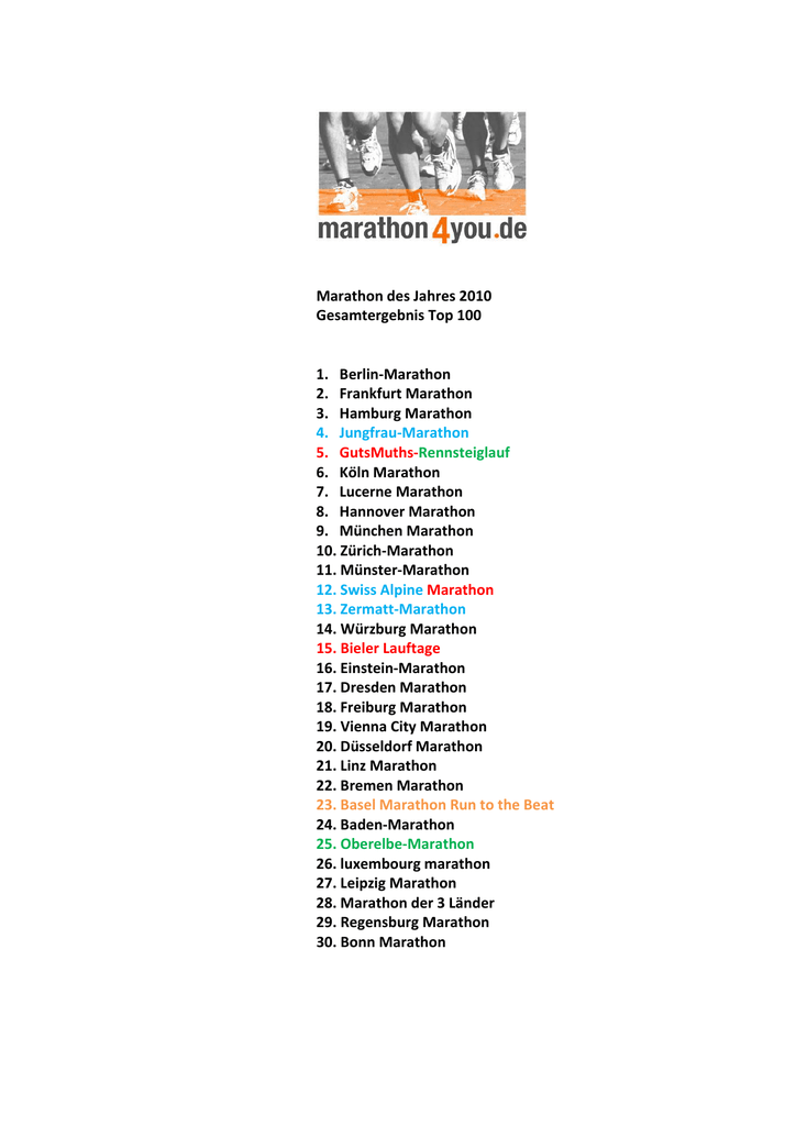 Marathon des Jahres 2010 Gesamtergebnis Top 100 1. Berlin‐Marathon 2. Frankfurt Marathon 3. Hamburg Marathon 4. Jungfrau‐Marathon 5. GutsMuths‐Rennsteiglauf 6. Köln Marathon 7. Lucerne Marathon 8. Hannover Marathon 9. München Marathon 10. Zürich‐Marathon 11. Münster‐Marathon 12. Swiss Alpine Marathon 13. Zermatt‐Marathon 14. Würzburg Marathon 15. Bieler Lauftage 16. Einstein‐Marathon 17. Dresden Marathon 18. Freiburg Marathon 19. Vienna City Marathon 20. Düsseldorf Marathon 21. Linz Marathon 22. Bremen Marathon 23. Basel Marathon Run to the Beat 24. Baden‐Marathon 25. Oberelbe‐Marathon 26. luxembourg marathon 27. Leipzig Marathon 28. Marathon der 3 Länder 29. Regensburg Marathon 30. Bonn Marathon 31. Röntgenlauf 32. Alpin‐Marathon Liechtenstein 33. Tour de Tirol 34. Rund um den Baldeneysee 35. Salzburg Marathon 36. Marathon Mannheim Rhein Neckar 37. Kassel Marathon 38. Bottwartal‐Marathon 39. Hasetal‐Marathon 40. Heilbronner Trollinger Marathon 41. Metropol Marathon 42. Spreewald Marathon 43. Bad Pyrmont Marathon 44. Graubünden Marathon 45. Gutenberg‐Marathon Mainz 46. Rhein‐Ruhr‐Marathon 47. Alb Marathon 48. Brocken‐Marathon 49. Ulmer Laufnacht 50. Schwarzwald‐Marathon 51. Magdeburg‐Marathon 52. Fränkische Schweiz Marathon 53. Europa‐Marathon Görlitz 54. Harzquerung 55. Monschau‐Marathon 56. Königsschlösser‐Romantikmarathon 57. St. Wendel Marathon 58. Skatstadtmarathon Altenburg 59. Kyffhäuser Bergmarathon 60. Rothaarsteig‐Marathon 61. Mittelrhein‐Marathon 62. Chemnitz‐Marathon 63. Darß‐Marathon 64. Allgäu Panorama Marathon 65. Bienwald‐Marathon 66. Lausanne Marathon 67. Marathon Deutsche Weinstraße 68. Tollenseseelauf 69. Mitteldeutscher Marathon 70. Darmstadt‐Marathon 71. Weiltalweg‐Landschaftsmarathon 72. Zeiler Waldmarathon 73. Alpin Marathon Oberstaufen 74. WACHAUmarathon 75. Gletschermarathon 76. Rursee‐Marathon 77. Gondo Event 78. Goitzsche‐Marathon 79. Hunsrück Marathon 80. Saale‐Rennsteig‐Marathon 81. Helgoland‐Marathon 82. Oldenburger Marathon 83. Bottroper Herbstwaldlauf 84. Obermain‐Marathon 85. Potsdamer Schlösser‐Marathon 86. Leipziger Wintermarathon 87. Saaletal‐Marathon 88. Untertage‐Marathon 89. Müritz‐Lauf 90. Brixen Dolomiten Marathon 91. Ebm‐Papst Marathon 92. Willinger Panoramalauf 93. Winterthur Marathon 94. Familien‐Marathon Welver 95. Donautal‐Marathon 96. Steinfurter Marathonlauf 97. Eifelmarathon 98. Hornisgrinde Marathon 99. Bad Waldseer Lauffieber 100. marathon nacht rostock Bergmarathon Ultra‐Marathon Landschaftsmarathon Newcomer