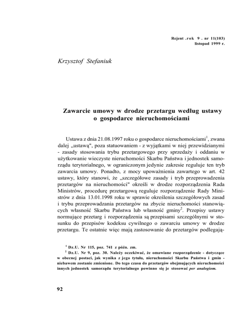 Rejent .rok 9 . nr 11(103) listopad 1999 r. Krzysztof Stefaniuk Zawarcie umowy w drodze przetargu według ustawy o gospodarce nieruchomościami Ustawa z dnia 21.08.1997 roku o gospodarce nieruchomościami1, zwana dalej „ustawą", poza statuowaniem - z wyjątkami w niej przewidzianymi - zasady stosowania trybu przetargowego przy sprzedaży i oddaniu w użytkowanie wieczyste nieruchomości Skarbu Państwa i jednostek samorządu terytorialnego, w ograniczonym jedynie zakresie reguluje ten tryb zawarcia umowy. Ponadto, z mocy upoważnienia zawartego w art. 42 ustawy, który stanowi, że „szczegółowe zasady i tryb przeprowadzenia przetargów na nieruchomości" określi w drodze rozporządzenia Rada Ministrów, procedurę przetargową reguluje rozporządzenie Rady Ministrów z dnia 13.01.1998 roku w sprawie określenia szczegółowych zasad i trybu przeprowadzania przetargów na zbycie nieruchomości stanowiących własność Skarbu Państwa lub własność gminy2. Przepisy ustawy normujące przetarg i rozporządzenia są przepisami szczególnymi w stosunku do przepisów kodeksu cywilnego o zawarciu umowy w drodze przetargu. Te ostatnie więc mają zastosowanie do przetargów podlegają1 Dz.U. Nr 115, poz. 741 z późn. zm. Dz.U. Nr 9, poz. 30. Należy oczekiwać, że omawiane rozporządzenie - dotyczące w obecnej postaci, jak wynika z jego tytułu, nieruchomości Skarbu Państwa i gmin niebawem zostanie zmienione. Do tego czasu do przetargów obejmujących nieruchomości innych jednostek samorządu terytorialnego powinno się je stosować per analogiom. 2 92 Zawarcie umowy w drodze przetargu.. cych omawianej ustawie tylko w zakresie nie uregulowanym odmiennie w przepisach tej ustawy i rozporządzenia. Przechodząc po tym wstępie do omawiania poszczególnych kwestii związanych z tematem opracowania, chciałbym już w tym miejscu zaznaczyć, że pominę w dalszych rozważaniach problematykę wyboru formy przetargu oraz w zasadzie problematykę ogłoszenia przetargu i wniesienia wadium, gdyż zagadnieniom tym poświęcony jest osobny artykuł. 2. Przetarg ustny - poza tym, że dotyczą go przepisy ogólne wspomnianego na wstępie rozporządzenia wykonawczego - uregulowany jest w rozdziale 2, a przetarg ustny ograniczony ponadto w rozdziale 3 tegoż rozporządzenia. Natomiast ustawa, wymieniając te „formy" przetargu, ogranicza się do wskazania, gdy chodzi o założenia konstrukcyjne przetargu ustnego, że „przetarg ustny ma na celu uzyskanie najwyższej ceny (art. 40 ust. 2 zd. 1). Zanim przystąpię do analizy tych szczególnych uregulowań, należy przypomnieć, że według kodeksu cywilnego (art. 702) „oferta złożona w toku przetargu ustnego przestaje wiązać, gdy inny licytant złoży ofertę korzystniejszą albo przetarg zostanie zamknięty bez wybrania którejkolwiek z ofert, chyba że w warunkach przetargu zastrzeżono inaczej" (§ 1); zaś zawarcie umowy w drodze tego przetargu „następuje z chwilą wybrania oferty" (§ 2). Przepisy rozporządzenia, choć oczywiście nawiązują do kodeksowej konstrukcji przetargu ustnego, wprowadzająrozwiązania nadające mu „własne oblicze". Nie chodzi tylko o to, że rozporządzenie - w ślad za cytowanym postanowieniem ustawy, z którego wynika, iż przetarg ustny ma zapewnić uzyskanie najwyższej ceny - dookreśla „ofertę korzystniejszą": jest to oferta z wyższą ceną, ponadto ustala, iż pierwsze postąpienie (oferta) musi przewyższać co najmniej o 1% tzw. cenę wywoławczą, zaś kolejne postąpienia (oferty korzystniejsze) muszą wynosić nie mniej niż 1% tejże ceny (§ 13 ust. 4 w zw. z § 12 pkt 1 rozp.); określa też szczegółowo sposób zakończenia składania ofert (postąpień) - nie jest to już możliwe po trzecim wywołaniu ostatniej (najwyższej) ceny (§ 13 ust. 2, 3 i 6). Swoistość przyjętych w rozporządzeniu rozwiązań polega przede wszystkim na tym, że w przeciwieństwie do kodeksu cywilnego (zob. art. 702 § 1 in fitie) nie przewiduje ono możliwości - oraz, jak sądzę, wyłącza zastrzeżenie takiego uprawnienia w warunkach przetargowych - zamknięcia 93 Krzysztof Stefaniuk przetargu „bez wybrania którejkolwiek z ofert", a więc możliwości uchylenia się organizatora przetargu (komisji przetargowej) od „wybrania" oferty, jeżeli po otwarciu przetargu choćby jedna osoba „dopuszczona do przetargu" (§ 13 ust. 1 i § 15 pkt 3) złożyła ważną ofertę, czyli dokonała wobec komisji przetargowej (p. § 8 ust. 1 i § 13 ust. 1 rozp.) postąpienia odpowiadającego wymaganiom przewidzianym w § 13 ust. 4 rozp. Podstawy dla takiego wniosku nie należy co prawda upatrywać w treści § 13 ust. 5, który stanowi jedynie, że „Przetarg jest ważny bez względu na liczbę uczestników, jeżeli chociaż jeden uczestnik zaoferował co najmniej jedno postąpienie powyżej ceny wywoławczej". Uzasadnia go natomiast § 8 ust. 3 rozp., z którego pośrednio wynika, że po dokonaniu choćby jednego ważnego postąpienia komisja przetargowa nie podejmuje już w głosowaniu decyzji w sprawie jego przyjęcia; jak też zwłaszcza § 13 ust. 6 rozp., którego kategoryczne brzmienie nie pozostawia wątpliwości, że po ustaniu postąpień, działająca w imieniu organizatora przetargu komisja (p. niżej pkt 3) nie może oświadczyć, iż żadnej oferty nie przyjmuje (odmówić tzw. przybicia), przeciwnie - jej przewodniczący obowiązany jest, zamykając przetarg, ogłosić (verbum legis: „ogłasza"), że przetarg wygrała osoba, która dokonała ostatniego postąpienia (złożyła najwyższą cenowo, spełniającą wymogi z § 13 ust. 4, ofertę). Nie uważam jednakże, by treść cytowanych przepisów dawała podstawę do wniosku, że w rozporządzeniu przyjęta została całkowicie odmienna niż w kodeksie cywilnym konstrukcja przetargu ustnego; że mianowicie kolejne, złożone w nim propozycje zapłaty wyższej ceny (postąpienia) nie są ofertami zawarcia umowy, lecz oświadczeniami woli 