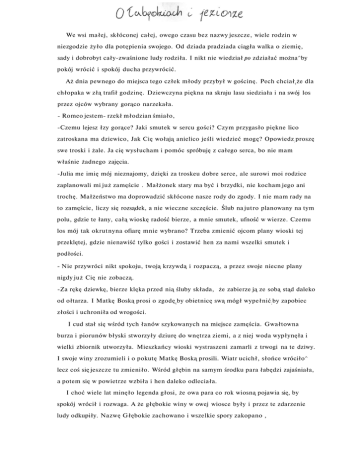 We wsi małej, skłóconej całej, owego czasu bez nazwy jeszcze, wiele rodzin w niezgodzie żyło dla potępienia swojego. Od dziada pradziada ciągła walka o ziemię, sady i dobrobyt cały-zwaśnione ludy rodziła. I nikt nie wiedział po zdziałać można^by pokój wrócić i spokój ducha przywrócić. Aż dnia pewnego do miejsca tego człek młody przybył w gościnę. Pech chciał ( że dla chłopaka w złą trafił godzinę. Dziewczyna piękna na skraju lasu siedziała i na swój los przez ojców wybrany gorąco narzekała. - Romeo jestem- rzekł młodzian śmiało, -Czemu lejesz łzy gorące? Jaki smutek w sercu gości? Czym przygasło piękne lico zatroskana ma dziewico, Jak Cię wołają anielico jeśli wiedzieć mogę? Opowiedz ; proszę swe troski i żale. Ja cię wysłucham i pomóc spróbuję z całego serca, bo nie mam właśnie żadnego zajęcia. -Julia me imię mój nieznajomy, dzięki za troskeu dobre serce, ale surowi moi rodzice zaplanowali mi już zamęście . Małżonek stary ma być i brzydki, nie kocham jego ani trochę. Małżeństwo ma doprowadzić skłócone nasze rody do zgody. I nie mam rady na to zamęście, liczy się rozsądek, a nie wieczne szczęście. Ślub na jutro planowany na tym polu, gdzie te łany, całą wioskę radość bierze, a mnie smutek, ufność w wierze. Czemu los mój tak okrutnyna ofiarę mnie wybrano? Trzeba zmienić ojcom plany wioski tej przeklętej, gdzie nienawiść tylko gości i zostawić hen za nami wszelki smutek i podłości. - Nie przywróci nikt spokoju, twoją krzywdą i rozpaczą, a przez swoje niecne plany nigdy już Cię nie zobaczą. -Za rękę dziewkę, bierze klęka przed nią śluby składa, że zabierze ją ze sobą stąd daleko od ołtarza. I Matkę Boską prosi o zgodę ( by obietnicę swą mógł wypełnić ; by zapobiec złości i uchroniła od wrogości. I cud stał się wśród tych łanów szykowanych na miejsce zamęścia. Gwałtowna burza i piorunów błyski stworzyły dziurę do wnętrza ziemi, a z niej woda wypłynęła i wielki zbiornik utworzyła. Mieszkańcy wioski wystraszeni zamarli z trwogi na te dziwy. I swoje winy zrozumieli i o pokutę Matkę Boską prosili. Wiatr ucichł, słońce wróciło^ lecz coś się jeszcze tu zmieniło. Wśród głębin na samym środku para łabędzi zajaśniała, a potem się w powietrze wzbiła i hen daleko odleciała. I choć wiele lat minęło legenda głosi, że owa para co rok wiosną pojawia się, by spokój wrócił i rozwaga. A że głębokie winy w owej wiosce były i przez te zdarzenie ludy odkupiły. Nazwę Głębokie zachowano i wszelkie spory zakopano ,