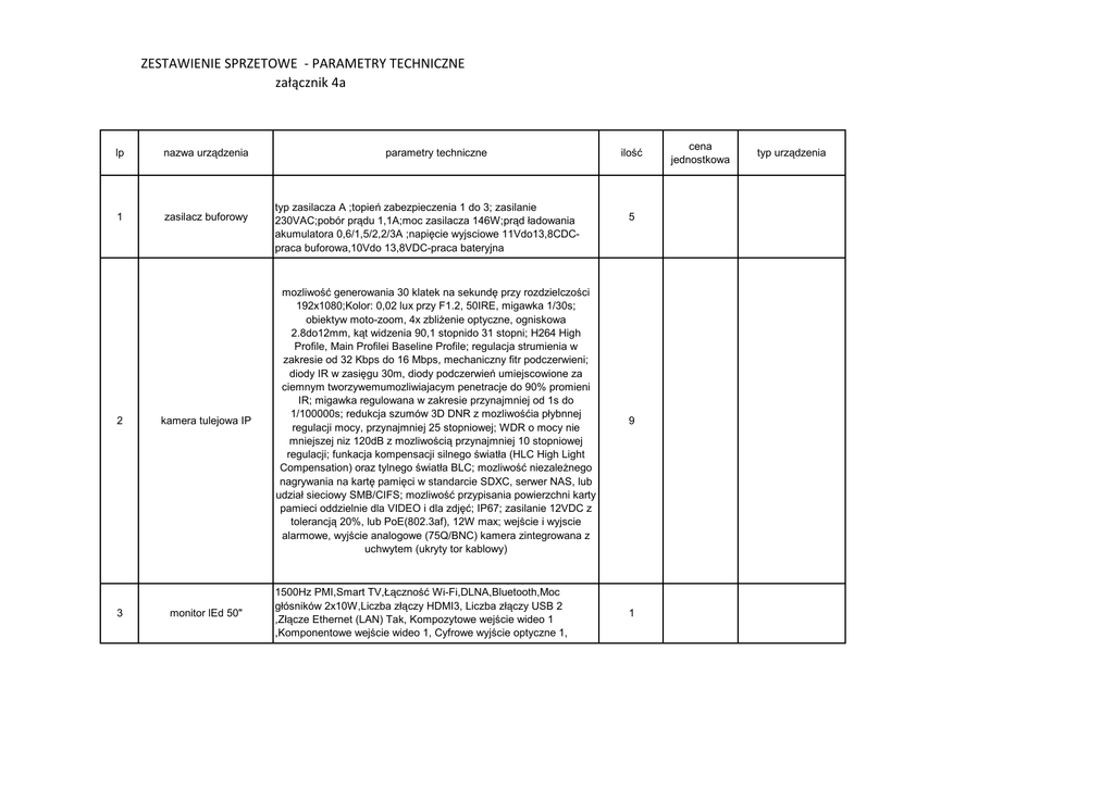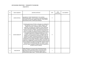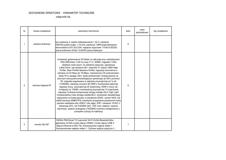 ZESTAWIENIE SPRZETOWE - PARAMETRY TECHNICZNE załącznik 4a lp nazwa urządzenia 1 zasilacz buforowy 2 3 kamera tulejowa IP monitor lEd 50" parametry techniczne typ zasilacza A ;topień zabezpieczenia 1 do 3; zasilanie 230VAC;pobór prądu 1,1A;moc zasilacza 146W;prąd ładowania akumulatora 0,6/1,5/2,2/3A ;napięcie wyjsciowe 11Vdo13,8CDCpraca buforowa,10Vdo 13,8VDC-praca bateryjna mozliwość generowania 30 klatek na sekundę przy rozdzielczości 192x1080;Kolor: 0,02 lux przy F1.2, 50IRE, migawka 1/30s; obiektyw moto-zoom, 4x zbliżenie optyczne, ogniskowa 2.8do12mm, kąt widzenia 90,1 stopnido 31 stopni; H264 High Profile, Main Profilei Baseline Profile; regulacja strumienia w zakresie od 32 Kbps do 16 Mbps, mechaniczny fitr podczerwieni; diody IR w zasięgu 30m, diody podczerwień umiejscowione za ciemnym tworzywemumozliwiajacym penetracje do 90% promieni IR; migawka regulowana w zakresie przynajmniej od 1s do 1/100000s; redukcja szumów 3D DNR z mozliwośćia płybnnej regulacji mocy, przynajmniej 25 stopniowej; WDR o mocy nie mniejszej niz 120dB z mozliwością przynajmniej 10 stopniowej regulacji; funkacja kompensacji silnego światła (HLC High Light Compensation) oraz tylnego światła BLC; mozliwość niezależnego nagrywania na kartę pamięci w standarcie SDXC, serwer NAS, lub udział sieciowy SMB/CIFS; mozliwość przypisania powierzchni karty pamieci oddzielnie dla VIDEO i dla zdjęć; IP67; zasilanie 12VDC z tolerancją 20%, lub PoE(802.3af), 12W max; wejście i wyjscie alarmowe, wyjście analogowe (75Q/BNC) kamera zintegrowana z uchwytem (ukryty tor kablowy) Przekatna obrazu 50”,Rozdzielczość 3840x2160 (4K),Odswiezanie 1500Hz PMI,Smart TV,Łączność Wi-Fi,DLNA,Bluetooth,Moc głósników 2x10W,Liczba złączy HDMI3, Liczba złączy USB 2 ,Złącze Ethernet (LAN) Tak, Kompozytowe wejście wideo 1 ,Komponentowe wejście wideo 1, Cyfrowe wyjście optyczne 1, ilość 5 9 1 cena jednostkowa typ urządzenia 4 urządzenie do cyfrowego zapisu obrazu kamer 8 interfejsów SATA,obsługa dysków 6TB, 8 kieszeni dyskowych, złącze eSATA;obsługa RAID0,RAID1,RAID5,RAID10;mozliwość podłączenia 32 kamer, obsługa rozdzielczości 12Megapikseli;minimum 2 interfejsy sieciowe Gigabit Ethernet;mozliwość niezależnejpracy interfejsów:tryb rozdzielania ruchu sieciowego,lub redundancji;minimu 3 interfejsy USB- co najmniej 1 w w standarcie 3.0; rejestrator musi umozliwić obsługę kamer firm trzecich : ACTI,Arecont,AXIS,Bosch,Brickcom,Canon,Hikvision,PANASONIC, Pelco,SAMSUNG,SANYO,SONY,Vivotekoraz kamer z protokołem ONVIF i PSIA; możliwość pracy rejestratora w trybie "Hot-Spare". sprawdza inne rejstratory w sieci, jeśli wykryje usterkę jednego z nich przejmuje wszystkie kamery które były do niego przy[pisane i zaczyna zapisywanie nagrań . Po przywróceniu rejestratora, nagrania są automatycznie synchronizowane 5 dysk HDD 4TB przeznaczone są do systemów monitoringu, zamknięty w obudowie 3,5" ze złączem SATA/600 ,wykorzystują technologię IntelliPower; bufor 64MB,czas dpostepu 4,5ms,interfejs SATA 3,czas dostepu odczytywanie 5,1ms, czas dostepu zapisywanie 5,1ms 6 6 akumulator 12V/40Ah okres żywotnośći 5 lat 5 7 Oprogramowanie obsługujące elektroniczny system zabezpieczeń w MNG to IFTER EQU Enterprise, w przypadku gdy Wykonawca oprogramowanie zaproponuje inne oprogramowanie niż IFTER EQU Enterprise, nie wizualizacyjne systemów kompatybilne z istniejacymi oprogramowaniami w obiektach MNG, ESZ Wykonawca zobowiązany jest do wymiany oprogramowania we wszystkich oddziałach, w taki sposób, aby zapewnić funkcjonowanie systemu. 1 1 8 interfejs sieciowy zasilaczy wspólpracujacy kompatybilnie z zasilaczami buforowymi 5 9 interfejs SSP wspólpracujacy kompatybilnie z centralą SSP zainstalowana w obiekcie i programem wizualizacyjnym 1 10 urządzenie przenosne do serwisowania i administrowania elektronicznymi systemami zabezpieczeń/a w razie awarii zastepuje urzadzenie zarzadzajace elektronicznymi systemami zabezpieczeń parametry w tabeli poniżej 2 Wyświetlacz o przekątnej pomiędzy 15-16 cali i rozdzielczości przynajmniej 1920 na 1080 z podświetleniem LED matowy aby zminimalizować odblaski Procesor Typ procesora x86 Przykładowo: Intel Core i5 6300U lub równoważny: Warunki równoważności –wydajności nie mniejsza w teście procesora niż 4300 punktów. Pamięć operacyjna Zainstalowane przynajmniej 8GB o prędkości taktowania powyżej 2100Mhz W przypadku zaproponowania pamięci 8GB musi być możliwość dołożenia pamięci do wolnego banku. Pamięć masowa Dysk typu flash o pojemności przynajmniej 256GB Karta grafiki Obsługująca w pełni parametry ekranu Karta dźwiękowa Zintegrowana Kamera Wbudowana kamera o rozdzielczości minimum 1,0 MPix Karty sieciowe Karta WiFi zgodna ze standardami ac/a/b/g/n Bluetooth o standardzie przynajmniej 4.0 Modem WWAN (3G lub LTE) z możliwością zainstalowania karty SIM dowolnego polskiego operatora sieci GSM Karta LAN 10/100/1000 Porty Przynajmniej trzy porty USB 3 przy czym jeden Power Share Slot na karty SD Złącze HDMI Złącze VGA Złącze combo audio ( mikrofon/ słuchawki ) Klawiatura QWERTY Gładzik Zamontowany touchpad Mysz Bezprzewodowa laserowa Bluetooth Napęd optyczny Zewnętrzny przenośny napęd USB Wymagania dodatkowe Waga netto poniżej 2,0 kg Zamontowany czytnik linii papilarnych Komputer z linii biznesowej producenta wraz z torbą do komputera Złącze stacji dokującej umożliwiające podłączenie dodatkowych portów : D-Sub, DVI, DisplayPort, RJ-45, eSATA, USB System operacyjny System operacyjny Windows 7 PL w wersji biznesowej 64 bitowej lub równoważny w obsłudze i możliwościach. http://w ww.cpub enchmark .net/cpu_ System operacyjny Warunki równoważności: zapewniający kompatybilność z posiadaną infrastrukturą sieciowo-systemową opartą o produkty firmy Microsoft z rodziny Windows. W Muzeum wdrożone jest środowisko oparte o usługi Microsoft Active Directory z wdrożoną po