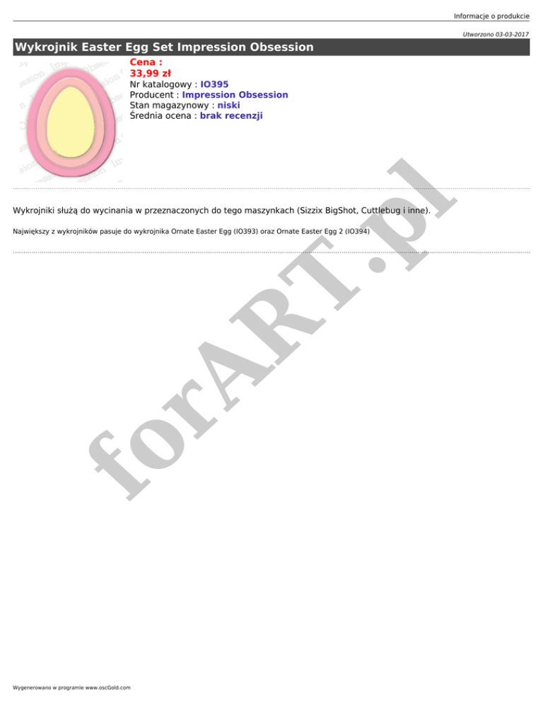 Informacje o produkcie Utworzono 03-03-2017 Wykrojnik Easter Egg Set Impression Obsession Cena : 33,99 zł T. pl Nr katalogowy : IO395 Producent : Impression Obsession Stan magazynowy : niski Średnia ocena : brak recenzji Wykrojniki służą do wycinania w przeznaczonych do tego maszynkach (Sizzix BigShot, Cuttlebug i inne). fo rA R Największy z wykrojników pasuje do wykrojnika Ornate Easter Egg (IO393) oraz Ornate Easter Egg 2 (IO394) Wygenerowano w programie www.oscGold.com