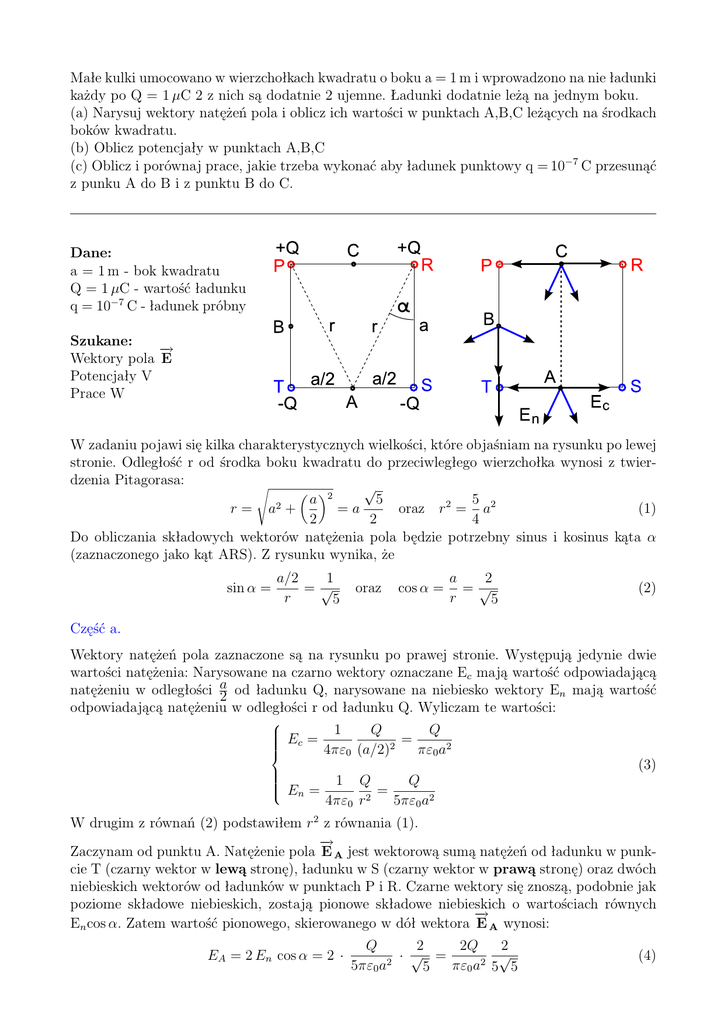 Małe kulki umocowano w wierzchołkach kwadratu o boku a = 1 m i wprowadzono na nie ładunki każdy po Q = 1 µC 2 z nich są dodatnie 2 ujemne. Ładunki dodatnie leżą na jednym boku. (a) Narysuj wektory natężeń pola i oblicz ich wartości w punktach A,B,C leżących na środkach boków kwadratu. (b) Oblicz potencjały w punktach A,B,C (c) Oblicz i porównaj prace, jakie trzeba wykonać aby ładunek punktowy q = 10−7 C przesunąć z punku A do B i z punktu B do C. Dane: a = 1 m - bok kwadratu Q = 1 µC - wartość ładunku q = 10−7 C - ładunek próbny Szukane: − → Wektory pola E Potencjały V Prace W W zadaniu pojawi się kilka charakterystycznych wielkości, które objaśniam na rysunku po lewej stronie. Odległość r od środka boku kwadratu do przeciwległego wierzchołka wynosi z twierdzenia Pitagorasa: s √ 2 a 5 5 2 r= a + =a oraz r2 = a2 (1) 2 2 4 Do obliczania składowych wektorów natężenia pola będzie potrzebny sinus i kosinus kąta α (zaznaczonego jako kąt ARS). Z rysunku wynika, że sin α = a/2 1 =√ r 5 oraz cos α = a 2 =√ r 5 (2) Część a. Wektory natężeń pola zaznaczone są na rysunku po prawej stronie. Występują jedynie dwie wartości natężenia: Narysowane na czarno wektory oznaczane Ec mają wartość odpowiadającą natężeniu w odległości a 2 od ładunku Q, narysowane na niebiesko wektory En mają wartość odpowiadającą natężeniu w odległości r od ładunku Q. Wyliczam te wartości: Q Q Ec = 1 = 4πε0 (a/2)2 πε0 a2 (3) 1 Q Q En = = 4πε0 r2 5πε0 a2 W drugim z równań (2) podstawiłem r2 z równania (1). − → Zaczynam od punktu A. Natężenie pola E A jest wektorową sumą natężeń od ładunku w punkcie T (czarny wektor w lewą stronę), ładunku w S (czarny wektor w prawą stronę) oraz dwóch niebieskich wektorów od ładunków w punktach P i R. Czarne wektory się znoszą, podobnie jak poziome składowe niebieskich, zostają pionowe składowe niebieskich o wartościach równych − → En cos α. Zatem wartość pionowego, skierowanego w dół wektora E A wynosi: Q 2 2Q 2 √ EA = 2 En cos α = 2 · · √ = (4) 2 2 5πε0 a πε0 a 5 5 5 Specjalnie zapisałem wynik w (4) w takiej postaci bo pierwszy z ułamków pojawi się także poniżej i będzie łatwiej liczyć. W punkcie C sytuacja jest analogiczna, więc EC = EA . Należy tylko pamiętać, że czarny wektor zwrócony w lewo pochodzi od ładunku w R, a wektor zwrócony w prawo od ładunku w P. Czytelnika proszę o ewentualne przerysowanie obrazka z poprzedniej strony do analizy natężenia pola w punkcie B. W tym punkcie czarne wektory od ładunków w punktach P i T dodają się, natomiast składowe poziome niebieskich wektorów od R i S się znoszą, a pionowe dodają. Składowe pionowe niebieskich wektorów mają wartości En sin α, całkowity skierowany pionowo − → w dół wektor E B ma więc wartość: Q Q 1 2Q EB = 2 Ec + 2 En sin α = 2 · +2 · · √ = 2 2 πε0 a 5πε0 a πε0 a2 5 1 1+ √ 5 5 ! (5) Teraz się wyjaśnia, dlaczego wzory (4,5) zapisałem jak wyżej. Wystarczy raz obliczyć powtarzający się w nich czynnik. Najpierw sprawdzam wymiar tego czynnika. Z tablic znajduję wartość przenikalności dielektrycznej próżni ε0 . ε0 = 8,85 · 10−12 C2 N · m2 h i E = C = N C (6) C 2 ·m N · m2 To jest poprawny wymiar, ponieważ natężenie pola elektrostatycznego mnożone przez ładunek ma dawać siłę w niutonach. Podstawiam dane z zadania. Zamieniam 1 µC na 10−6 C i obliczam ułamek wspólny dla obu natężeń: 2 2Q 2 · 10−6 = ≈ 72000 πε0 a2 π · 8,85 · 10−12 · 12 (7) Teraz wartości natężeń ze wzorów (4) i (5) 2 EA = EC = 72000 · √ ≈ 12000 5 5 EB = 72000 · 1 1+ √ 5 5 (8) ! ≈ 78500 Obie wartości natężeń są wyrażone w N/C. Kierunki i zwroty wektorów natężeń są wszystkie jednakowe: pionowo w dół w sensie rysunku na poprzedniej stronie. Część b. Liczenie potencjałów będzie prostsze gdyż dodają się one skalarnie. W punkcie B potencjały od ładunków w P i T oraz w R i S znoszą się, gdyż odległości są równe, a znaki ładunków przeciwne. Wobec tego VB = 0. Wartości potencjałów w punktach A i C są jednakowe, ale znaki przeciwne, przy czym potencjał w punkcie C z powodu bliskości ładunków dodatnich będzie dodatni. Obliczam go. Jest to suma dwóch jednakowych potencjałów od ładunków Q w P i R (w odległości a/2) minus suma potencjałów od punktów T i S (w odległości r). Dostaję w punkcie C: 1 Q 1 Q Q 1 VC = 2 −2 = 1− √ 4πε0 a/2 4πε0 r πε0 a 5 ! (9) Podstawiłem r z równania (1). Specjalnie przedstawiłem wzór (9) jak wyżej gdyż wykorzystam w obliczeniach wynik (7) zauważając, że a = 1. Wobec tego cały ułamek ma wartość 36000. Ale wymiar [V] będzie inny. Sprawdzam ten wymiar. Różnica między wymiarem w wyrażeniu (6) i obecnym polega jedynie na pomnożeniu poprzedniego wymiaru przez metr. Czyli: h i V = N J · m= =V C C (10) To jest poprawny wymiar, gdyż różnica potencjałów mnożona przez ładunek daje pracę. Przy okazji widać, że natężenie pola elektrycznego można także wyrażać w V/m. Volt na metr jest tym samym co niuton na kulomb. Obliczenia: VC = −VA = 36000 · 1 1− √ 5 ! ≈ 20000 (11) Czyli w punkcie B zadania mam odpowiedzi: VC = 20000 V; VB = 0 V; VA = –20000 V. Część c. Praca w polu elektrycznym jest równa iloczynowi ładunku i różnicy potencjałów. W sytuacji na rysunku, gdy punkt A ma najniższy potencjał praca przy przenoszeniu z A do B oraz z B do C będzie dodatnia. Ale Czytelnik zauważy, że w zadaniu nie jest powiedziane gdzie są punkty A,B,C więc wybrałem je dowolnie. Proszę więc traktować obliczenie pracy jako pokazanie metody. Wartości bezwzględne potencjałów VA i VC są jednakowe, potencjał VB = 0, więc prace WA B oraz WB C są takie same. WAB = W BC = q (VB − VA ) = q (VC − VB ) (12) Wymiarem [W] są dżule. Podstawiam q = 10−7 C i potencjał 20000 V. WAB = W BC = 1