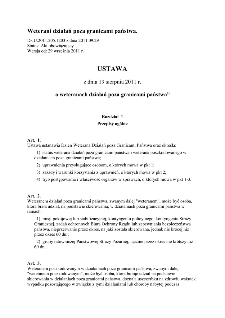 Weterani działań poza granicami państwa. Dz.U.2011.205.1203 z dnia 2011.09.29 Status: Akt obowiązujący Wersja od: 29 września 2011 r. USTAWA z dnia 19 sierpnia 2011 r. o weteranach działań poza granicami państwa1) Rozdział 1 Przepisy ogólne Art. 1. Ustawa ustanawia Dzień Weterana Działań poza Granicami Państwa oraz określa: 1) status weterana działań poza granicami państwa i weterana poszkodowanego w działaniach poza granicami państwa; 2) uprawnienia przysługujące osobom, o których mowa w pkt 1; 3) zasady i warunki korzystania z uprawnień, o których mowa w pkt 2; 4) tryb postępowania i właściwość organów w sprawach, o których mowa w pkt 1-3. Art. 2. Weteranem działań poza granicami państwa, zwanym dalej "weteranem", może być osoba, która brała udział, na podstawie skierowania, w działaniach poza granicami państwa w ramach: 1) misji pokojowej lub stabilizacyjnej, kontyngentu policyjnego, kontyngentu Straży Granicznej, zadań ochronnych Biura Ochrony Rządu lub zapewniania bezpieczeństwa państwa, nieprzerwanie przez okres, na jaki została skierowana, jednak nie krócej niż przez okres 60 dni; 2) grupy ratowniczej Państwowej Straży Pożarnej, łącznie przez okres nie krótszy niż 60 dni. Art. 3. Weteranem poszkodowanym w działaniach poza granicami państwa, zwanym dalej "weteranem poszkodowanym", może być osoba, która biorąc udział na podstawie skierowania w działaniach poza granicami państwa, doznała uszczerbku na zdrowiu wskutek wypadku pozostającego w związku z tymi działaniami lub choroby nabytej podczas wykonywania zadań lub obowiązków służbowych poza granicami państwa, z tytułu których przyznano jej świadczenia odszkodowawcze. Art. 4. Określenia użyte w ustawie oznaczają: 1) skierowanie - skierowanie, wyznaczenie, delegowanie, zatrudnienie przez: a) Ministra Obrony Narodowej albo właściwy organ wojskowy, b) organizację międzynarodową, za zgodą Ministra Obrony Narodowej, c) Szefa Służby Kontrwywiadu Wojskowego, d) Szefa Służby Wywiadu Wojskowego, e) Szefa Agencji Bezpieczeństwa Wewnętrznego, f) Szefa Agencji Wywiadu, g) Komendanta Głównego Policji, h) Komendanta Głównego Straży Granicznej, i) Szefa Biura Ochrony Rządu, j) Komendanta Głównego Państwowej Straży Pożarnej; 2) działania poza granicami państwa - działania podjęte poza granicami państwa w ramach misji pokojowej lub stabilizacyjnej, kontyngentu policyjnego, kontyngentu Straży Granicznej, zadań ochronnych Biura Ochrony Rządu, zapewniania bezpieczeństwa państwa oraz grupy ratowniczej Państwowej Straży Pożarnej; 3) misja pokojowa lub stabilizacyjna - działania określone w art. 2 pkt 1 ustawy z dnia 17 grudnia 1998 r. o zasadach użycia lub pobytu Sił Zbrojnych Rzeczypospolitej Polskiej poza granicami państwa (Dz. U. Nr 162, poz. 1117, z późn. zm.2)) oraz inne działania o tym charakterze podejmowane przez organizacje międzynarodowe, w których uczestniczyli obywatele polscy skierowani przez podmioty, o których mowa w pkt 1 lit. a-f, w szczególności działania mające na celu utrzymanie lub przywrócenie pokoju, bądź akcje zapobiegania aktom terroryzmu lub ich skutkom; 4) kontyngent policyjny - kontyngent wydzielony w celu realizacji zadań, o których mowa w art. 145a ust. 1 pkt 1-3 ustawy z dnia 6 kwietnia 1990 r. o Policji (Dz. U. z 2007 r. Nr 43, poz. 277, z późn. zm.3)) oraz byłą Polską Grupę Policyjną; 5) kontyngent Straży Granicznej - kontyngent wydzielony w celu realizacji zadań, o których mowa w art. 147c pkt 1-3a ustawy z dnia 12 października 1990 r. o Straży Granicznej (Dz. U. z 2011 r. Nr 116, poz. 675, Nr 117, poz. 677, Nr 170, poz. 1015 i Nr 171, poz. 1016); 6) zadania ochronne Biura Ochrony Rządu - zadania służbowe wykonywane na terytorium państw w całości lub w części uznanych za strefę działań wojennych oraz państw, o których mowa w przepisach wydanych na podstawie art. 60a ust. 2 ustawy z dnia 16 marca 2001 r. o Biurze Ochrony Rządu (Dz. U. z 2004 r. Nr 163, poz. 1712, z późn. zm.4)); 7) zapewnianie bezpieczeństwa państwa - zadania, o których mowa w art. 5 ust. 1 pkt 2 i w art. 6 ust. 1 pkt 2, 5 i 7 ustawy z dnia 24 maja 2002 r. o Agencji Bezpieczeństwa Wewnętrznego oraz Agencji Wywiadu (Dz. U. z 2010 r. Nr 29, poz. 154, z późn. zm.5)), a także art. 5 ust. 1 i 2 oraz art. 6 ust. 1 pkt 1-4 ustawy z dnia 9 czerwca 2006 r. o Służbie Kontrwywiadu Wojskowego oraz Służbie Wywiadu Wojskowego (Dz. U. Nr 104, poz. 709, z późn. zm.6)), wykonywane na terytorium państw w całości lub w części uznanych za strefę działań wojennych odpowiednio przez funkcjonariuszy Agencji Bezpieczeństwa Wewnętrznego oraz Agencji Wywiadu lub przez funkcjonariuszy i żołnierzy Służby Kontrwywiadu Wojskowego oraz Służby Wywiadu Wojskowego; 8) grupa ratownicza Państwowej Straży Pożarnej - grupę utworzoną do wykonywania zadań, o których mowa w art. 49b ust. 1 pkt 1 ustawy z dnia 24 sierpnia 1991 r. o Państwowej Straży Pożarnej (Dz. U. z 2009 r. Nr 12, poz. 68, z późn. zm.7)); 9) organizacja międzynarodowa - Organizację Narodów Zjednoczonych, Organizację Bezpieczeństwa i Współpracy w Europie, Organizację Traktatu Północnoatlantyckiego oraz Unię Europejską; 10) renta inwalidzka - rentę inwalidzką, wojskową rentę inwalidzką, policyjną rentę inwalidzką, rentę z tytułu niezdolności do pracy i rentę rolniczą z tytułu niezdolności do pracy, otrzymywane odpowiednio na podstawie ustawy z dnia 29 maja 1974 r. o zaopatrzeniu inwalidów wojennych i wojskowych oraz ich rodzin (Dz. U. z 2010 r. Nr 101, poz. 648 i Nr 113, poz. 745 oraz z 2011 r. Nr 112, poz. 654), ustawy z dnia 10 grudnia 1993 r. o zaopatrzeniu emerytalnym żołnierzy zawodowych oraz ich rodzin (Dz. U. z 2004 r. Nr 8, poz. 66, z późn. zm.8)), ustawy z dnia 18 lutego 1994 r. o zaopatrzeniu emerytalnym funkcjonariuszy Policji, Agencji Bezpieczeństwa Wewnętrznego, Agencji Wywiadu,
