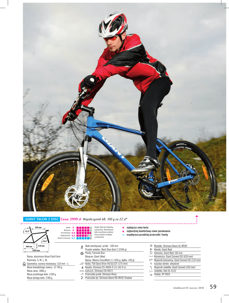 GIANT TALON 2 DISC Cena: 2999 zł Współczynnik bB: 100 g za 22 zł* 595 mm Jazda 5 Budowa 5 Amortyzacja 5,5 Opłacalność 4,2 Ocena końcowa 5,1 72.2° Uwaga! Tekst jest integralną częścią testu. Wnioskowanie tylko na podstawie punktacji może prowadzić do błędów w interpretacji najlepsza rama testu najbardziej komfortowy rower porównania współpraca przedniej przerzutki i korby 70.4° 420 mm 310 mm 1070 mm Rama: aluminium Aluxx Fluid Form Rozmiary: S, M, L, XL Geometria: rozmiar testowany: 510 mm - L Masa kompletnego roweru: 13 740 g Masa ramy: 1806 g Masa przedniego koła: 2100 g Masa tylnego koła: 2780 g Skok amortyzacji: przód - 100 mm Przedni widelec: Rock Shox Dart 2 (2394 g) Piasty: Formula Disc Obręcze: Giant (Alex) Opony: Maxxis CrossMark 2.1 (656 g, dętka: 140 g) Korby: FSA Dyna Drive 44/32/22T (175 mm) Kaseta: Shimano CS-HG50-9 (11-34) 9-rz. Łańcuch: Shimano CN-HG73 Przerzutka przód: Shimano Alivio Przerzutka tył: Shimano Deore RD-M592 Shadow Manetki: Shimano Deore SL-M590 Klamki: Giant Root Hamulce: Giant Root 160 mm Kierownica: Giant Connect OS (620 mm) Wspornik kierownicy: Giant Connect OS (110 mm) Łożyska sterów: aheadset Wspornik siodełka: Giant Connect (350 mm) Siodełko: Velo VL-4122 Pedały: VP-992S bi ke Boa r d # 3 ma r zec 2 010 59
