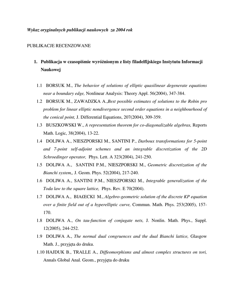 Wykaz oryginalnych publikacji naukowych za 2004 rok PUBLIKACJE RECENZOWANE 1. Publikacja w czasopi mie wyró nionym z listy filadelfijskiego Instytutu Informacji Naukowej 1.1 BORSUK M., The behavior of solutions of elliptic quasilinear degenerate equations near a boundary edge, Nonlinear Analysis: Theory Appl. 56(2004), 347-384. 1.2 BORSUK M., ZAWADZKA A.,Best possible estimates of solutions to the Robin pro problem for linear elliptic nondivergence second order equations in a neighbourhood of the conical point, J. Differential Equations, 207(2004), 309-359. 1.3 BUSZKOWSKI W., A representation theorem for co-diagonalizable algebras, Reports Math. Logic, 38(2004), 13-22. 1.4 DOLIWA A., NIESZPORSKI M., SANTINI P., Darboux transformations for 5-point and 7-point self-adjoint schemes and an integrable discretization of the 2D Schroedinger operator, Phys. Lett. A 323(2004), 241-250. 1.5 DOLIWA A., SANTINI P.M., NIESZPORSKI M., Geometric discretization of the Bianchi system,, J. Geom. Phys. 52(2004), 217-240. 1.6 DOLIWA A., SANTINI P.M., NIESZPORSKI M., Integrable generalization of the Toda law to the square lattice, Phys. Rev. E 70(2004). 1.7 DOLIWA A., BIA£ECKI M., Algebro-geometric solution of the discrete KP equation over a finite field out of a hyperelliptic curve, Commun. Math. Phys. 253(2005), 157170. 1.8 DOLIWA A., On tau-function of conjugate nets, J. Nonlin. Math. Phys., Suppl. 12(2005), 244-252. 1.9 DOLIWA A., The normal dual congruences and the dual Bianchi lattice, Glasgow Math. J., przyj ta do druku. 1.10 HAJDUK B., TRALLE A., Diffeomorphisms and almost complex structures on tori, Annals Global Anal. Geom., przyj ta do druku 1.11 KI LAK-MALINOWSKA A, Conjoinability in pregroups, Fundamenta Informaticae, 61(2004), 29-36. 1.12 MINKEVICH A.V., Problem of cosmological singularity and ist possible resolution, Internat. J. Modern Phys., przyj ta do druku 1.13 POLKOWSKI L., SEMENIUK-POLKOWSKA M.,Some remarks on sets of commuting sequential processes in topological rough set framework, Fundamenta Informaticae, 60(2004), 291-305. 1.14 POLKOWSKI L., A note on 3-valued rough logic accepting decision rules, Fundamenta Informaticae, 61 (2004), 37-45. 1.15 POLKOWSKI L., Rough mereology as a link between rough and fuzzy sets theories. A survey, in: Rough Sets and Fuzzy sets: Transactions on Rough Sets, vol. 2, Lect. Notes Comp. Sci., 3135, Springer, 2004, 253-277. 1.16 POLKOWSKI L., First steps toward computability-infinite information systems, in: Rough Sets and Fuzzy sets: Transactions on Rough Sets, vol. 2, Lect. Notes Comp. Sci., 3135, Springer, 2004, 151-188. 1.17 POLKOWSKI L., Toward Rough set foundations. Mereological approach, in: Proc. 4th Internat. Conf. RSCTC 2004, Uppsala, Lect. Notes AI 3066, Springer, 2004, 8-25. 1.18 POLKOWSKI L., SEMENIUK-POLKOWSKA M., Sets of communicating sequential processes. A topological rough set framework, Proc. KES 2004, Lect. Notes AI, Springer, 2004, 779-785. 1.19 POLKOWSKI L., Mereological foundations to approximate reasoning, in: Monitoring, Security and Resque in Multiagent Systems, Springer, przyj ta do druku. 1.20 POLKOWSKI L., Rough mereology as the language for a minimalist mobile robot environment description, , in: Monitoring, Security and Resque in Multiagent Systems, Springer, przyj ta do druku. 1.21 RUTKOWSKI A., POSZWA A., Hydrogen atom in a strong magnetic field II. Relativistic corrections for law-lying excited states, Phys. Rev. A69(2004), 023403023409. 1.22 RUTKOWSKI A., KULLIE O., KOLB D., Two-spinor fully relativistic finite-element solution of the two-centre Coulomb problem, Chem. Phys. Lett. 383(2004),215-221. 1.23 RUTKOWSKI A., POSZWA A., Analytical solution for relativistic hydrogenic atom in static and uniform magnetic field, Physica Scripta, przyj ta do druku. 1.24 SCHMALZ G., EZHOV V., Non-linearizable CR-automorphisms, torsion free elliptic CR-manifolds and second order ODE, J. reine angew. Math., przyj ta do druku. 1.25 SCHMALZ G., SPIRO A., Explicit construction of a Chern-Moser connection for CRmanifolds of codimension 2, Annali Mat. Pura Appl., przyj ta do druku. 1.26 STARUCH B.,Extensions of partial structures and their applications to modeling of multiagent systems, in: Monitoring, Security and Rescue Tasks in Multiagent Systems, Adv. Soft Computing, Springer, 2004, przyj ta do druku. 1.27 SZUBIAKOWSKI, J., DALE. R.E., BOENS N., AMELOOT M., Identifiability analysis of models for reversible intermolecular two-state excited-state processes coupled with species-dependent rotational diffusion monitored by time-resolved fluorescence depolarizationt, J. Chem. Phys. 121(2004). 1.28 TRALLE A., IBANEZ R., K DRA J., RUDYAK Y. On fundamental groups of symplectically aspherical manifolds, Math. Zeitschrift. 248(2004), 805-826. 2. Publikacja w czasopi mie recenzowanym o zasi gu co najmniej krajowym w dziedzinie, dla której narz dziem opisu jest j zyk etniczny, a przedmiotem badania s teksty kultury w tym j zyku tworzonej. 3. Publikacja w innym recenzowanym czasopi mie zagranicznym lub czasopi mie polskim o zasi gu co najmniej krajowym. 3.1 BŁASZKIEWICZ Ł., KUS A.J., The 12.2 GHz survey towards 6.7GHz methanol masers. The comparison of 12.2 GHz and 6.7 GHz spectra, Astronomy&Astrophysics 413(2004), 213. 3.2 BŁASZKIEWICZ Ł., KUS A.J. The 12.2 GHz methanol survey towards star forming sites, Baltic Astronomy, 13(2004), 474-477. 3.3 BULI SKA M., The Pentus theorem for the Lambek calculus with simple nonlogical axioms, Studia Logica, przyj ta do druku. 3.4 BUSZKOWSKI W., Lambek calculus with nonlogical axioms, in: language and Grammar. Studies in mathematical Linguistics and Natural Language. C Casadio, R. Seeley, P. Scott (eds.) CSLI, Stanford, 2004, 77-92. 3.5 DYMNIKOWA I., Regular electrically charged vacuum structures with de Sitter center in nonlinear electrodynamics coupled to general relativity, Classical and Quantum Gravity 21(2004), 4417-4428. 3.6 DYMNIKOWA I., Cosmological term, mass, and space-time symmetry, in: Beyond th