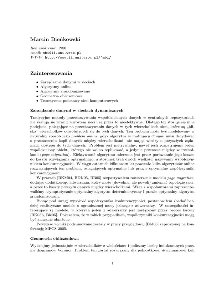Marcin Bieńkowski Rok urodzenia: 1980 email: [email protected] WWW: http://www.ii.uni.wroc.pl/~mbi/ Zainteresowania • • • • • Zarządzanie danymi w sieciach Algorytmy online Algorytmy zrandomizowane Geometria obliczeniowa Teoretyczne podstawy sieci komputerowych Zarządzanie danymi w sieciach dynamicznych Tradycyjne metody przechowywania współdzielonych danych w centralnych repozytoriach nie skalują się wraz z wzrostem sieci i są przez to nieefektywne. Dlatego też stosuje się inne podejście, polegające na przechowywaniu danych w tych wierzchołkach sieci, które są „blisko” wierzchołków odwołujących się do tych danych. Ten problem może być modelowany w naturalny sposób jako problem online, gdyż algorytm zarządzający danymi musi decydować o przenoszeniu kopii danych między wierzchołkami, nie mając wiedzy o przyszłych żądaniach dostępu do tych danych. Problem jest nietrywialny, nawet jeśli rozpatrujemy jeden współdzielony obiekt, którego nie wolno replikować, a jedynie przenosić między wierzchołkami (page migration). Efektywność algorytmu mierzona jest przez porównanie jego kosztu do kosztu rozwiązania optymalnego, a stosunek tych dwóch wielkości nazywamy współczynnikiem konkurencyjności. W ciągu ostatnich kilkunastu lat powstało kilka algorytmów online rozwiązujących ten problem, osiągających optymalne lub prawie optymalne współczynniki konkurencyjności. W pracach [BKM04, BDK05, BB05] rozpatrywałem rozszerzenie modelu page migration, dodając dodatkowego adwersarza, który może (dowolnie, ale powoli) zmieniać topologię sieci, a przez to koszty przesyłu danych między wierzchołkami. Wraz z współautorami zaprezentowaliśmy asymptotycznie optymalny algorytm deterministyczny i prawie optymalny algorytm zrandomizowany. Biorąc pod uwagę wysokość współczynnika konkurencyjności, postanowiłem zbadać bardziej realistyczne modele o ograniczonej mocy jednego z adwersarzy. W szczególności interesujące są modele, w których jeden z adwersarzy jest zastąpiony przez proces losowy [BK05b, Bie05]. Pokazałem, że w takich przypadkach, współczynniki konkurencyjności mogą być znacznie obniżone. Powyższe wyniki podsumowane zostały w pracy przeglądowej [BM05] zaproszonej na konferencję MFCS 2005. Geometria obliczeniowa Wylosujmy jednostajnie n wierzchołków z wielościanu i policzmy liczbę indukowanych przez nie diagramów Voronoi. Problem ten został rozwiązany dla jednostkowej d-wymiarowej kuli 1 (Dwyer, 1991); okazało się, że oczekiwana liczba diagramów wynosi O(n). Od tego czasu choć przypuszczano, że to górne ograniczenie jest prawdziwe również dla dowolnego wypukłego wielościanu, nikt nie podał jednak formalnego dowodu. W pracy [BDMS05] pokazaliśmy, że ograniczenie O(n) zachodzi również dla d-wymiarowej hiperkostki. Teoretyczne podstawy sieci komputerowych W pracach [BKM05, BK05a] wspólnie z Mirosławem Korzeniowskim zajmowaliśmy się równoważeniem obciążenia w sieciach peer-to-peer, bazujących na topologii pierścienia i na mechanizmie consistent hashing (takich jak np. Chord). Podczas działania takiego dynamicznego systemu mogą pojawiać się nowe wierzchołki, a obecne wierzchołki mogą opuszczać sieć, co nieuchronnie prowadzi do nierównego obciążenia wierzchołków przechowywanymi w nich danymi. Pokazaliśmy prosty, całkowicie rozproszony algorytm, który z dużym prawdopodobieństwem równoważy obciążenie wierzchołków takiego systemu w stałej liczbie rund, niezależnie od jego stanu początkowego. Zajmowałem się też algorytmami routingu w ogólnych niezorganizowanych sieciach. Pokazałem, razem ze współautorami [BKR03], że pewien prawie optymalny rozproszony schemat routingu (Räcke, 2002) da się skonstruować w czasie wielomianowym. Wykształcenie od 10.2005 Instytut Informatyki, Uniwersytet Wrocławski. Adiunkt w Zakładzie Złożoności Obliczeniowej i Analizy Algorytmow. 10.2002–09.2005 International Graduate School Dynamic Intelligent Systems i Wydział Elektrotechniki, Informatyki i Matematyki Uniwersytetu w Paderborn. 3-letnie studia doktoranckie; wykonawca grantu DFG Collaborative Research Centre 376 „Massively Parallel Computing - Algorithms, Design Methods, Applications”, podprojekt A2: Universal Basic Services. Rozprawa doktorska Page Migration in Dynamic Networks z wyróżnieniem (promotor: Friedhelm Meyer auf der Heide). 10.2000–07.2001 Uniwersytet w Paderborn, Niemcy. Roczne studia informatyczne w ramach stypendium Sokrates/Erasmus. 10.1997–06.2002 Instytut Informatyki, Uniwersytet Wrocławski. 5-letnie studia magisterskie. Praca dyplomowa Badanie symetryczności funkcji boolowskich (promotor: Krzysztof Loryś). 1993–1997 XIV Liceum Ogólnokształcące, Wrocław. Ukończone ze złotym medalem. Laureat Olimpiady Matematycznej, Olimpiad Fizycznych, finalista z wyróżnieniem Olimpiady Informatycznej. Lista publikacji [BB05] Marcin Bieńkowski and Jarosław Byrka. Bucket game with applications to set multicover and dynamic page migration. In Proc. of the 13th European Symp. on Algorithms (ESA), pages 815–826, 2005. LNCS 3669. 2 [BBKO05] Marcin Bieńkowski, André Brinkmann, Mirosław Korzeniowski, and Orhan Orhan. Cube connected cycles based bluetooth scatternet formation. In Proc. of the 4th Int. Conference on Networking (ICN), pages 413–420, 2005. LNCS 3420. [BDK05] Marcin Bieńkowski, Mirosław Dynia, and Mirosław Korzeniowski. Improved algorithms for dynamic page migration. In Proc. of the 22nd Symp. on Theoretical Aspects of Computer Science (STACS), pages 365–376, 2005. LNCS 3404. [BDMS05] Marcin Bieńkowski, Valentina Damerow, Friedhelm Meyer auf der Heide, and Christian Sohler. Average case complexity of voronoi diagrams of n sites from the unit cube. In Proc. of the 21st European Workshop on Computational Geometry (EWCG), pages 167–170, 2005. [Bie05] Marcin Bieńkowski. Dynamic page migration with stochastic re