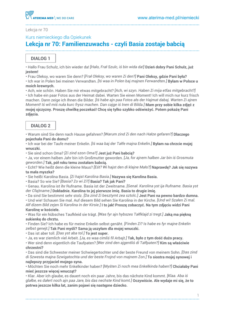 www.aterima-med.pl/niemiecki Lekcja nr 70 Kurs niemieckiego dla Opiekunek Lekcja nr 70: Familienzuwachs - czyli Basia zostaje babcią DIALOG 1 • Hallo Frau Schulz, ich bin wieder da! [Halo, Frał Szulc, iś bin wida da!] Dzień dobry Pani Schulz, już jestem! • Frau Oleksy, wo waren Sie denn? [Frał Oleksy, wo waren Zi den?] Pani Oleksy, gdzie Pani była? • Ich war in Polen bei meinen Verwandten. [Iś waa in Polen baj majnen Ferwandten.] Byłam w Polsce u moich krewnych. • Ach, wie schön. Haben Sie mir etwas mitgebracht? [Ach, wi szyn. Haben Zi mija etfas mitgebracht?] • Ich habe ein paar Fotos aus der Heimat dabei. Warten Sie einen Moment! Ich will mich nur kurz frisch machen. Dann zeige ich Ihnen die Bilder. [Iś habe ajn paa Fotos ałs der Hajmat dabaj. Warten Zi ajnen Moment! Iś wil miś nuła kurc frysz machen. Dan cajge iś Inen di Bilda.] Mam przy sobie kilka zdjęć z mojej ojczyzny. Proszę chwilkę poczekać! Chcę się tylko szybko odświeżyć. Potem pokażę Pani zdjęcia. DIALOG 2 • Warum sind Sie denn nach Hause gefahren? [Warum zind Zi den nach Hałze gefaren?] Dlaczego pojechała Pani do domu? • Ich war bei der Taufe meiner Enkelin. [Iś waa baj der Tałfe majna Enkelin.] Byłam na chrzcie mojej wnuczki. • Sie sind schon Oma? [Zi zind szon Oma?] Jest już Pani babcią? • Ja, vor einem halben Jahr bin ich Großmutter geworden. [Ja, for ajnem halben Jar bin iś Grosmuta geworden.] Tak, pół roku temu zostałam babcią. • Echt? Wie heißt denn die kleine Maus? [Eśt? Wi hajst den di klajne Małs?] Naprawdę? Jak się nazywa ta mała myszka? • Sie heißt Karolina Basia. [Zi hajst Karolina Basia.] Nazywa się Karolina Basia. • Basia? So wie Sie? [Basia? Zo wi Zi?] Basia? Tak jak Pani? • Genau. Karolina ist ihr Rufname. Basia ist der Zweitname. [Genał. Karolina yst ija Rufname. Basia yst der Cfajtname.] Dokładnie. Karolina to jej pierwsze imię. Basia to drugie imię. • Da sind Sie bestimmt sehr stolz. [Da zind Zi besztymt zea sztolc.] Jest Pani na pewno bardzo dumna. • Und wie! Schauen Sie mal. Auf diesem Bild sehen Sie Karolina in der Kirche. [Und wi! Szałen Zi mal. Ałf dizem Bild zejen Si Karolina in der Kirsie.] I to jak! Proszę zobaczyć. Na tym zdjęciu widzi Pani Karolinę w kościele. • Was für ein hübsches Taufkleid sie trägt. [Was fyr ajn hybszes Tałfklajd zi tregt.] Jaką ma piękną sukienkę do chrztu. • Finden Sie? Ich habe es für meine Enkelin selbst genäht. [Finden Zi? Is habe es fyr majne Enkelin zelbst genejt.] Tak Pani myśli? Sama ją uszyłam dla mojej wnuczki. • Das ist aber toll. [Das yst aba tol.] To jest super. • Ja, es war ziemlich viel Arbeit. [Ja, es waa cimliś fil Arbajt.] Tak, było z tym dość dużo pracy. • Wer sind denn eigentlich die Taufpaten? [Wer zind den ajgentliś di Tałfpaten?] Kim są właściwie chrzestni? • Das sind die Schwester meiner Schwiegertochter und der beste Freund von meinem Sohn. [Das zind di Szwesta majna Szwigatochta und der beste Frojnd von majnem Zon.] To siostra mojej synowej i najlepszy przyjaciel mojego syna. • Möchten Sie noch mehr Enkelkinder haben? [Myśten Zi noch mea Enkelkinda haben?] Chciałaby Pani mieć jeszcze więcej wnucząt? • Klar. Aber ich glaube, es dauert noch ein paar Jahre, bis das nächste Kind kommt. [Klaa. Aba iś glałbe, es dałert noch ajn paa Jare, bis das nechste Kind komt.] Oczywiście. Ale wydaje mi się, że to potrwa jeszcze kilka lat, zanim pojawi się następne dziecko. 1 www.aterima-med.pl/niemiecki • Warum? [Warum?] Dlaczego? • Meine Schwiegertochter möchte gern noch zwei Kinder. Mein Sohn ist mit einem zufrieden. Das ist schon genug Stress für ihn. [Majne Szwigatochta myśte gern noch cfaj Kinda. Majn Zon yst mit ajnem cufriden. Das yst szon genug Sztres fyr in.] Moja synowa chciałaby mieć jeszcze dwójkę dzieci. Mój syn jest zadowolony z jednego. To dla niego i tak wystarczający stres. • Ja, das kann ich verstehen. [Ja, das kan iś fersztejen.] Tak, mogę to zrozumieć. DIALOG 3 • Wie ist denn das in Deutschland? Sind die Familien eher groß oder eher klein? [Wi yst den das in Dojczland? Zind di Familjen eja gros oda klajn?] A jak to jest w Niemczech? Rodziny są raczej większe czy mniejsze? • Die jungen Leute bekommen heute sehr spät Nachwuchs. Oft erst mit 30 oder 35. [Di jungen Lojte bekomen hojte zea szpejt Nachwuks. Oft erst mit drajsyś oda fynfunddrajsyś.] Młodzi ludzie mają teraz potomstwo bardzo późno. Często w wieku 30 lub 35 lat. • Echt? Warum ist das so? [Eśt? Warum yst das zo?] Naprawdę? Dlaczego tak? • Ich habe gehört, die meisten wollen erst studieren, reisen, Karriere machen. [Iś habe gehyrt, di majsten wolen erst sztudiren, rajzen, Karjere machen.] Słyszałam, że większość chce najpierw studiować, podróżować, zrobić karierę. • Die Kinderplanung muss also warten. [Di Kindaplanung mus alzo warten.] Planowanie dzieci musi więc poczekać. • Stimmt. Viele Paare bleiben sogar kinderlos. [Sztymt. File Paare blajben zoga kindalos.] Zgadza się. Wiele par pozostaje nawet bezdzietne. • In einer Zeitung habe ich neulich gelesen, dass immer mehr junge deutsche Paare gar nicht heiraten wollen. [In ajna Cajtung habe iś nojliś gelejzen, das yma mea junge dojcze Paare gaa niśt hajraten wolen.] Czytałam niedawno w gazecie, że coraz więcej młodych niemieckich par nie chce się w ogóle pobierać. • Richtig. Sie leben dann zusammen, aber halt ohne Trauschein. [Ryśtyś. Zi lejben dan cuzamen, aba halt one Trałszajn.] Zgadza się. Żyją razem, ale bez aktu ślubu. • Naja, jeder muss seinen eigenen Weg finden, nicht wahr? [Naja, jeda mus zajnen ajgenen Weg finden, niśt waa?] No tak, każdy musi odnaleźć swoją własną drogę, nieprawdaż? • Ich denke auch. So, aber jetzt zeigen Sie mir bitte noch mehr Fotos von Ihrer Familie. [Iś denke ałch. Zo, aba ject cajgen Zi mija byte mea Fotos fon Ira Familje.] Też tak myślę. No, ale teraz proszę pokazać m