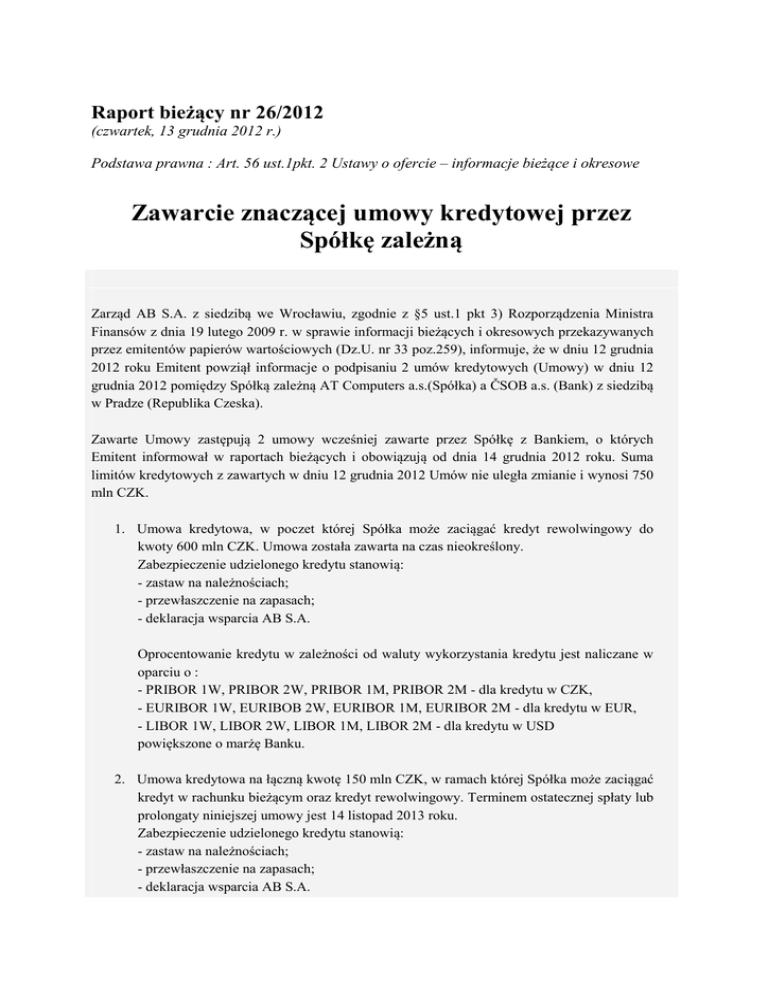 Raport bieżący nr 26/2012 (czwartek, 13 grudnia 2012 r.) Podstawa prawna : Art. 56 ust.1pkt. 2 Ustawy o ofercie – informacje bieżące i okresowe Zawarcie znaczącej umowy kredytowej przez Spółkę zależną Zarząd AB S.A. z siedzibą we Wrocławiu, zgodnie z §5 ust.1 pkt 3) Rozporządzenia Ministra Finansów z dnia 19 lutego 2009 r. w sprawie informacji bieżących i okresowych przekazywanych przez emitentów papierów wartościowych (Dz.U. nr 33 poz.259), informuje, że w dniu 12 grudnia 2012 roku Emitent powziął informacje o podpisaniu 2 umów kredytowych (Umowy) w dniu 12 grudnia 2012 pomiędzy Spółką zależną AT Computers a.s.(Spółka) a ČSOB a.s. (Bank) z siedzibą w Pradze (Republika Czeska). Zawarte Umowy zastępują 2 umowy wcześniej zawarte przez Spółkę z Bankiem, o których Emitent informował w raportach bieżących i obowiązują od dnia 14 grudnia 2012 roku. Suma limitów kredytowych z zawartych w dniu 12 grudnia 2012 Umów nie uległa zmianie i wynosi 750 mln CZK. 1. Umowa kredytowa, w poczet której Spółka może zaciągać kredyt rewolwingowy do kwoty 600 mln CZK. Umowa została zawarta na czas nieokreślony. Zabezpieczenie udzielonego kredytu stanowią: - zastaw na należnościach; - przewłaszczenie na zapasach; - deklaracja wsparcia AB S.A. Oprocentowanie kredytu w zależności od waluty wykorzystania kredytu jest naliczane w oparciu o : - PRIBOR 1W, PRIBOR 2W, PRIBOR 1M, PRIBOR 2M - dla kredytu w CZK, - EURIBOR 1W, EURIBOB 2W, EURIBOR 1M, EURIBOR 2M - dla kredytu w EUR, - LIBOR 1W, LIBOR 2W, LIBOR 1M, LIBOR 2M - dla kredytu w USD powiększone o marżę Banku. 2. Umowa kredytowa na łączną kwotę 150 mln CZK, w ramach której Spółka może zaciągać kredyt w rachunku bieżącym oraz kredyt rewolwingowy. Terminem ostatecznej spłaty lub prolongaty niniejszej umowy jest 14 listopad 2013 roku. Zabezpieczenie udzielonego kredytu stanowią: - zastaw na należnościach; - przewłaszczenie na zapasach; - deklaracja wsparcia AB S.A. Oprocentowanie kredytu w zależności od waluty wykorzystania kredytu jest naliczane w oparciu o : - PRIBOR 1W, PRIBOR 2W, PRIBOR 1M, PRIBOR 2M - dla kredytu w CZK, - EURIBOR 1W, EURIBOB 2W, EURIBOR 1M, EURIBOR 2M - dla kredytu w EUR, - LIBOR 1W, LIBOR 2W, LIBOR 1M, LIBOR 2M - dla kredytu w USD powiększone o marżę Banku. Pozostałe zapisy Umów nie odbiegają od standardowych zapisów stosowanych dla tego typu umów. Kryterium uznania umowy za znaczącą jest wartość kredytu, która przekracza równowartość 10% kapitałów własnych Emitenta.