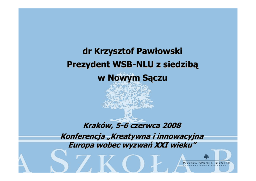 dr Krzysztof Pawłowski Prezydent WSB-NLU z siedzibą w Nowym Sączu Kraków, 5-6 czerwca 2008 Konferencja „Kreatywna i innowacyjna Europa wobec wyzwań XXI wieku” Czy Polska weźmie udział w rozwoju kreatywnej i innowacyjnej Europy? scenariusz pesymistyczny Kraków, 5-6 czerwca 2008 Konferencja „Kreatywna i innowacyjna Europa wobec wyzwań XXI wieku” Pierwszy raz występuję kreśląc scenariusz pesymistyczny – jestem urodzonym optymistą ! ☺ Kraków, 5-6 czerwca 2008 Konferencja „Kreatywna i innowacyjna Europa wobec wyzwań XXI wieku” 3 Zawartość 1. „Stan posiadania” na rok 2008 pozycja wyjściowa z roku 1989 gospodarka nauka i szkolnictwa wyższe zaniechania i błędy rządowe 2. Czy Polska potrafi wykorzystać Strategię Lizbońską i środki UE na okres 2007-2013 3. Społeczeństwo informacyjne – szansa dla Polski 4. Uwagi zgorzkniałego innowatora Kraków, 5-6 czerwca 2008 Konferencja „Kreatywna i innowacyjna Europa wobec wyzwań XXI wieku” 4 Pozycja wyjściowa 1989 opóźnienia cywilizacyjne i technologiczne związane z utratą 50 lat normalnego rozwoju (gdzie obecnie są Włochy i Hiszpania nasi „towarzysze” w rankingach z lat 30-tych XX wieku ?) największe oszustwo władzy komunistycznej „wykształcone polskie społeczeństwo” w zderzeniu z faktami struktura polskiej gospodarki z dominującą pozycją przemysłu ciężkiego i surowcowego Kraków, 5-6 czerwca 2008 Konferencja „Kreatywna i innowacyjna Europa wobec wyzwań XXI wieku” Mamy rok 2008 to już 19 lat od początku transformacji szkoda czasu na próbę wytłumaczenia naszych słabości poprzez dziedzictwo czasów komunistycznych Jak wypadamy w porównaniu z dokonaniami Polaków w ciągu XX-lecia międzywojennego 1919-1939 ? Kraków, 5-6 czerwca 2008 Konferencja „Kreatywna i innowacyjna Europa wobec wyzwań XXI wieku” GOSPODARKA z perspektywy zwiększenia kreatywności i innowacyjności 1. Zachłyśnięcie się polityków organicznym wzrostem gospodarki I okresu transformacji (rozwojem gospodarki prywatnej, głównie handlu wynikającego z usunięcia ograniczeń, zakazów itp.) taki wzrost jest „płytki”, Kraków, 5-6 czerwca 2008 Konferencja „Kreatywna i innowacyjna Europa wobec wyzwań XXI wieku” 7 GOSPODARKA z perspektywy zwiększenia kreatywności i innowacyjności 2. Rozwój gospodarczy stymulowany inwestycjami zewnętrznymi i przejęciami związanymi z transferem do Polski gotowych rozwiązań technicznych i organizacyjnych (tzw. innowacji nietechnologicznych), 3. Bardzo częsta likwidacja przez zewnętrznych inwestorów zakładowych ośrodków badawczo-rozwojowych w prywatyzowanych przedsiębiorstwach, Kraków, 5-6 czerwca 2008 Konferencja „Kreatywna i innowacyjna Europa wobec wyzwań XXI wieku” 8 GOSPODARKA z perspektywy zwiększenia kreatywności i innowacyjności 4. Brak mechanizmów motywujących do inwestycji proinnowacyjnych oraz do wdrażania osiągnięć naukowych do przedsiębiorstw, 5. Bardzo silne i jednostronne uzależnienie polskiej gospodarki od kapitału zagranicznego (70% eksportu pochodzi z firm zagranicznych!), Kraków, 5-6 czerwca 2008 Konferencja „Kreatywna i innowacyjna Europa wobec wyzwań XXI wieku” GOSPODARKA z perspektywy zwiększenia kreatywności i innowacyjności 6. Brak (kompletny) polityki rządowej wzmacniającej polskie firmy rodzinne (których rozwój gwarantuje stabilny, długoterminowy wzrost PKB), Kraków, 5-6 czerwca 2008 Konferencja „Kreatywna i innowacyjna Europa wobec wyzwań XXI wieku” GOSPODARKA z perspektywy zwiększenia kreatywności i innowacyjności 7. Brak instytucji ułatwiających i przyspieszających efekt transferu wiedzy, technologii i innowacji z nauki do firm w rezultacie: bardzo niski wskaźnik innowacyjności polskiej gospodarki bardzo niski wskaźnik kapitału intelektualnego polskiej gospodarki, Kraków, 5-6 czerwca 2008 Konferencja „Kreatywna i innowacyjna Europa wobec wyzwań XXI wieku” Nauka i szkolnictwo wyższe z perspektywy zwiększenia kreatywności i innowacyjności 1. Środowisko akademickie po 1989 zostało pozostawione sobie przy uzyskaniu pełnej autonomii, więc zachłysnęło się wolnością i zajęło się tym co najłatwiejsze (a zarazem przynoszącym duże pieniądze) czyli kształceniem coraz liczniejszych roczników studentów badania naukowe zostawiając nielicznym fanatykom, Kraków, 5-6 czerwca 2008 Konferencja „Kreatywna i innowacyjna Europa wobec wyzwań XXI wieku” Nauka i szkolnictwo wyższe z perspektywy zwiększenia kreatywności i innowacyjności 2. Brak jakiejkolwiek rządowej polityki naukowej po 1990 r. aż do 2008 r. Pierwsza próba ingerencji państwa obudziła totalne oburzenie środowiska („zamach na autonomię akademicką”), 3. Rozdrobnienie instytucjonalne państwowych instytucji akademickich co powoduje małą efektywność pieniędzy przeznaczonych na badania i rozwój, Kraków, 5-6 czerwca 2008 Konferencja „Kreatywna i innowacyjna Europa wobec wyzwań XXI wieku” Nauka i szkolnictwo wyższe z perspektywy zwiększenia kreatywności i innowacyjności 4. Nie istniejący w Polsce sektor instytucji składający się na otoczenie biznesu zapewniające skuteczny transfer wiedzy, technologii i innowacji z nauki do gospodarki, Kraków, 5-6 czerwca 2008 Konferencja „Kreatywna i innowacyjna Europa wobec wyzwań XXI wieku” 14 Nauka i szkolnictwo wyższe z perspektywy zwiększenia kreatywności i innowacyjności 5. Gwarancja zatrudnienia w uczelniach i instytutach naukowych pracowników po habilitacji oraz brak uzależnienia płacy od wyników badań i ich wdrożeń do praktyki skutecznie osłabiająca osobistą motywację większości pracowników naukowych, Kraków, 5-6 czerwca 2008 Konferencja „Kreatywna i innowacyjna Europa wobec wyzwań XXI wieku” Nauka i szkolnictwo wyższe z perspektywy zwiększenia kreatywności i innowacyjności 6. Brak tradycji przechodzenia pracowników z przemysłu do nauki i odwrotnie, 7. Powolność kariery akadem